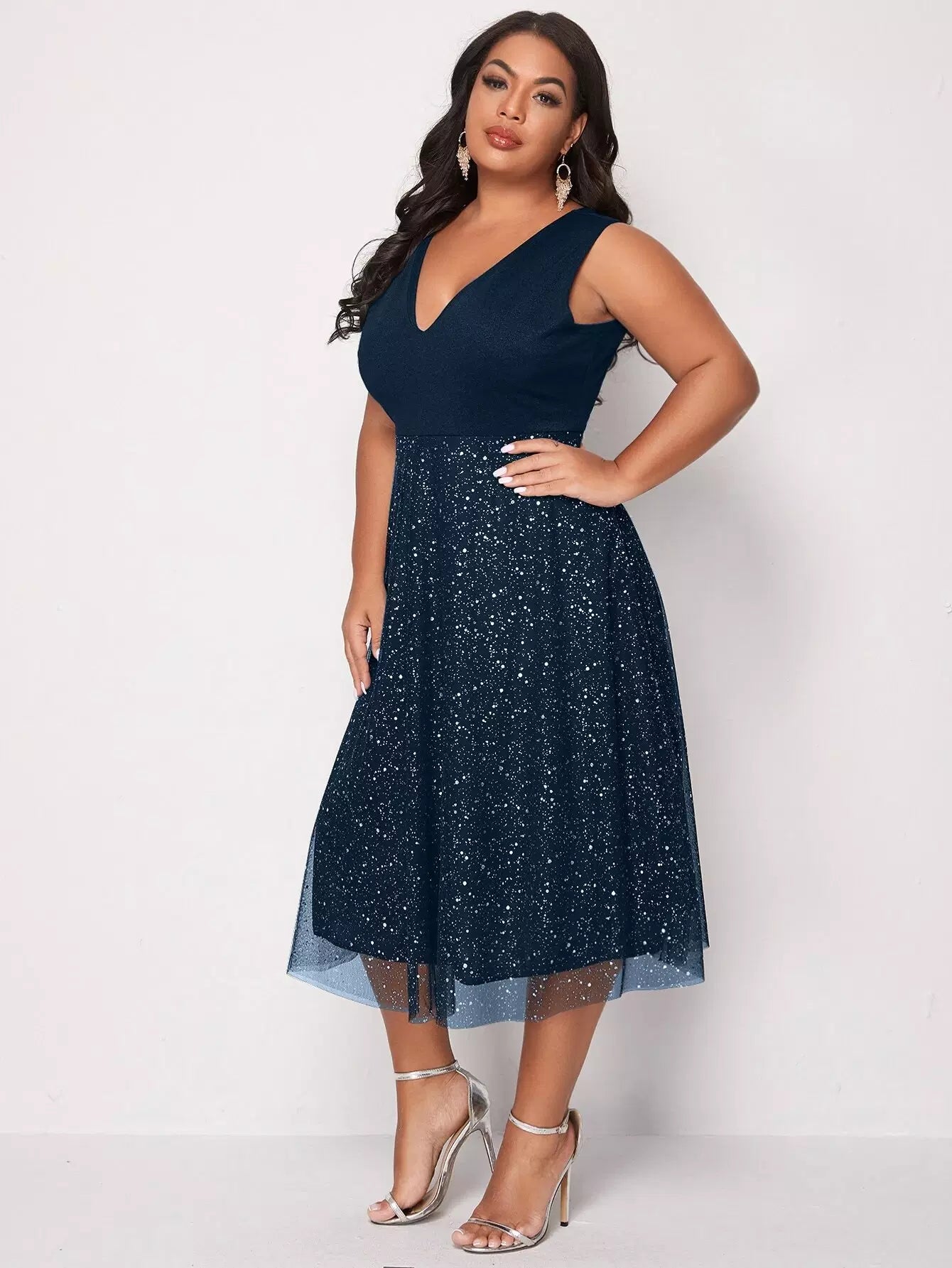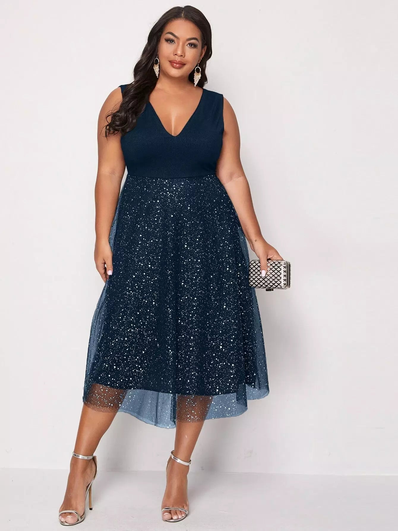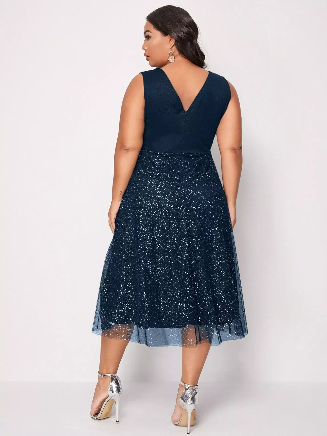 فستان ميدي شبكي متوسط الطول بياقة على شكل V مزدوجة بلون مغاير