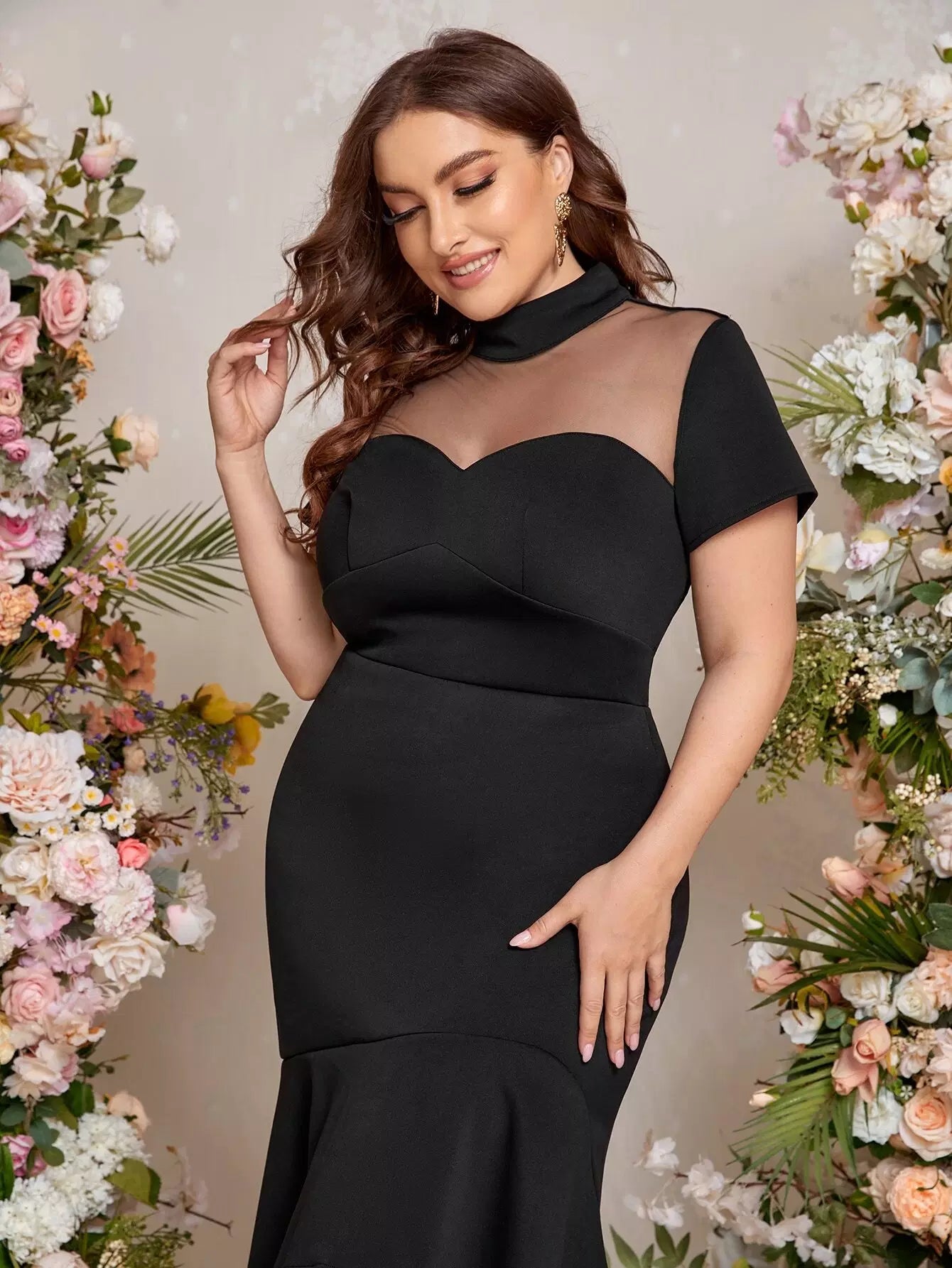 فستان وصيفة عروس بياقة شبكية عالية منخفضة زائد