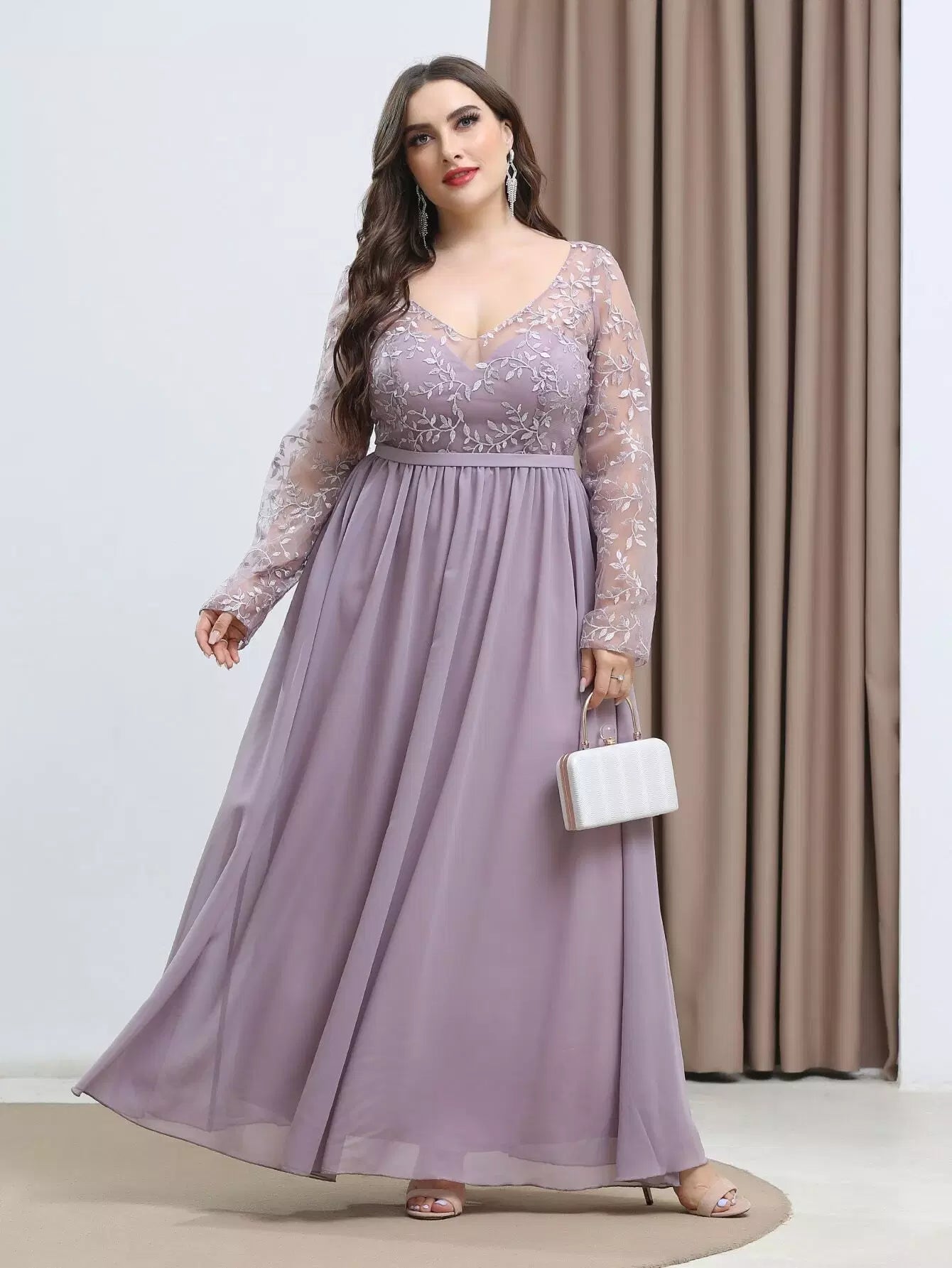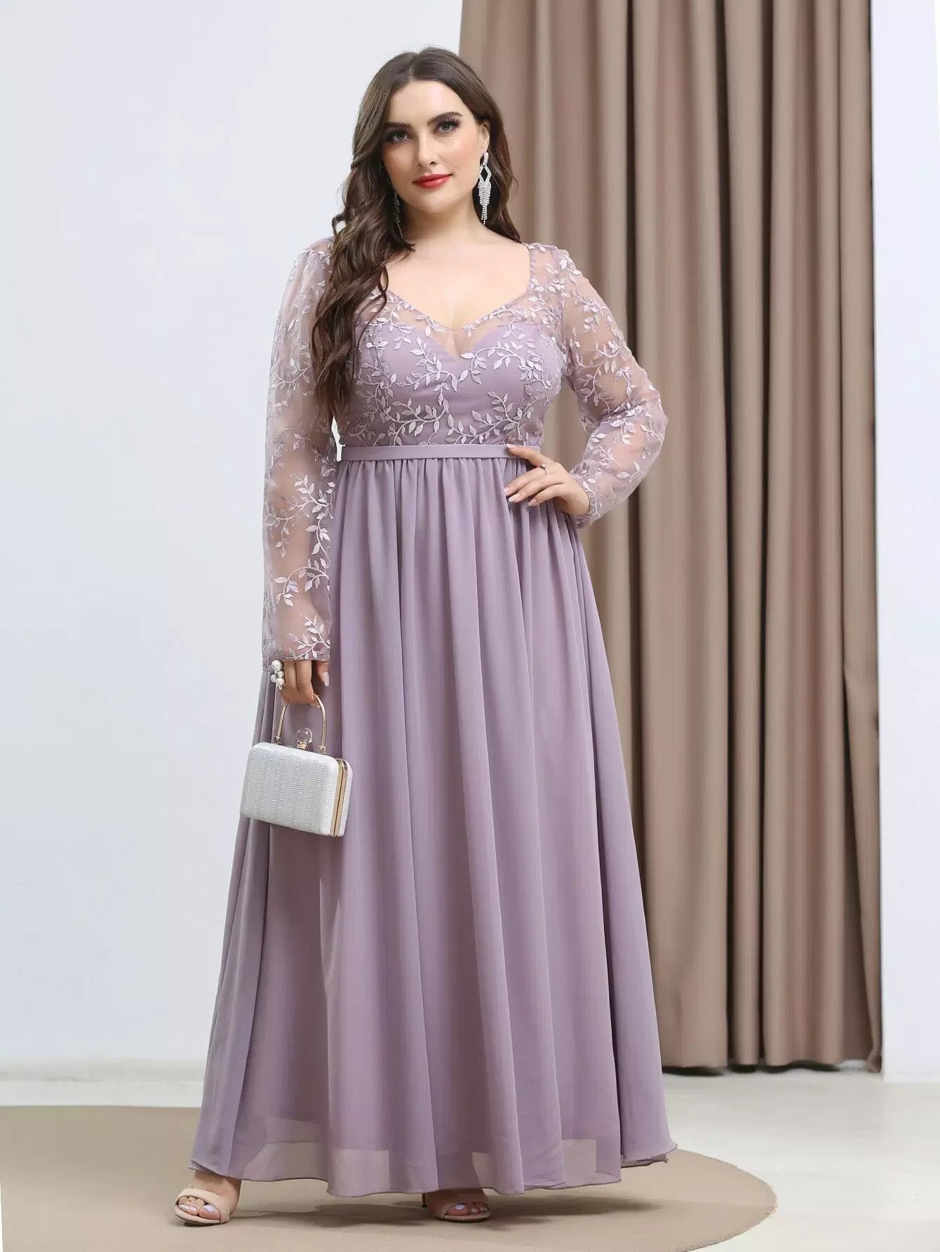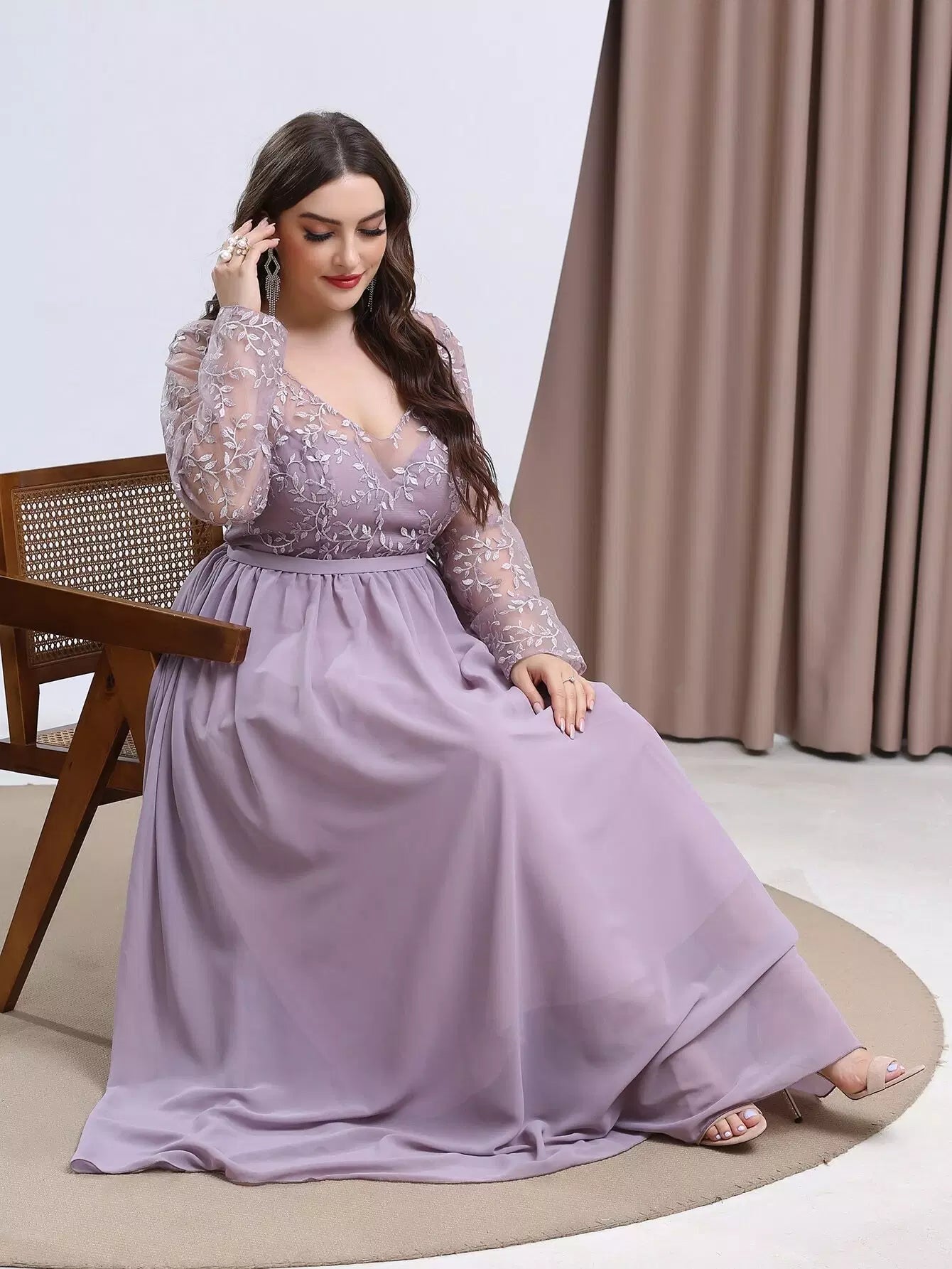 نحيف - مقاس كبير فستان شيفون مطرز بالنباتات