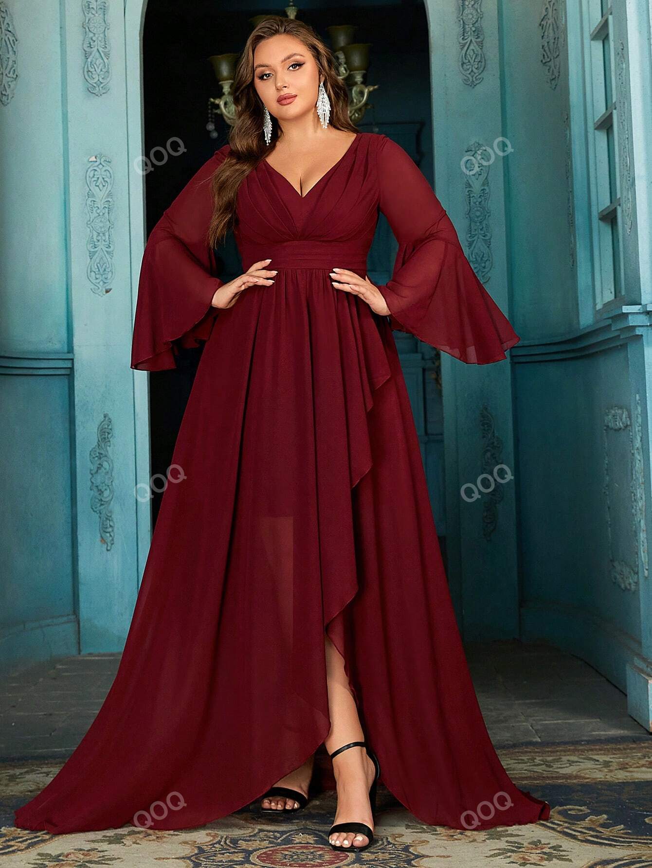 فستان زفاف بسيط وأنيق باللون العنابي بمقاسات كبيرة، بياقة على شكل حرف V وحافة غير متماثلة وأكمام طويلة، من QOQ، مناسب لوصيفات العروس