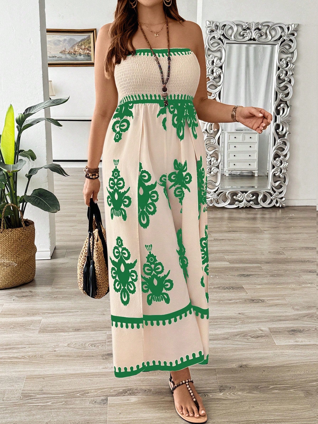 جمبسوت بريزايا مطبوع بدون حمالات بمقاسات كبيرة مع فتحات حتى الفخذ