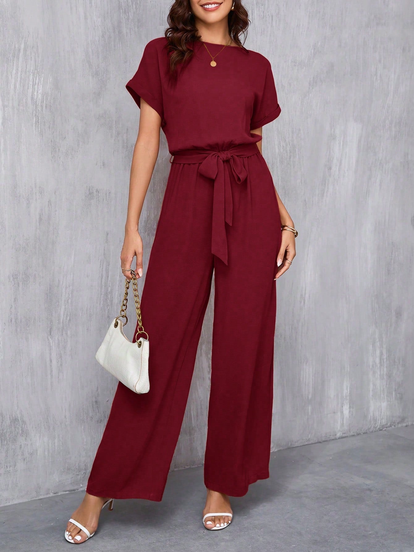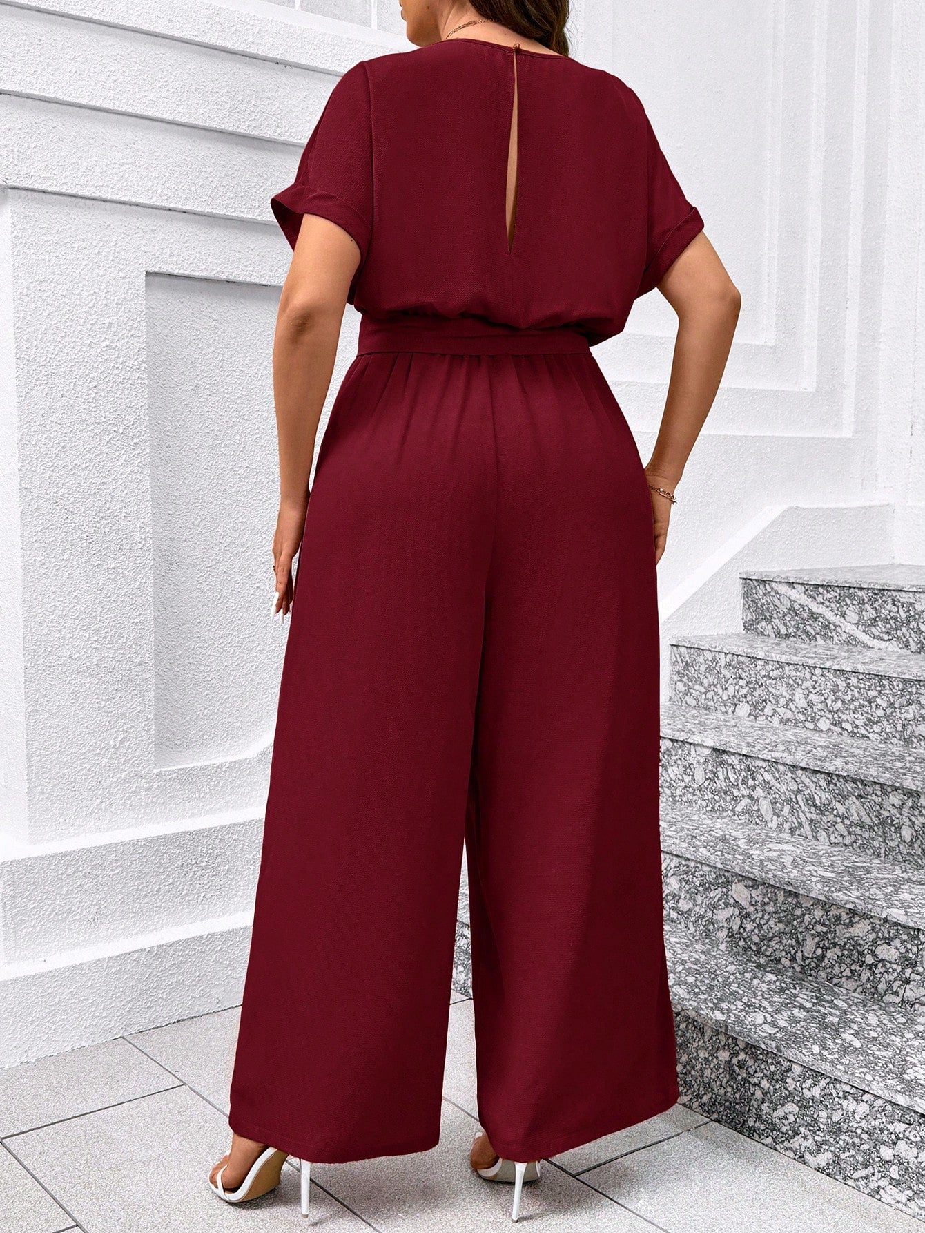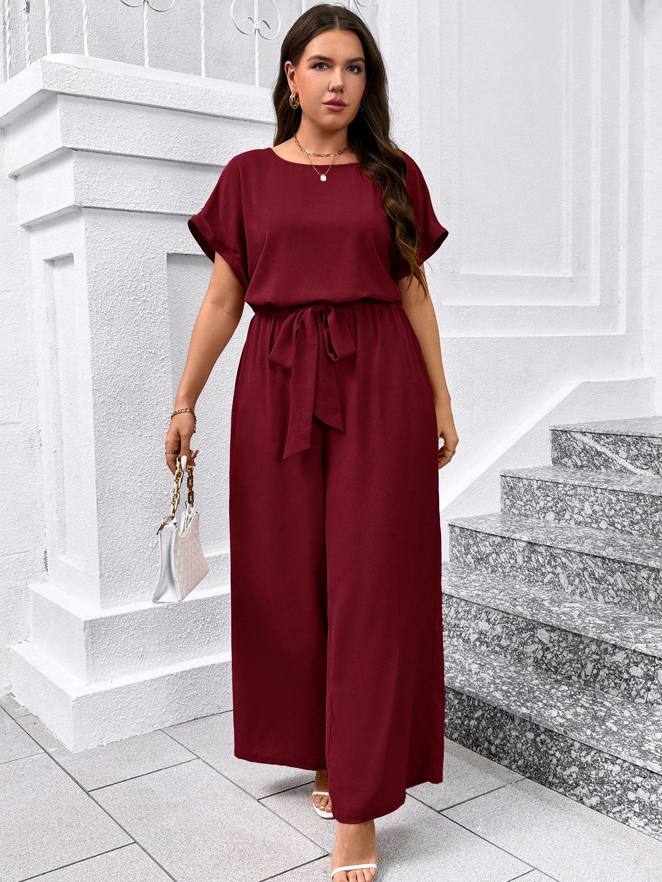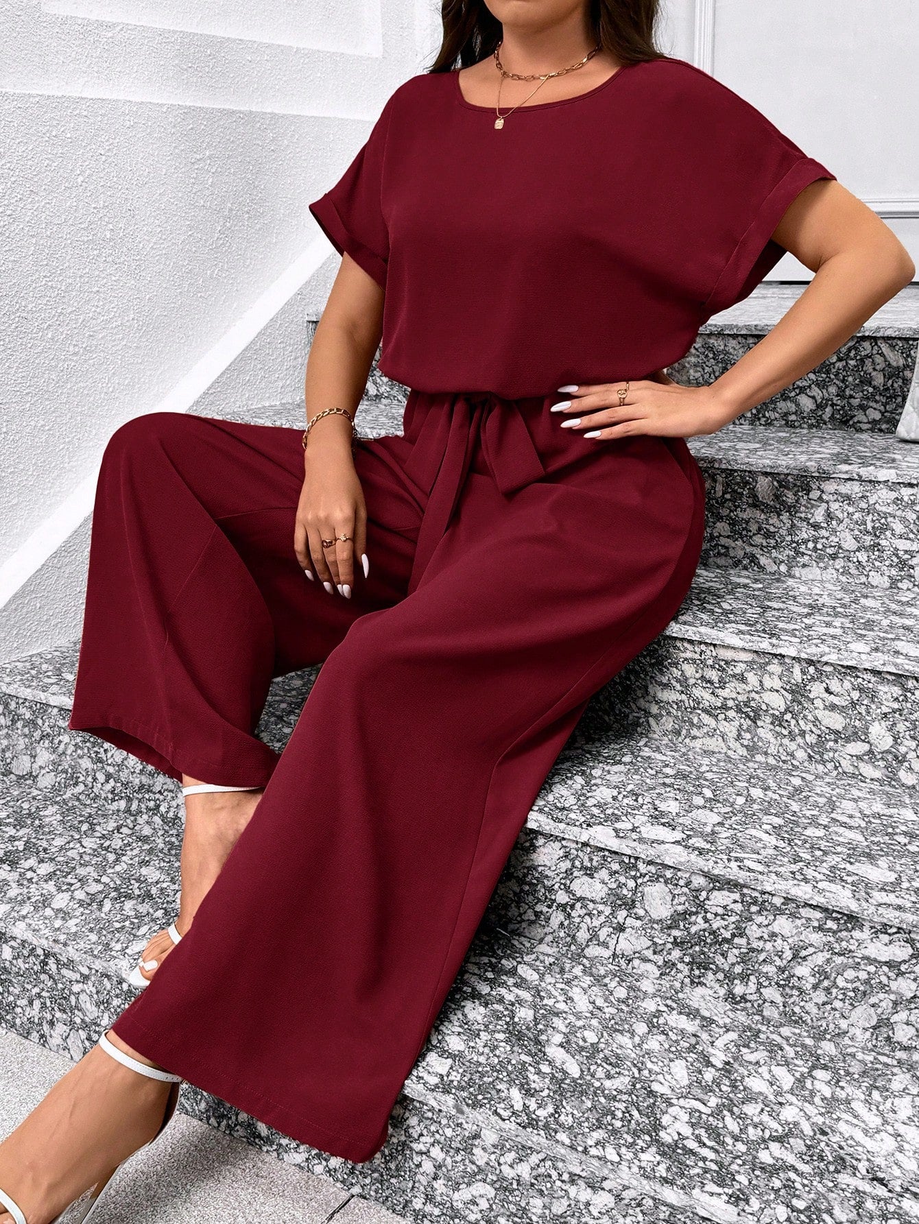 Clasi Plus Size Elegant Scoop Neck Romper With Waist Belt And Wide Leg