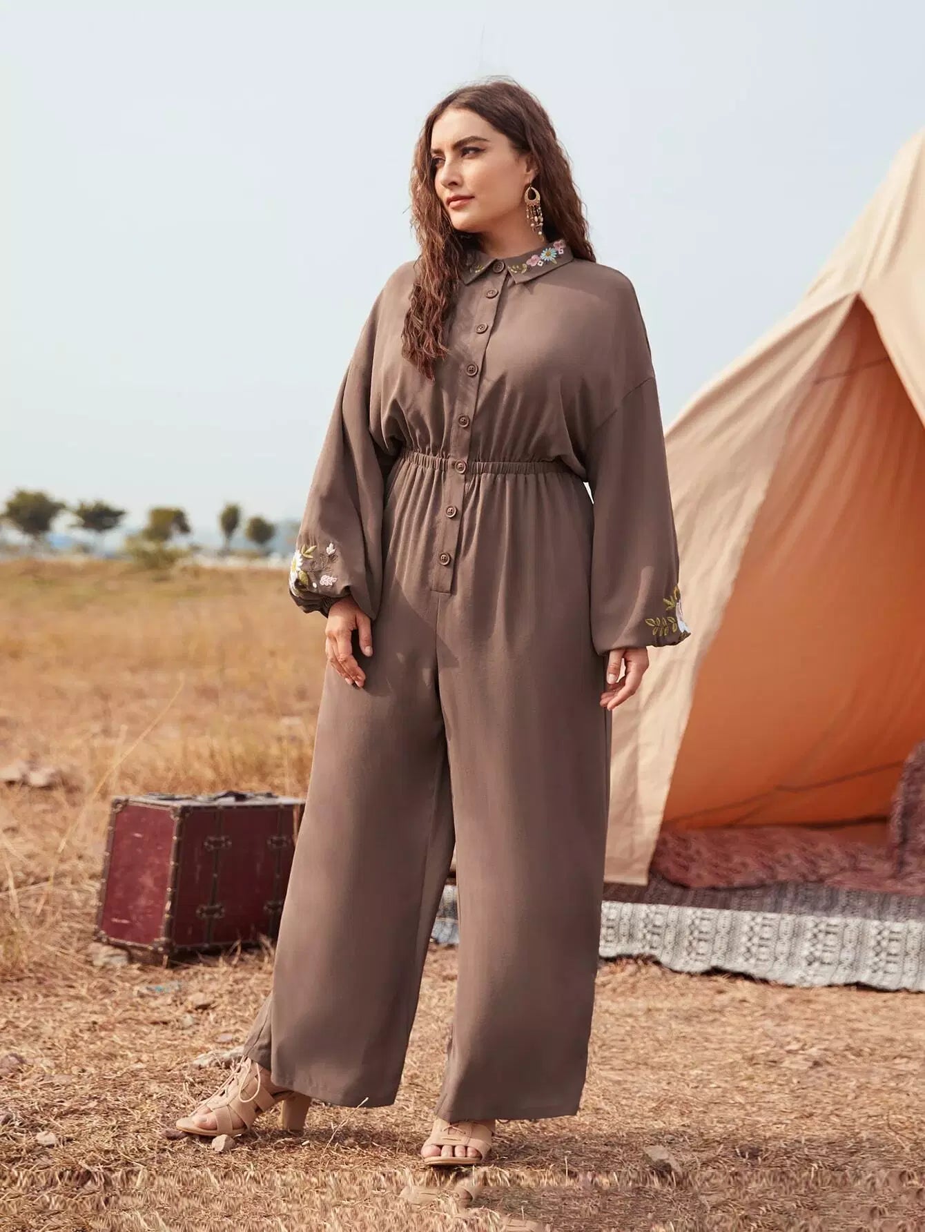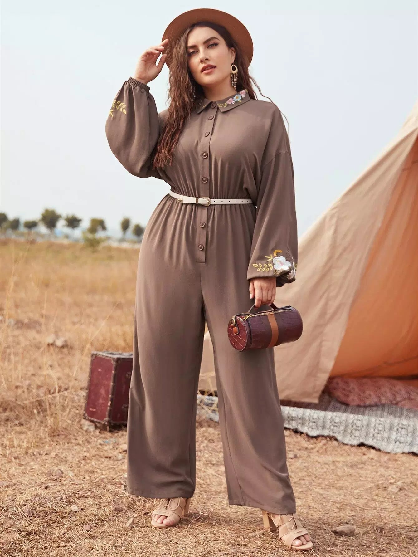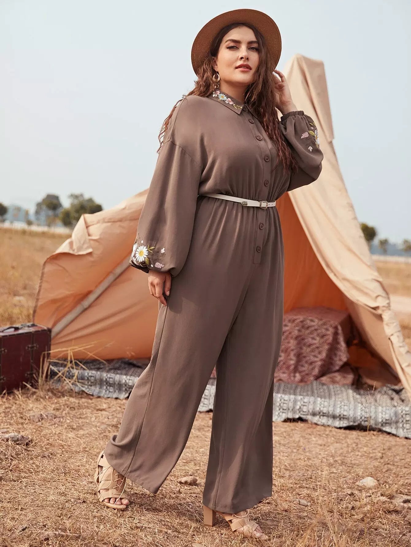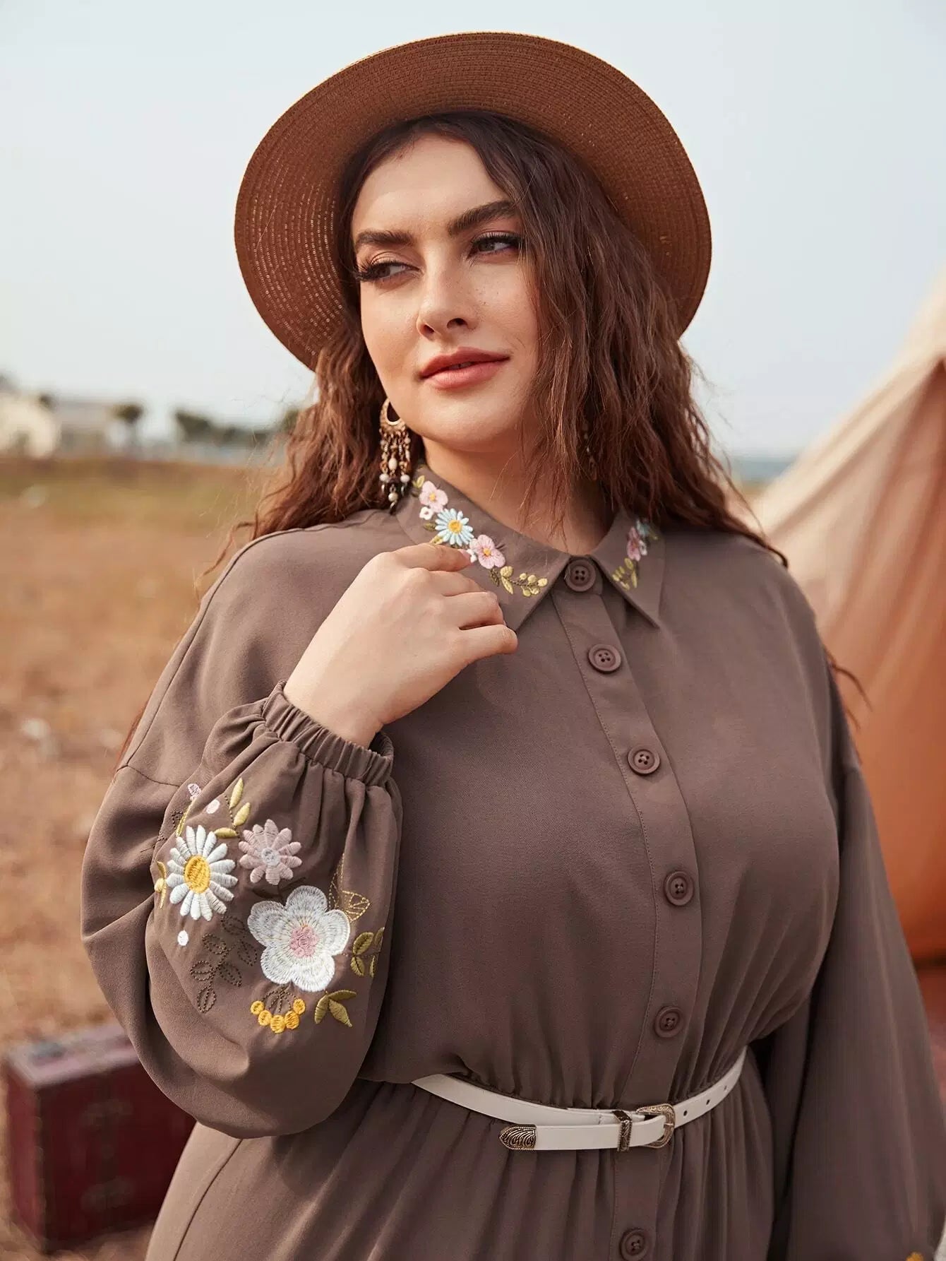نحيف - مقاس كبير بذلة قميص بأكمام فانوس مطرزة بالزهور بدون حزام