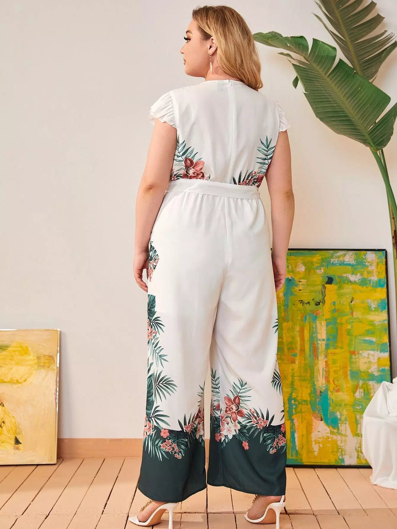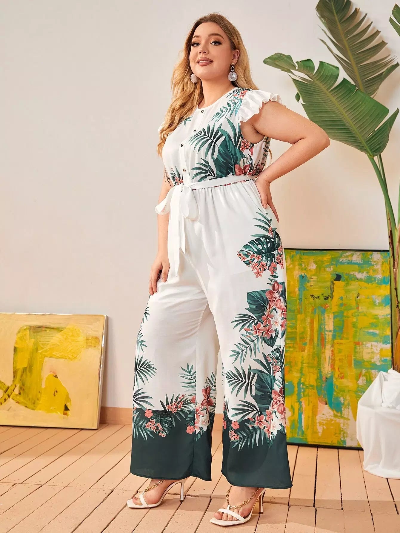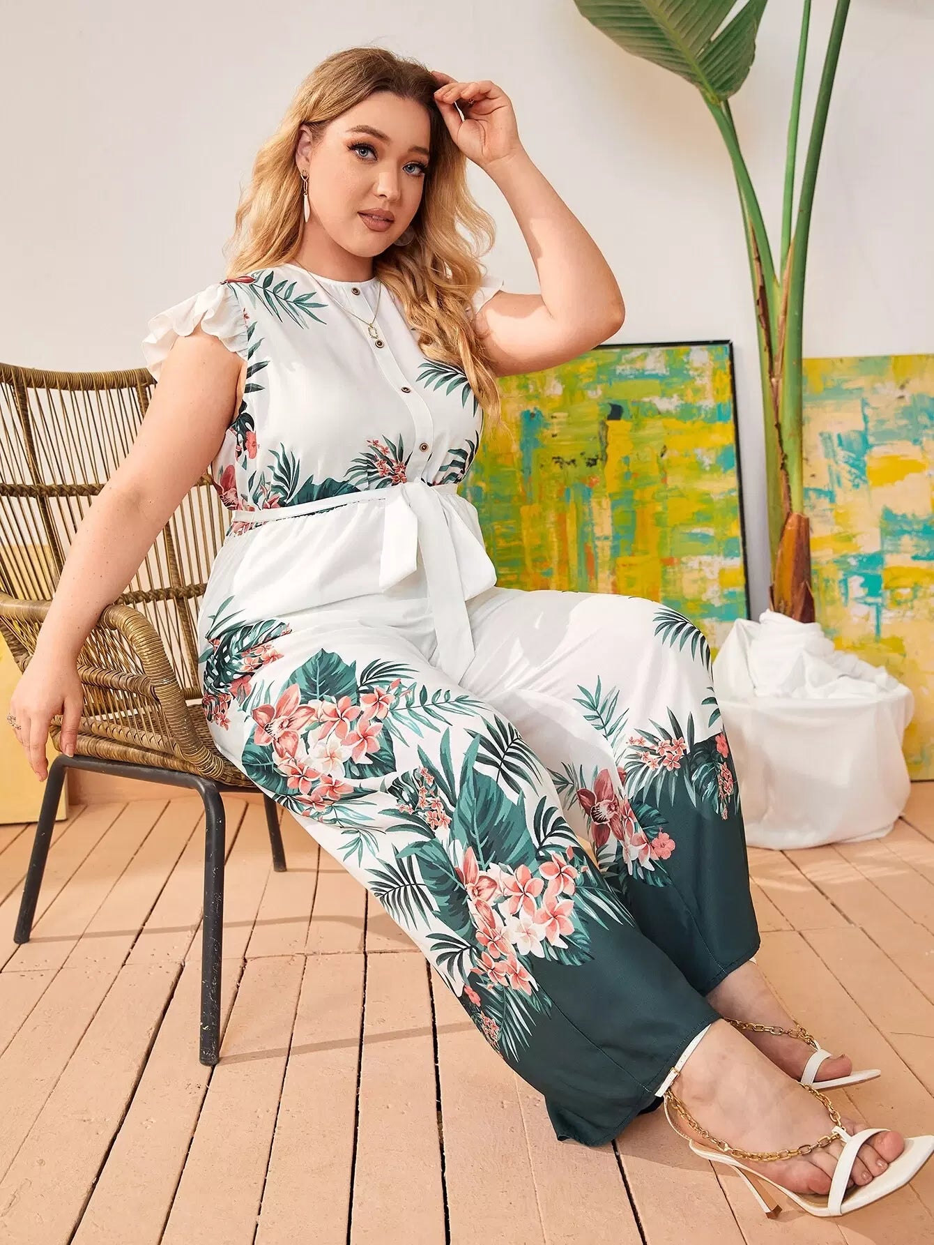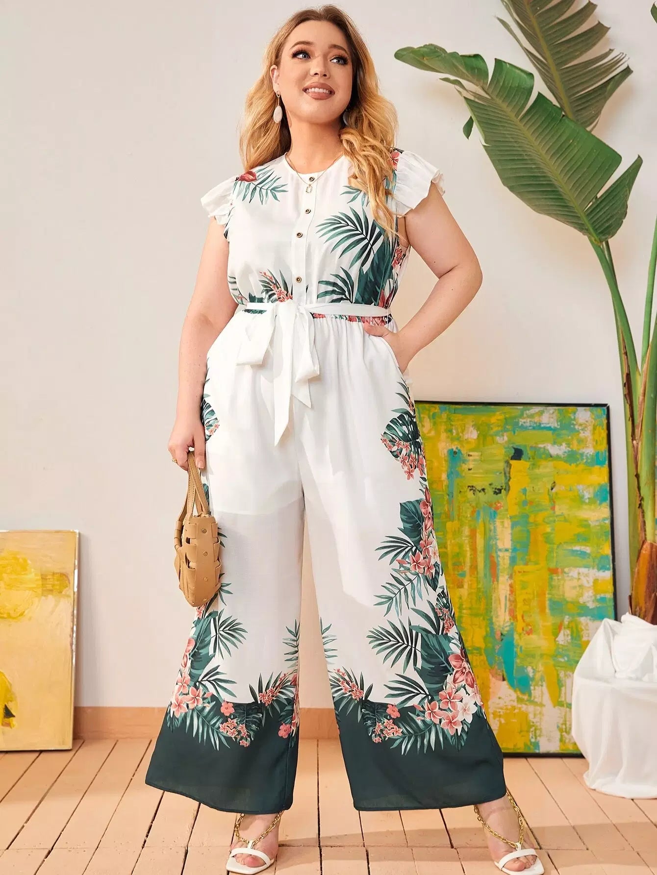 بالإضافة إلى بذلة ذات طباعة استوائية ذات حواف مكشكشة بدون حزام