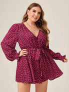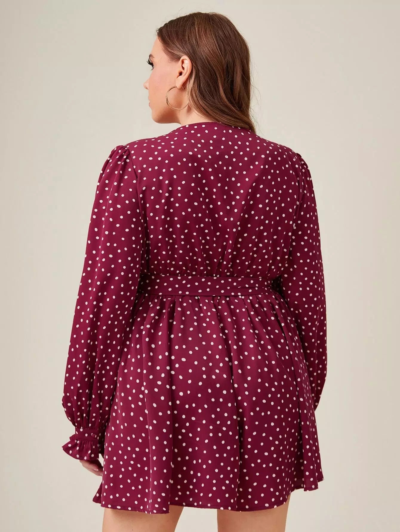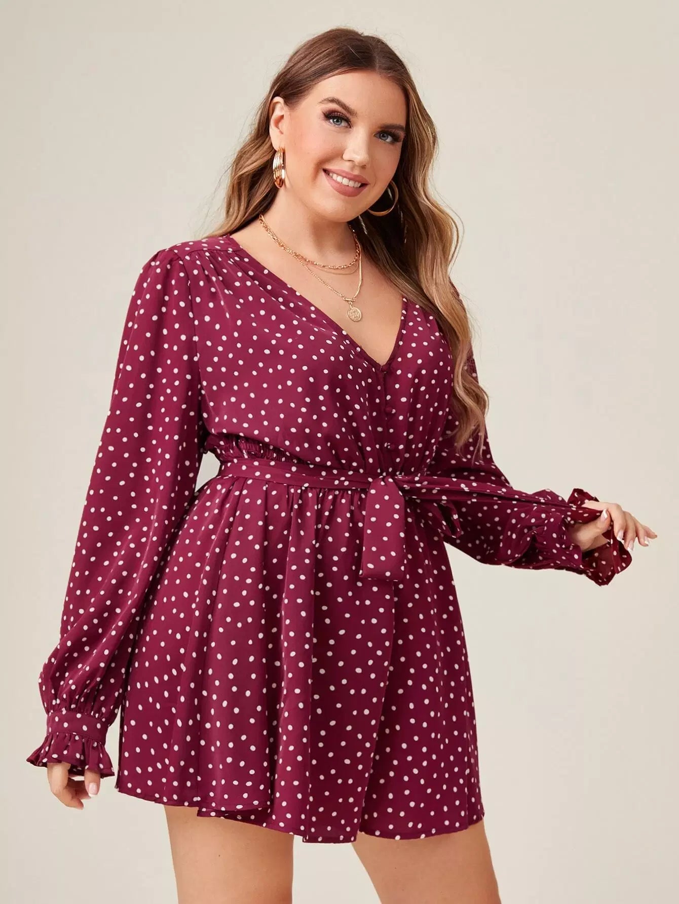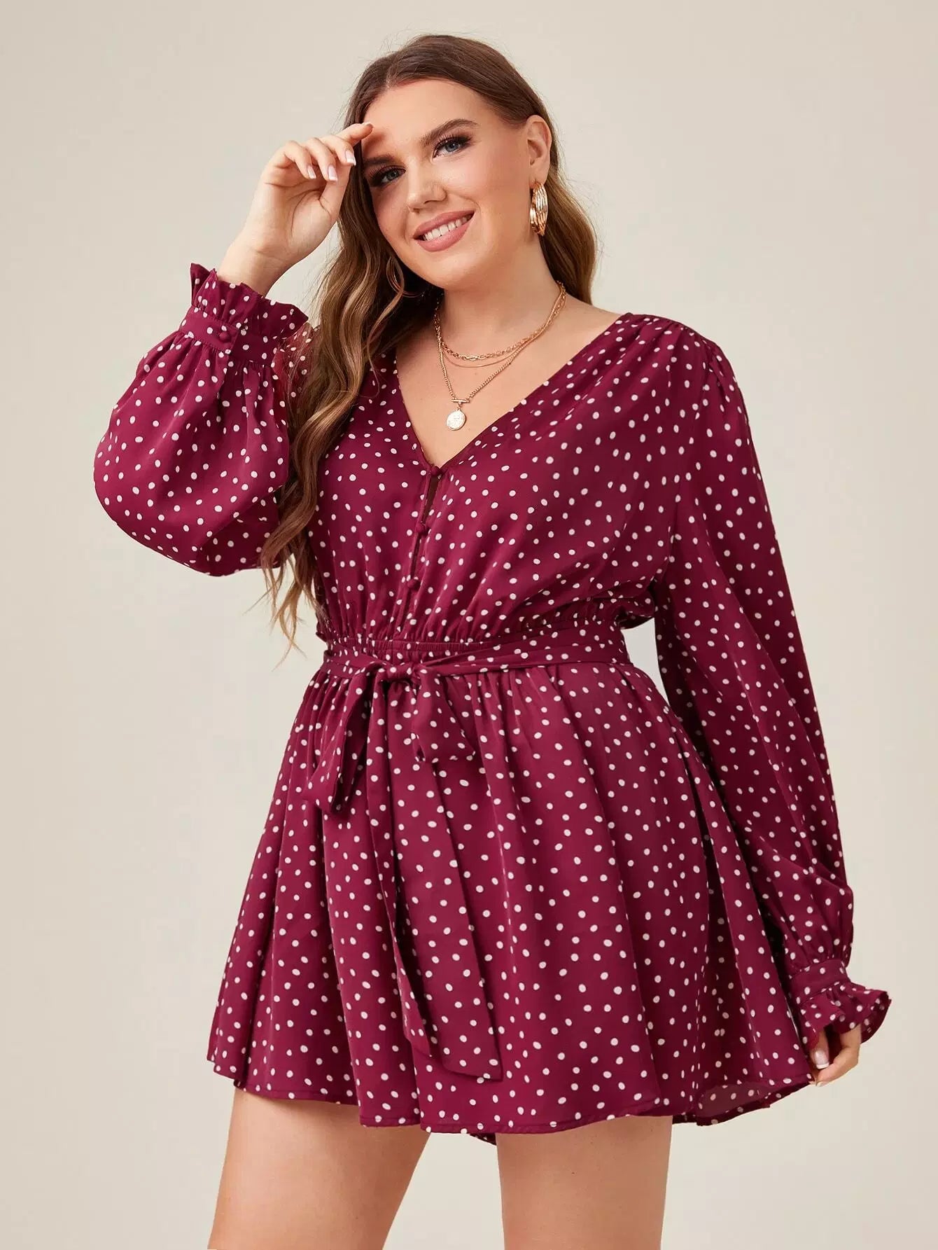 بالإضافة إلى رومبير منقط بياقة على شكل حرف V وأكمام منتفخة بدون حزام