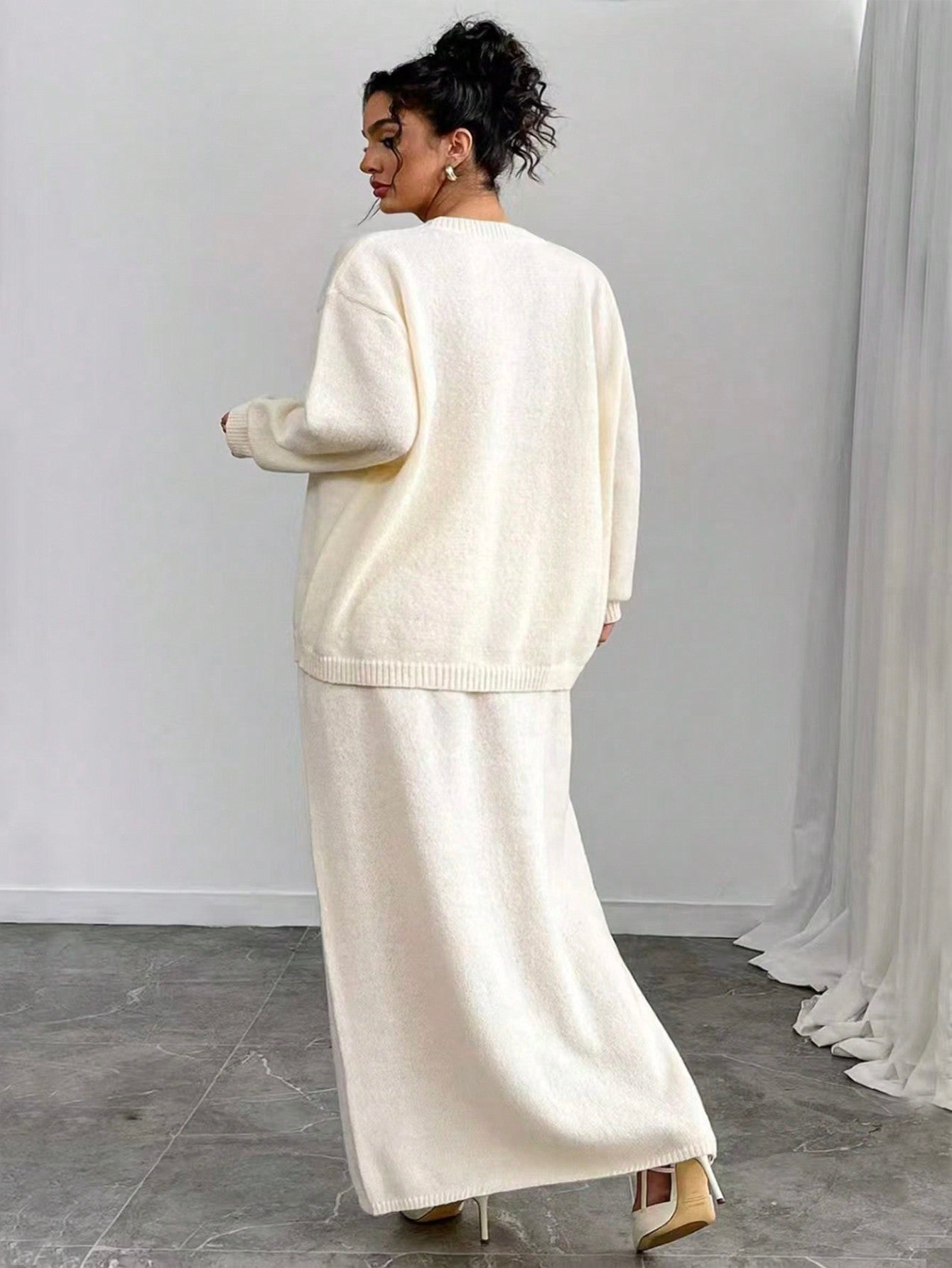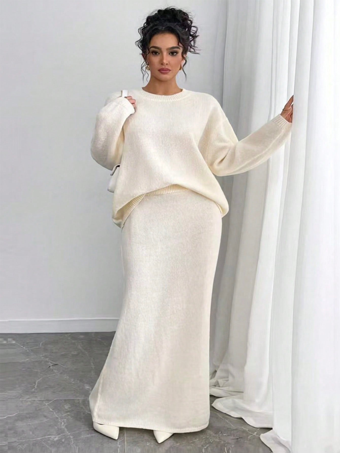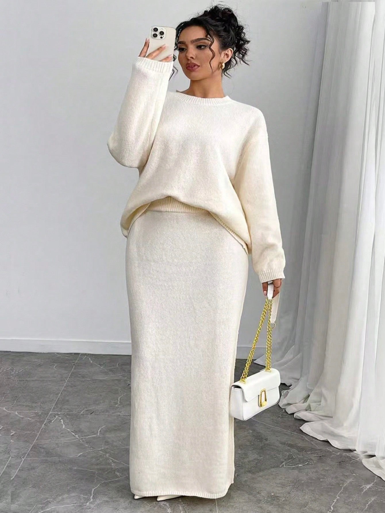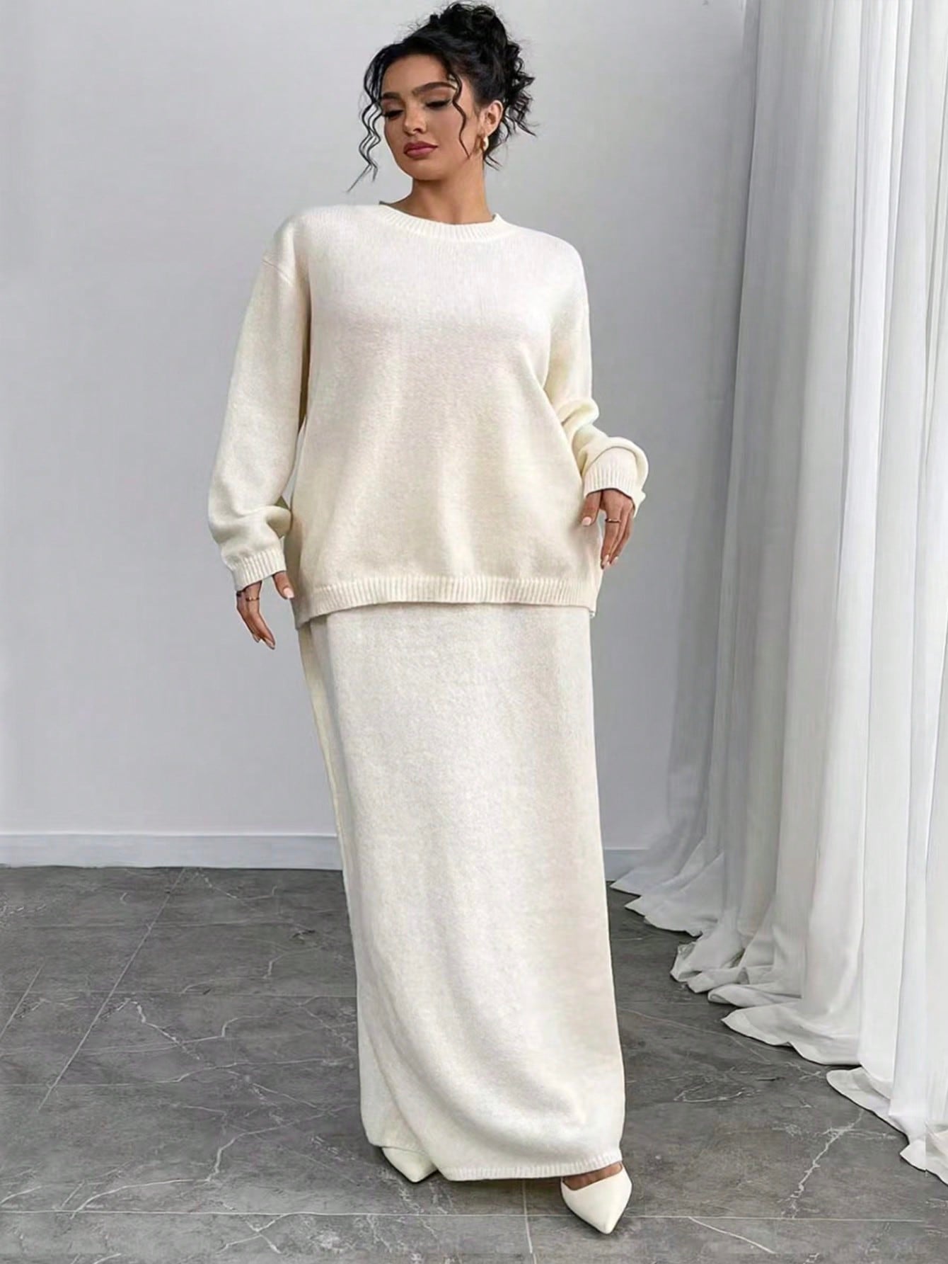 LUNE Plus Size Women Casual Solid Pullover Sweater & Skirt 2pcs Set