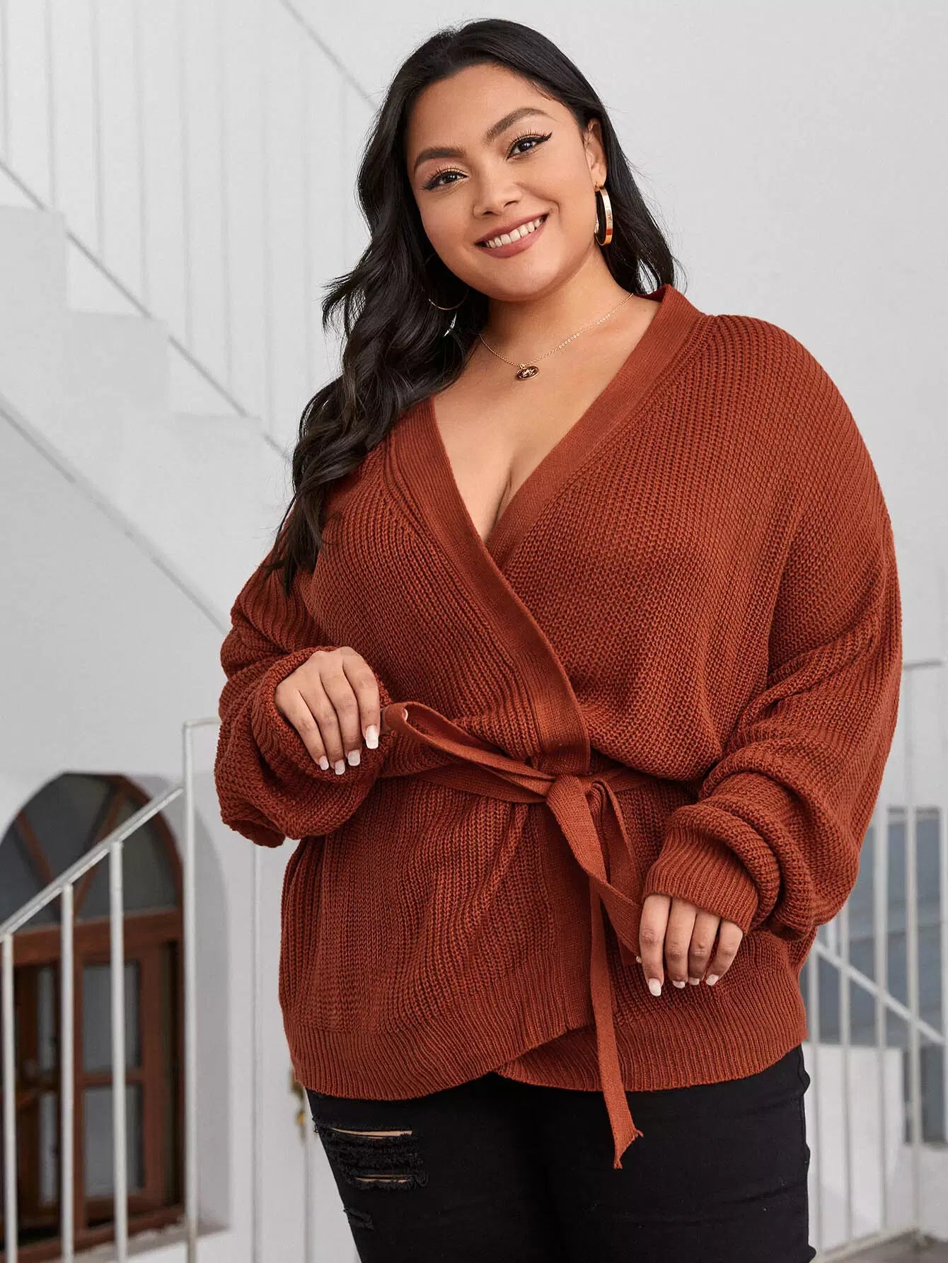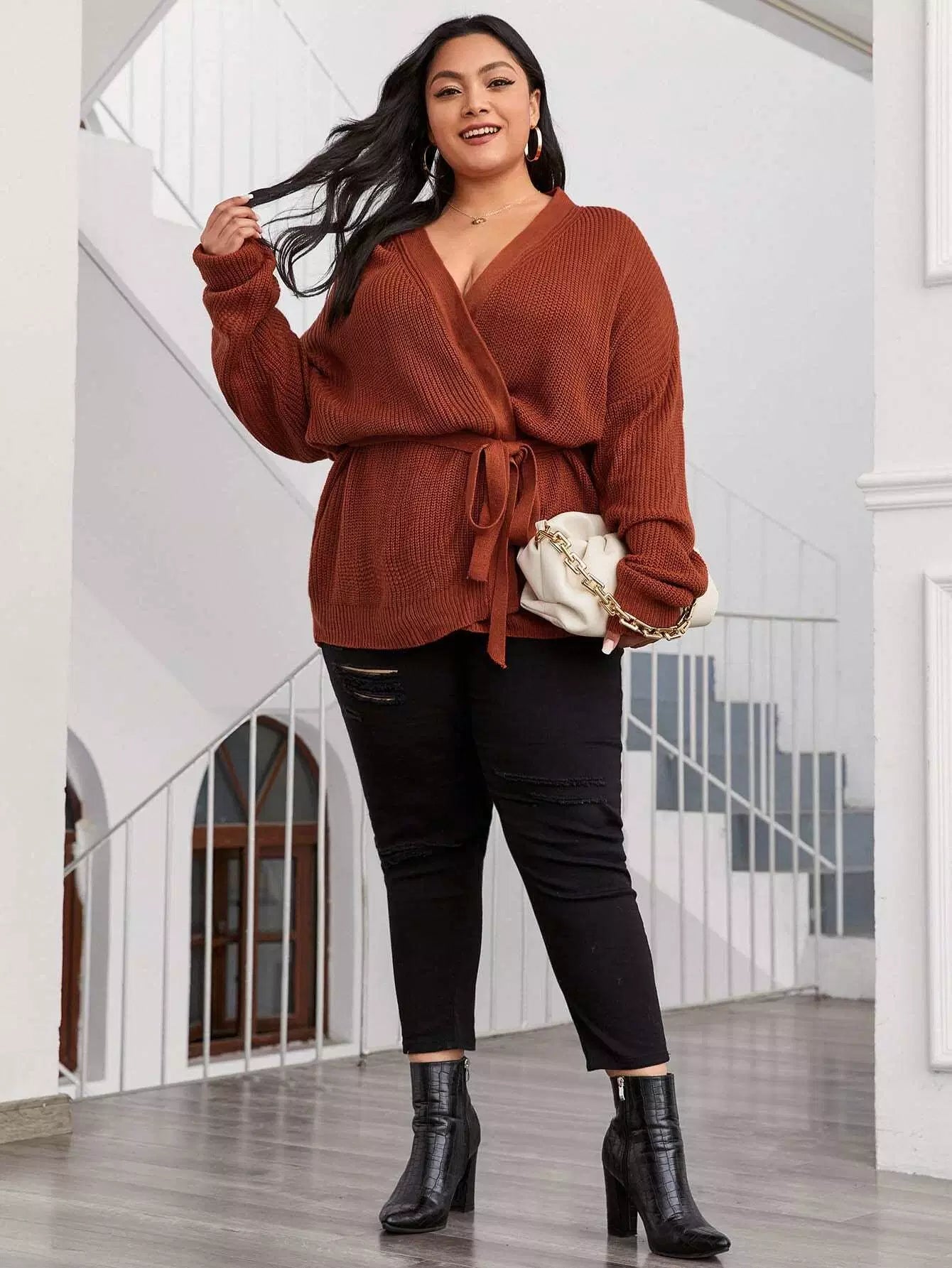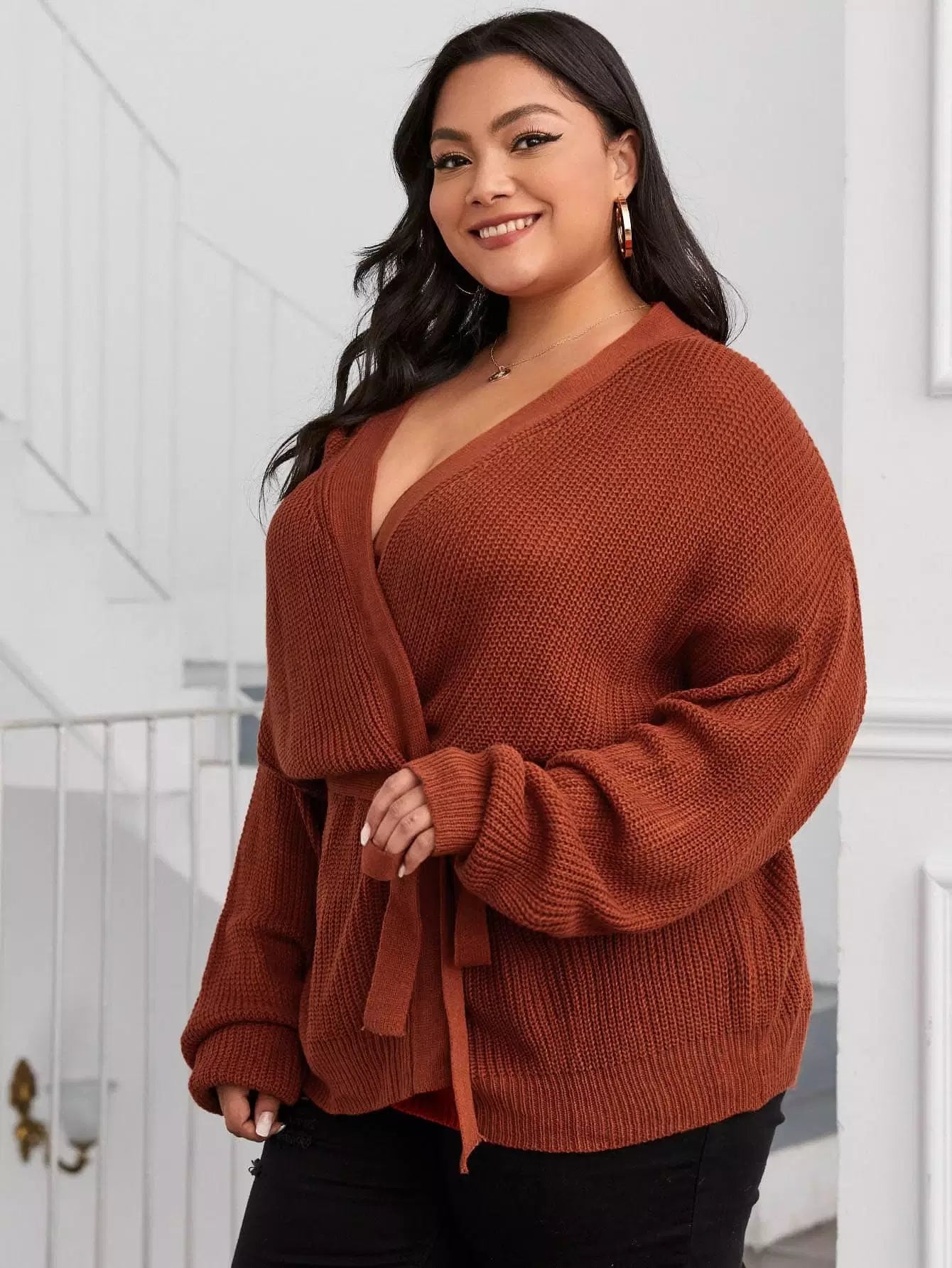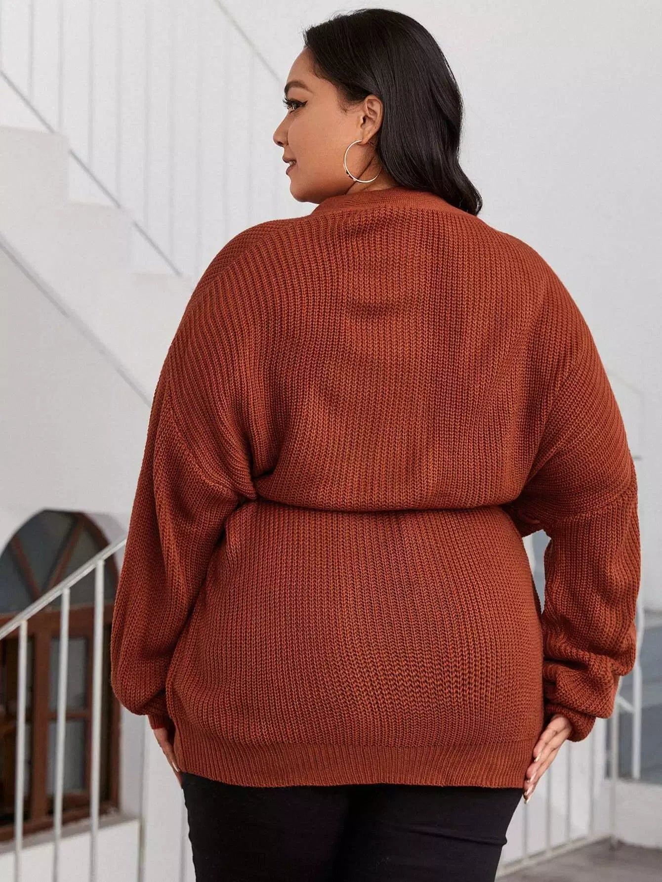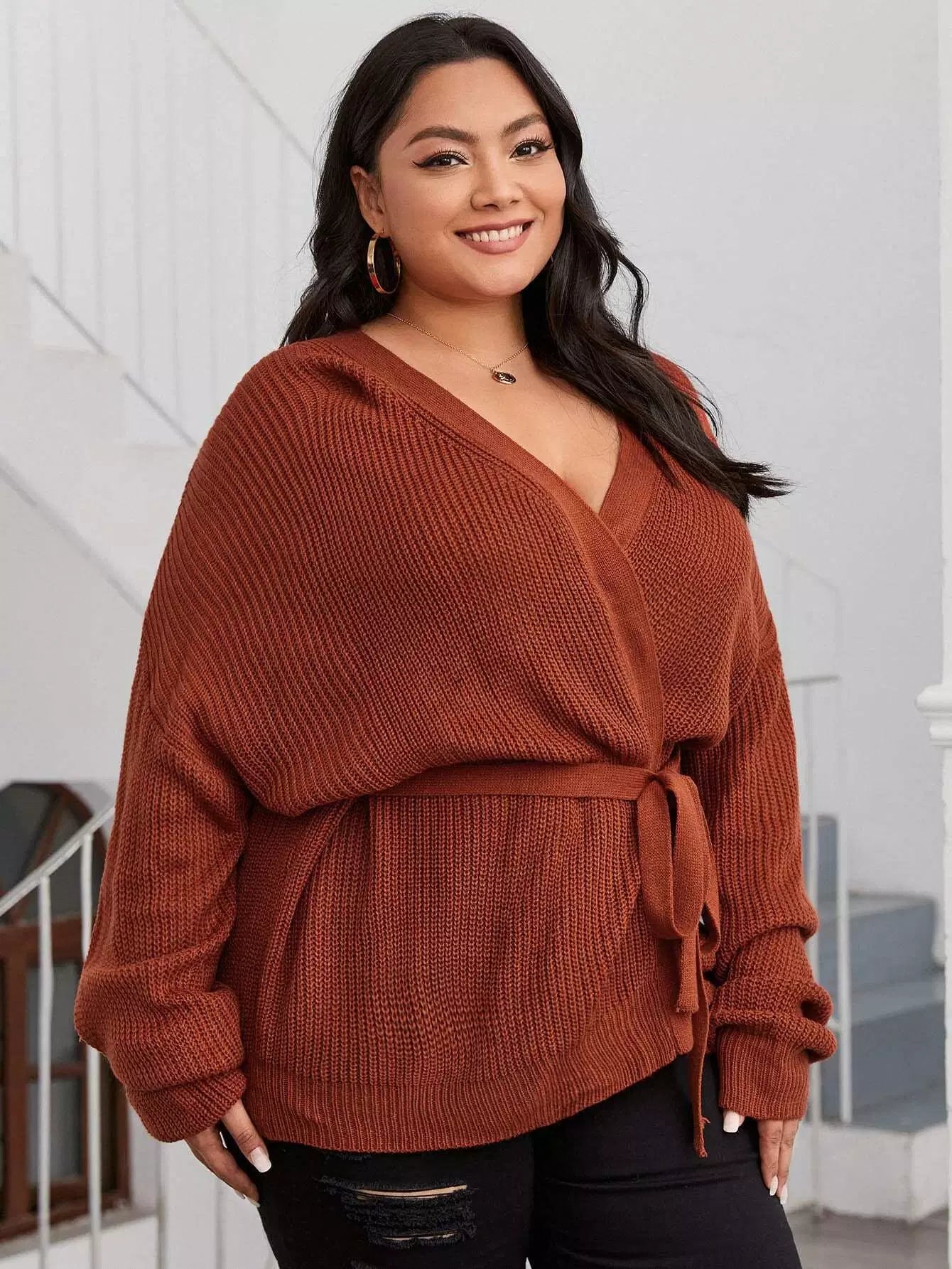 نحيف - مقاس كبير سترة صوفية ذات أكتاف منسدلة وحزام ذاتي