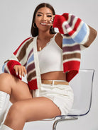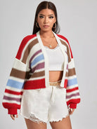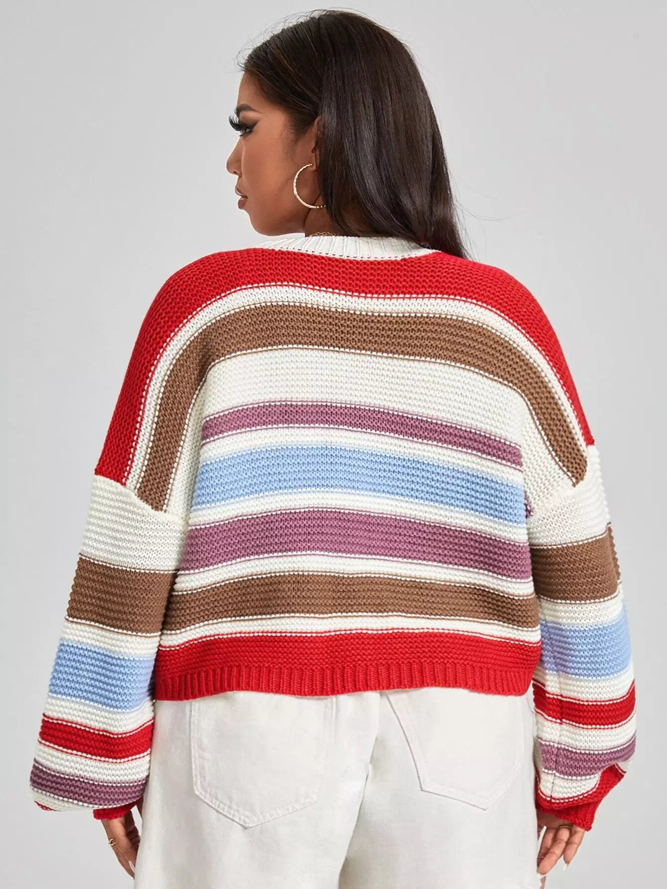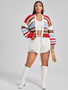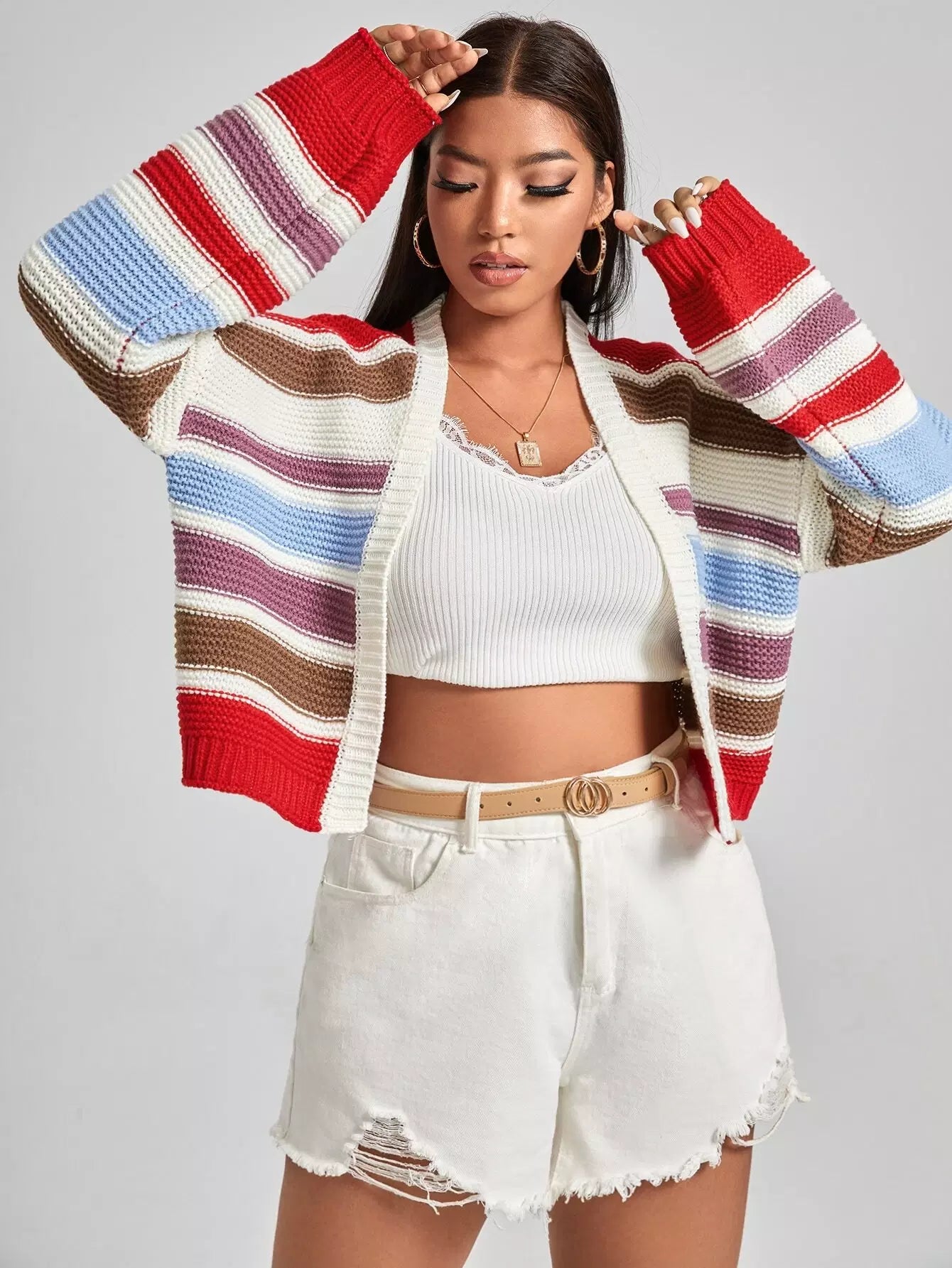 كارديجان مفتوح منسدل الكتف مفتوح من الأمام بنقشة مخططة زائد