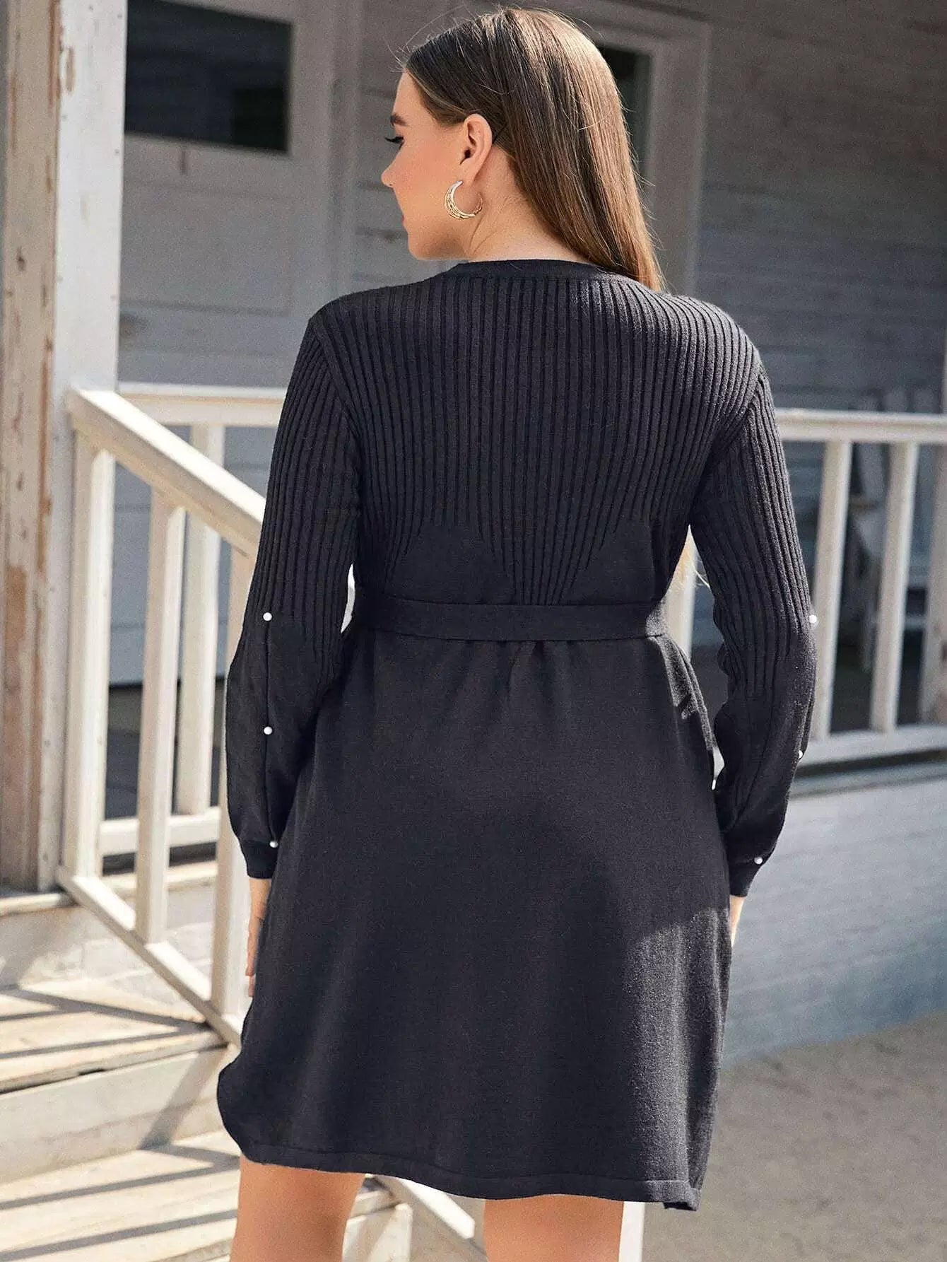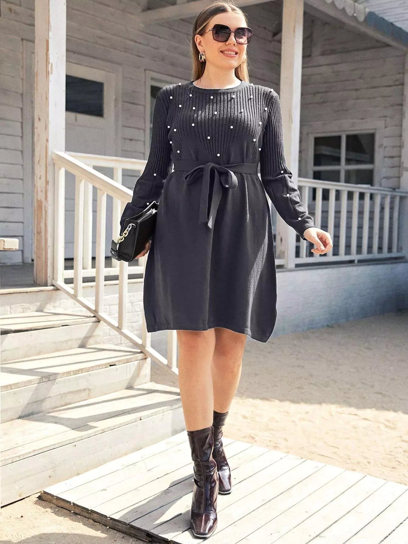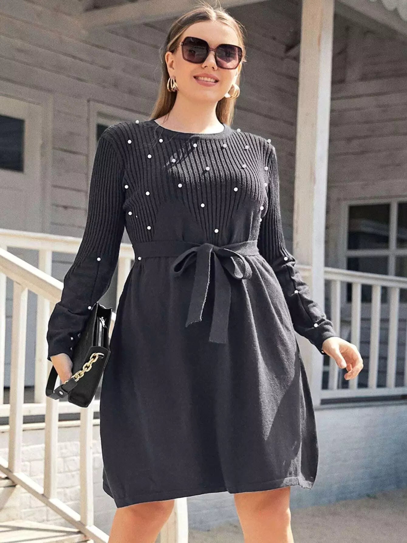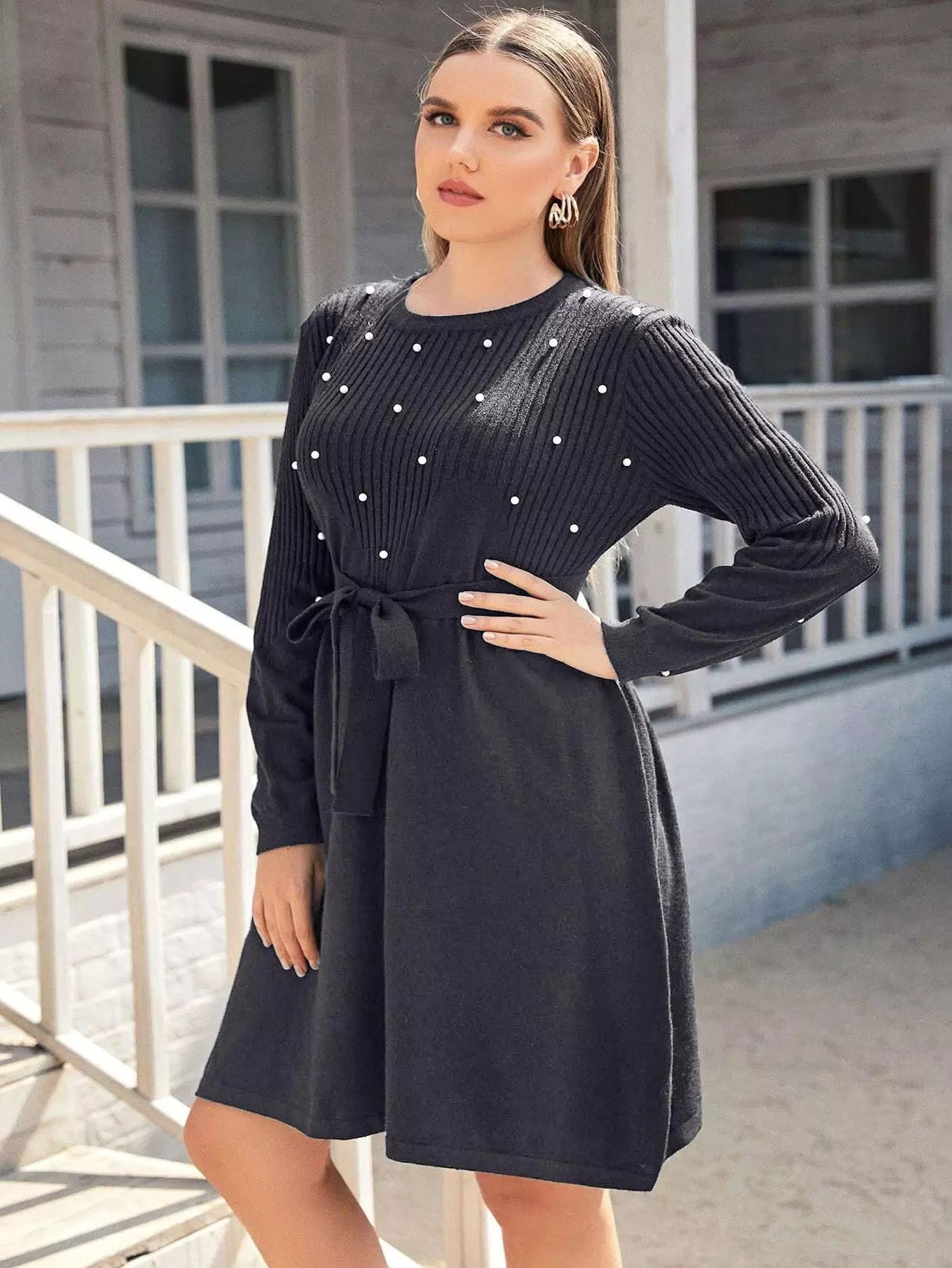 بالإضافة إلى فستان منسوج مطرز باللؤلؤ بدون حزام