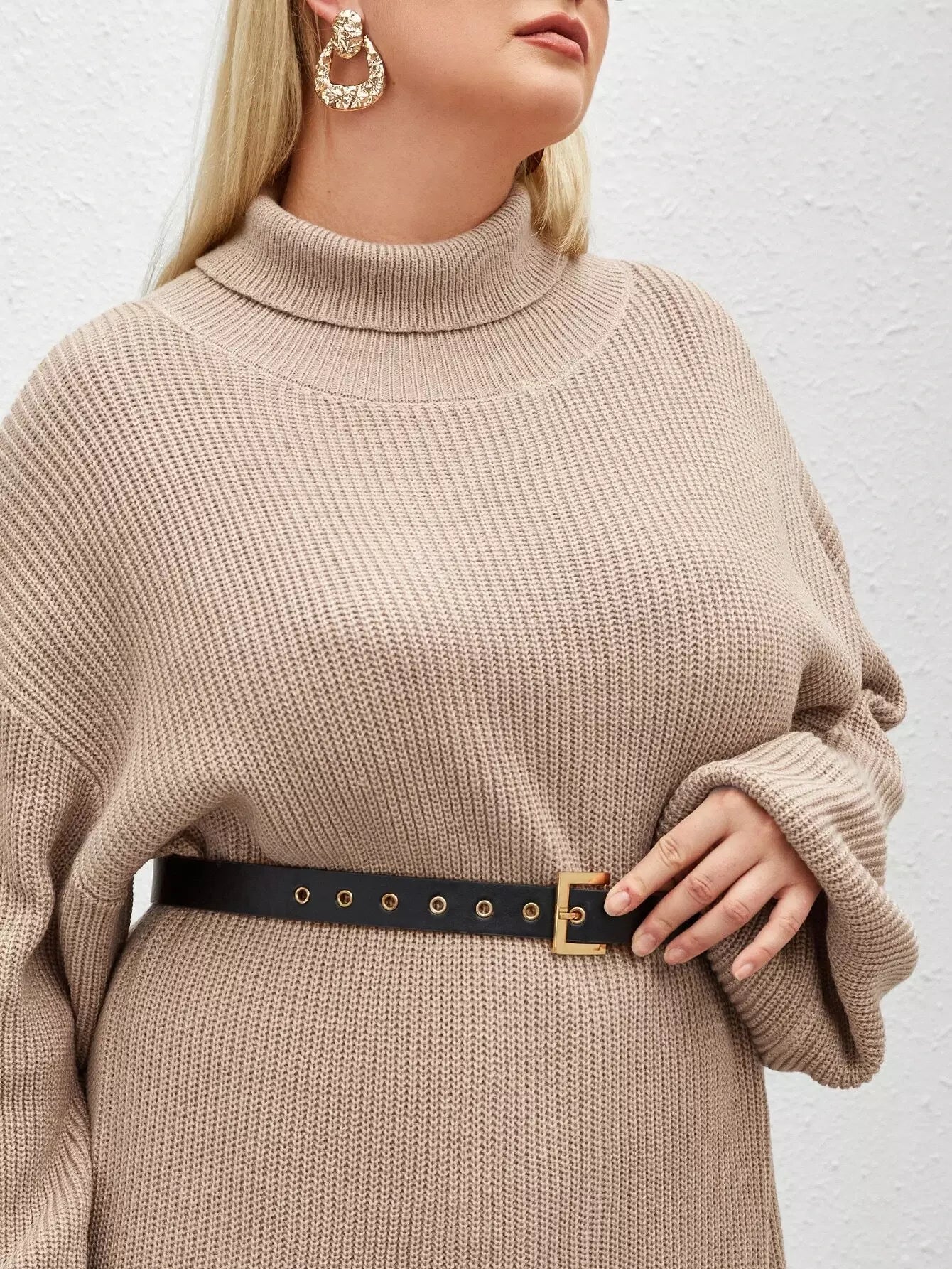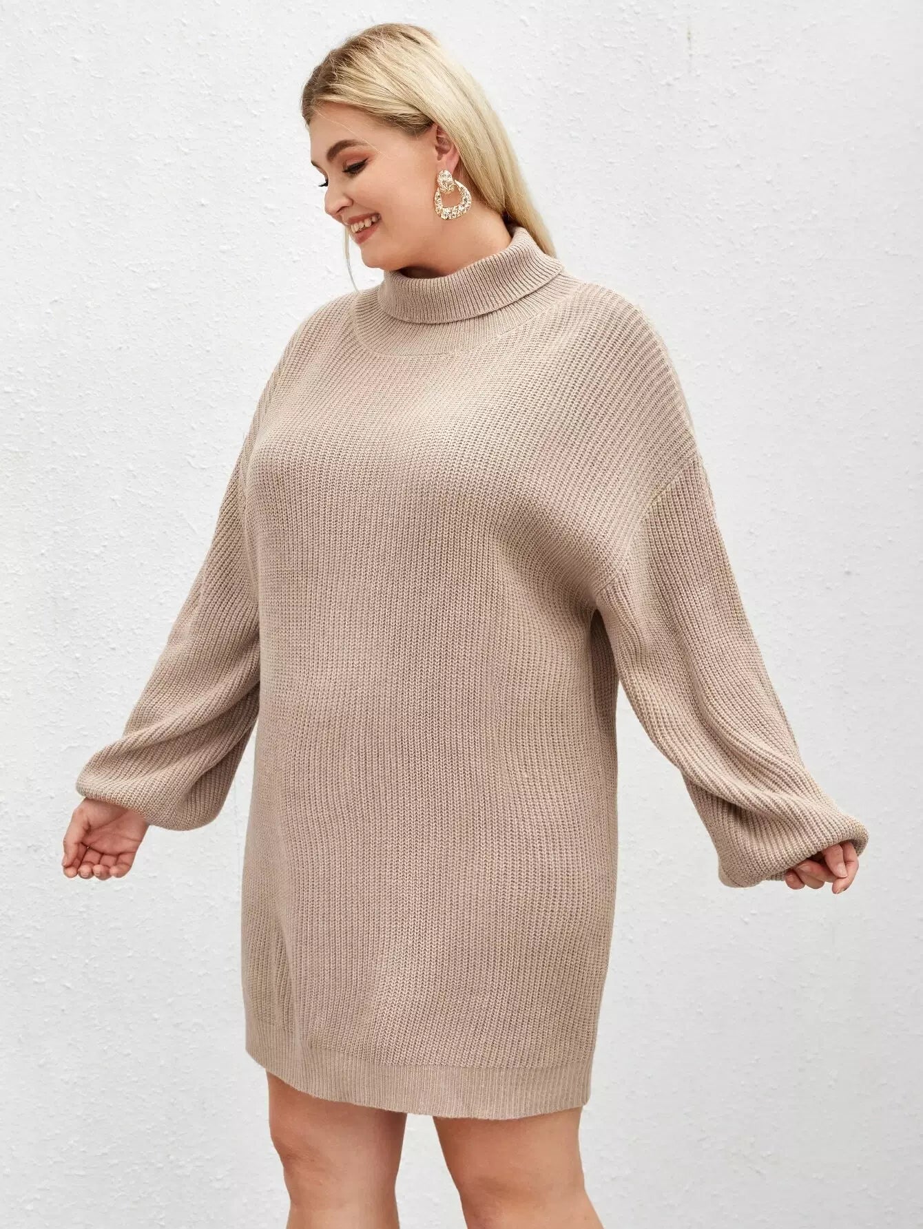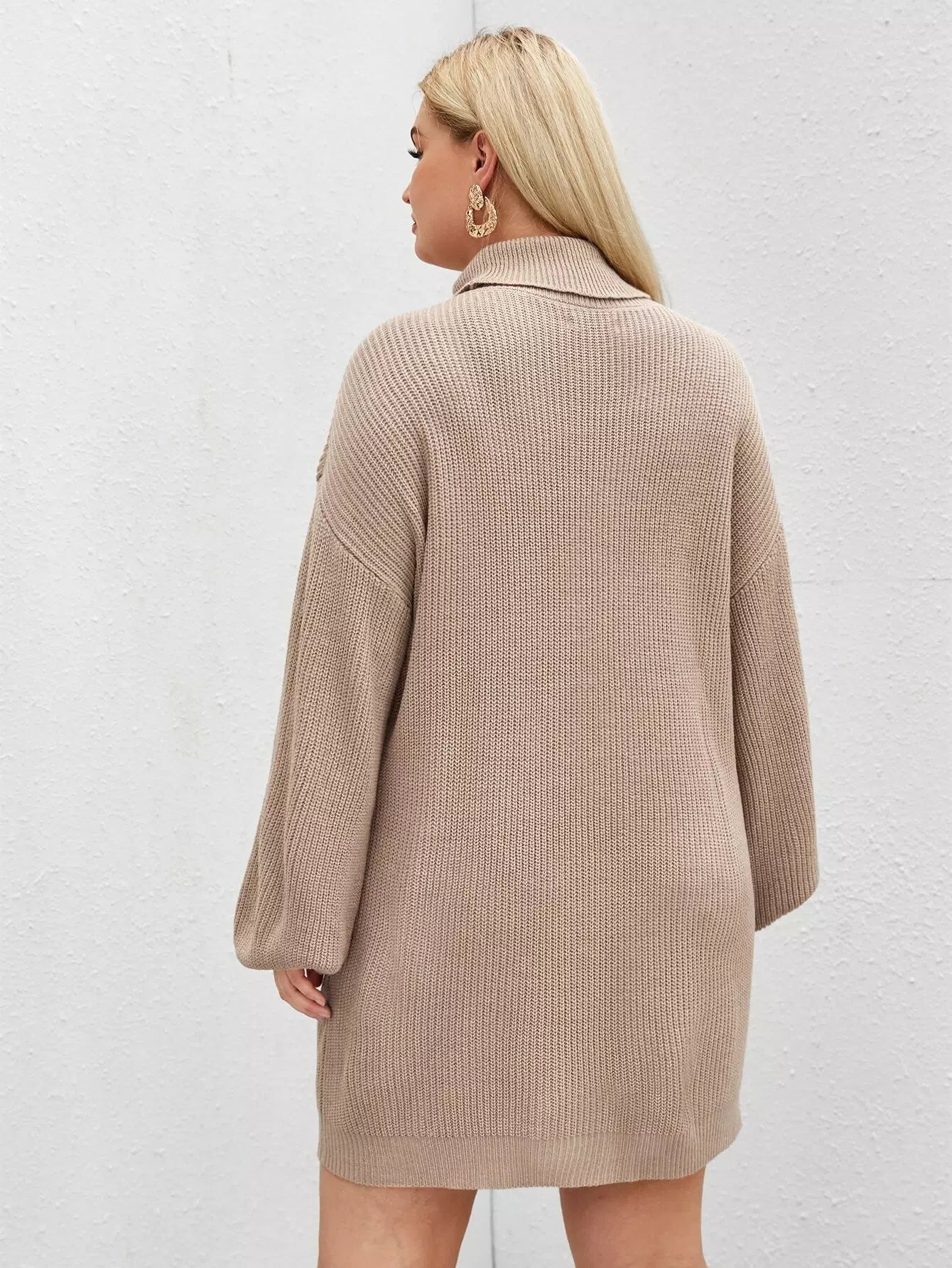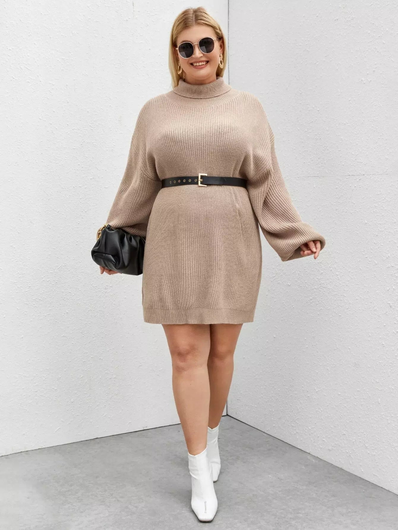 بالإضافة إلى فستان سترة بياقة سلحفاة وأكمام فانوس بدون حزام