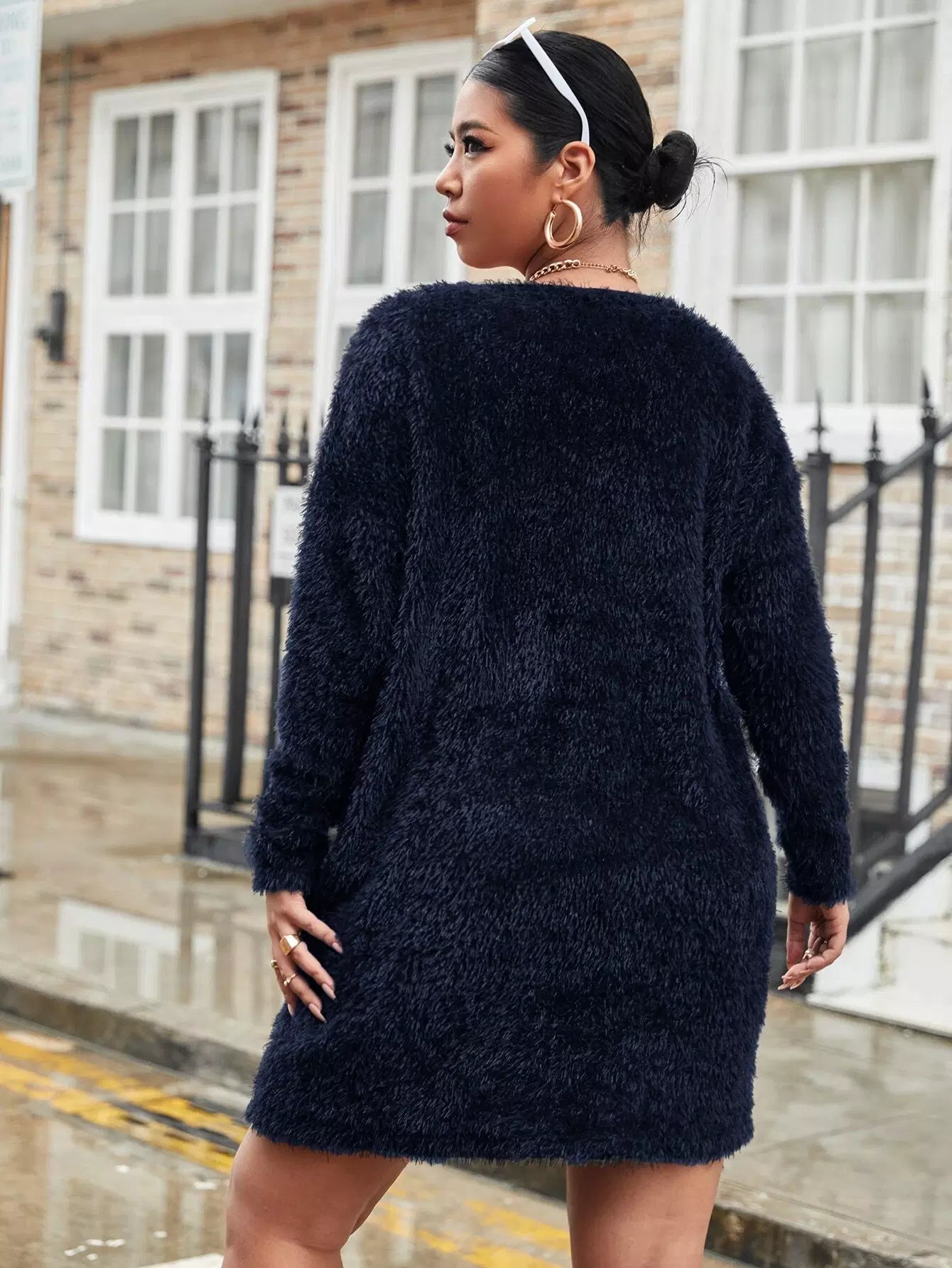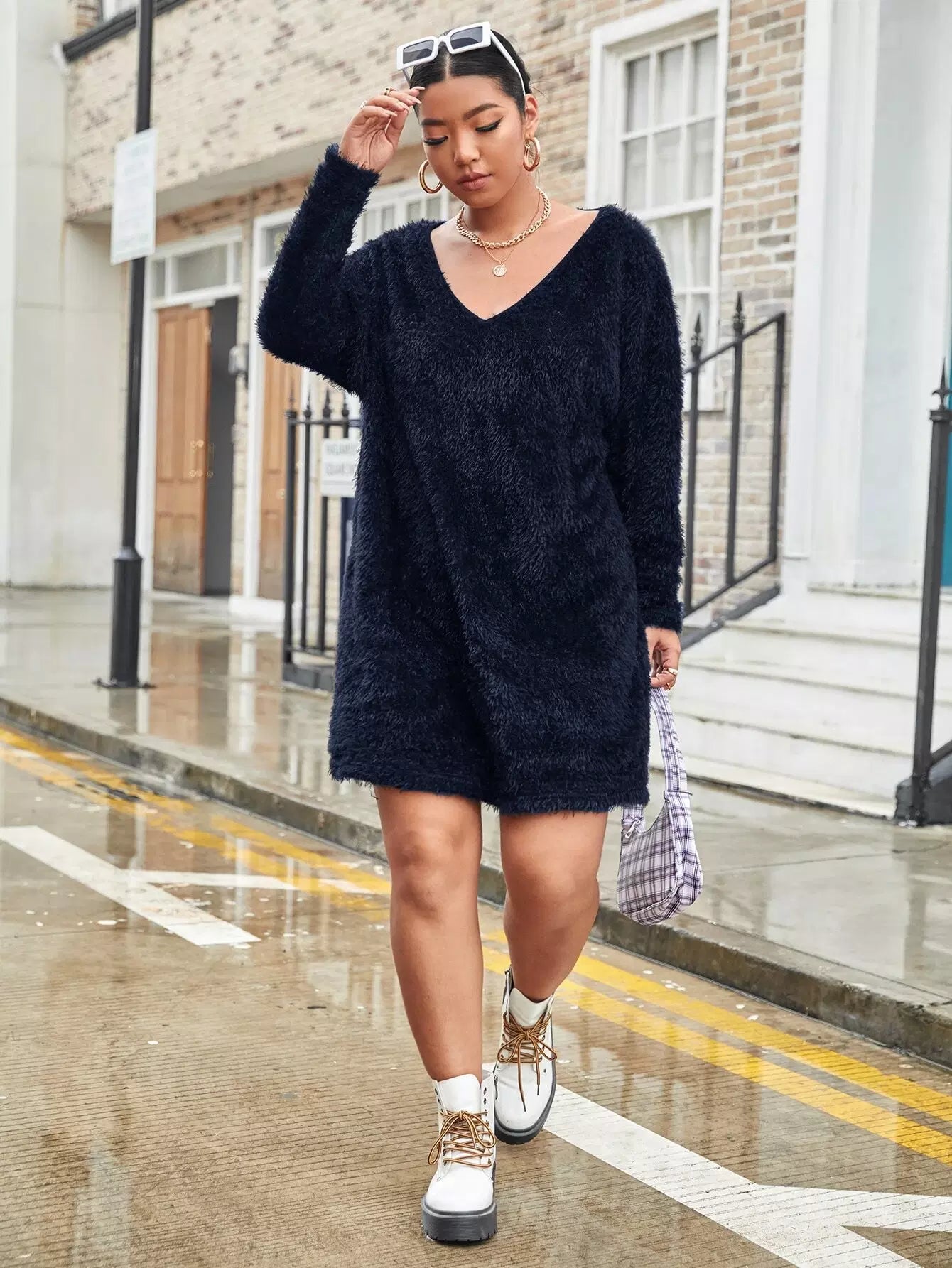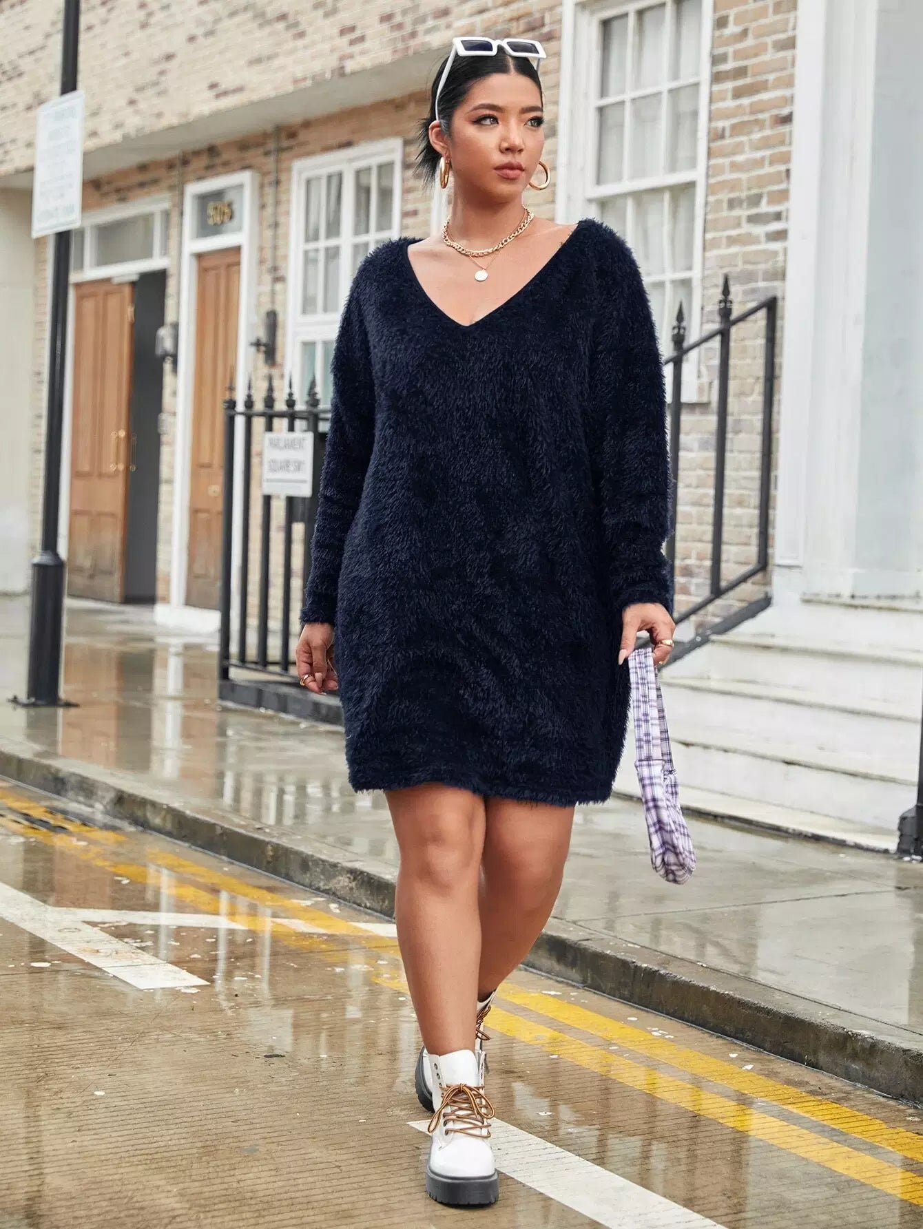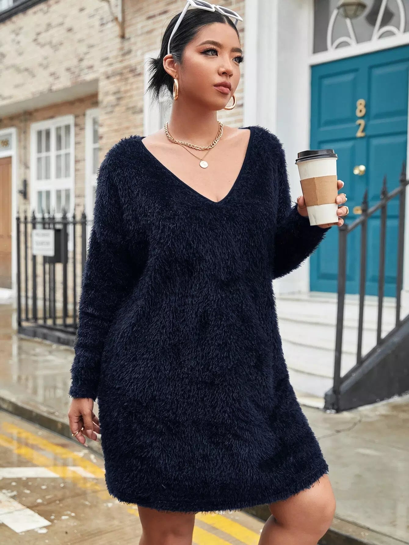 فستان بياقة زائد برقبة على شكل حرف V منسوج ومنفوش