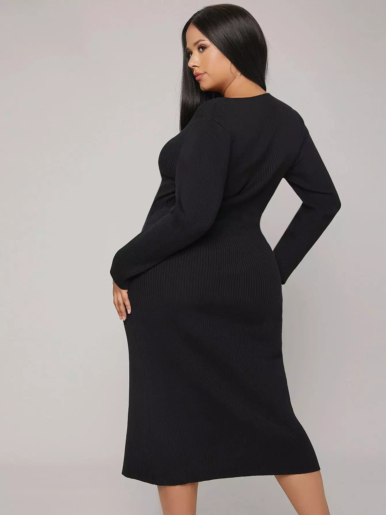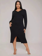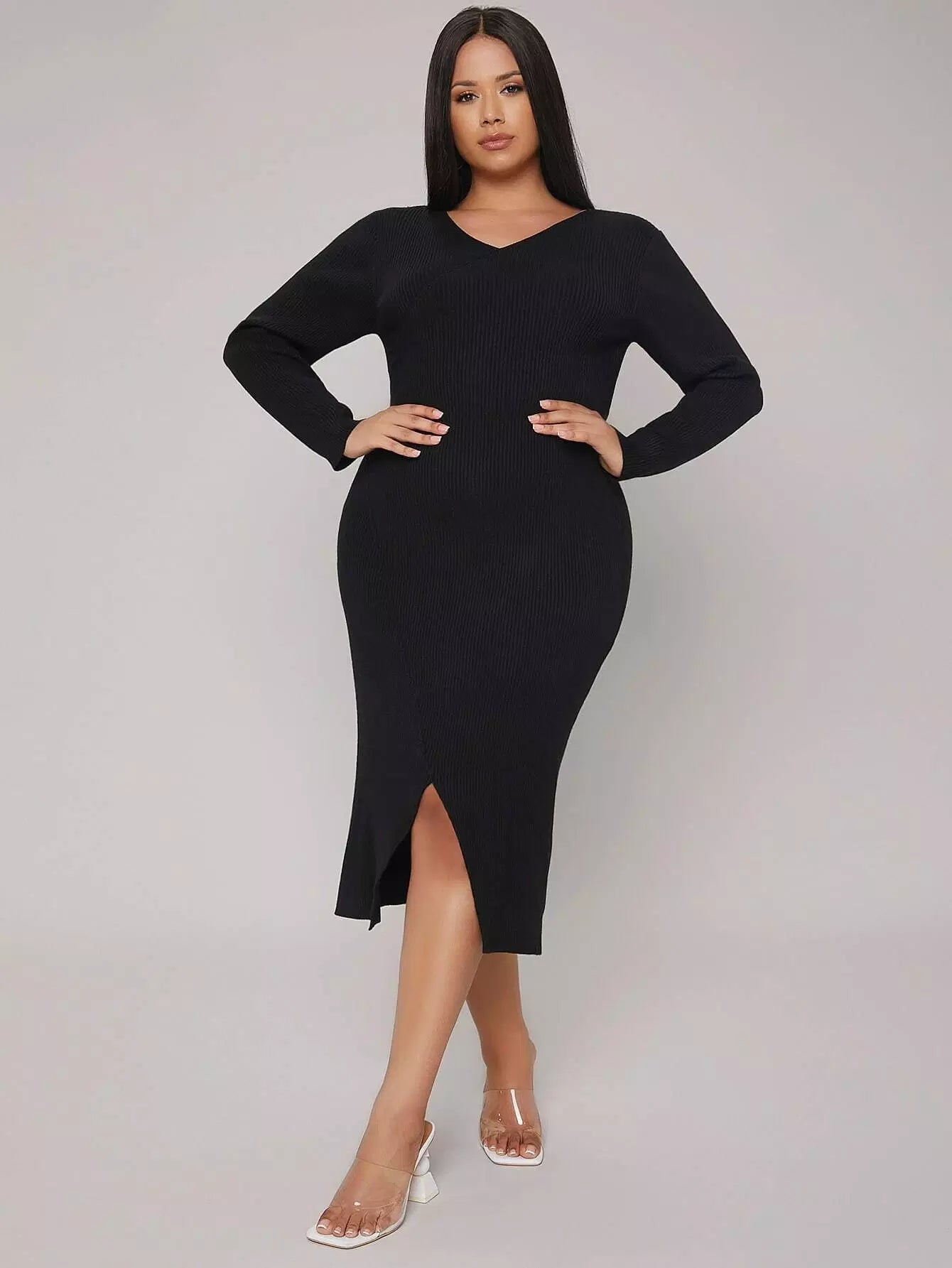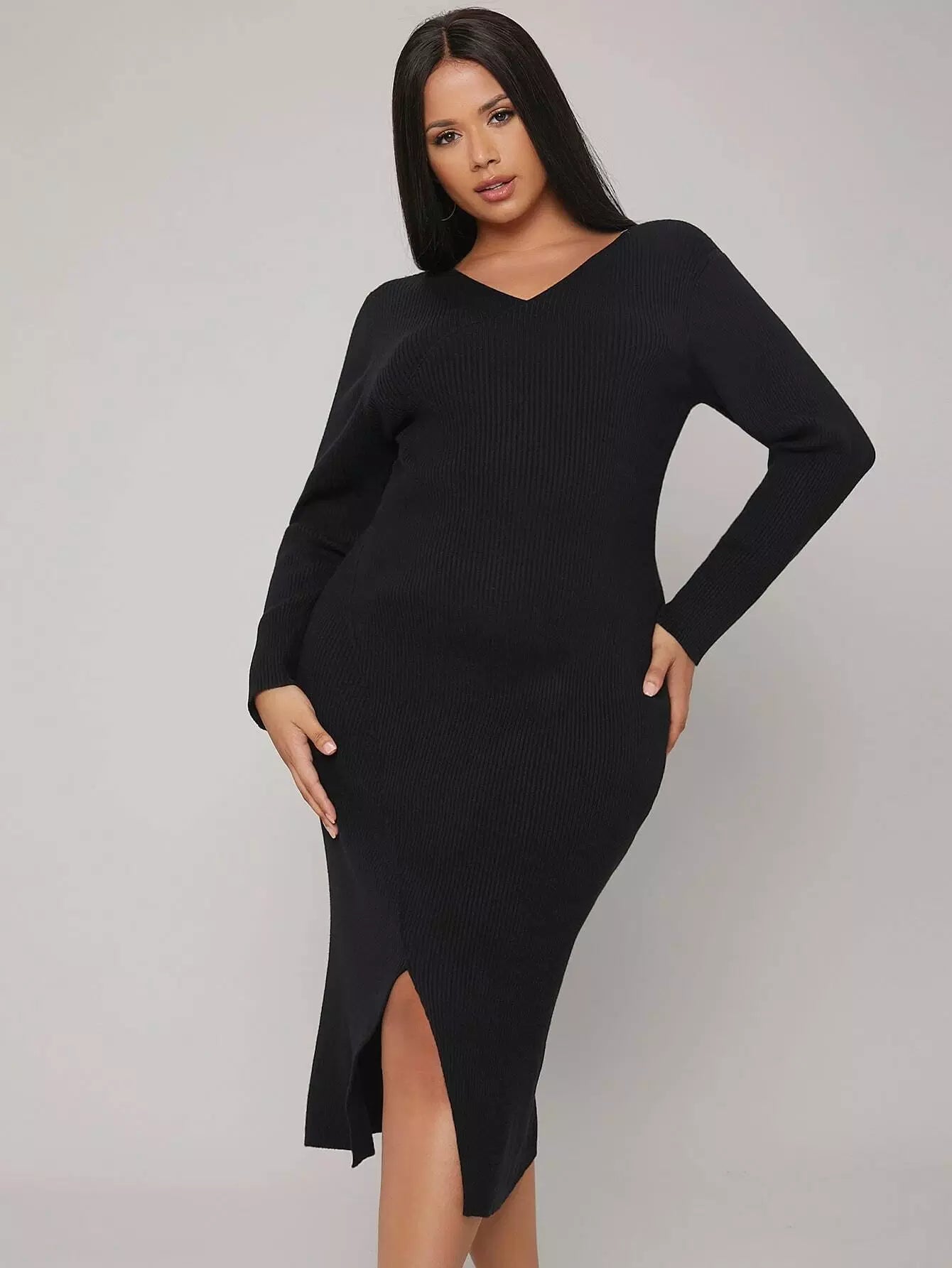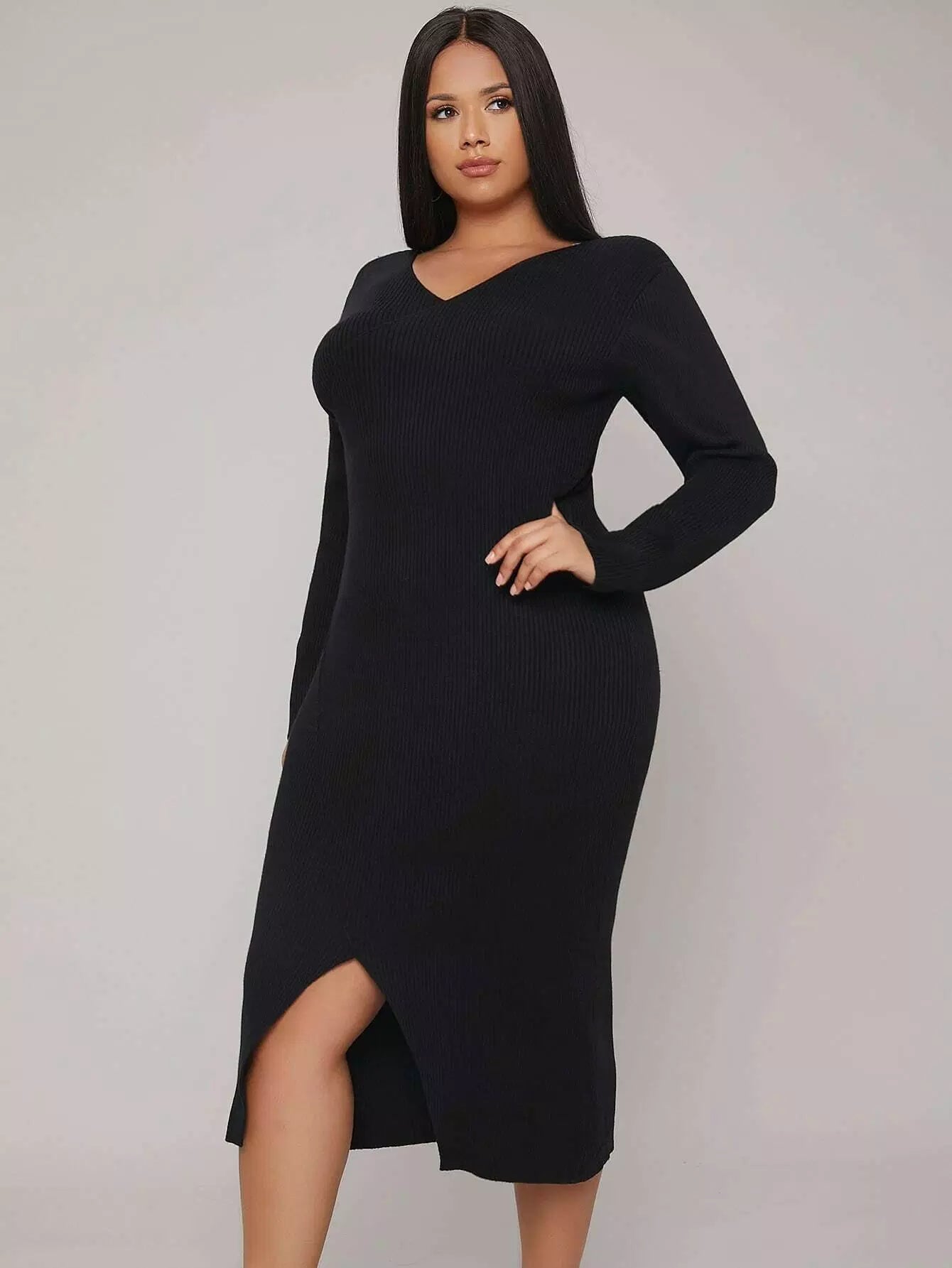 فستان كنزة برقبة على شكل حرف V برقبة على شكل حرف V مضلع مضلع وحافة مشقوقة