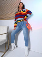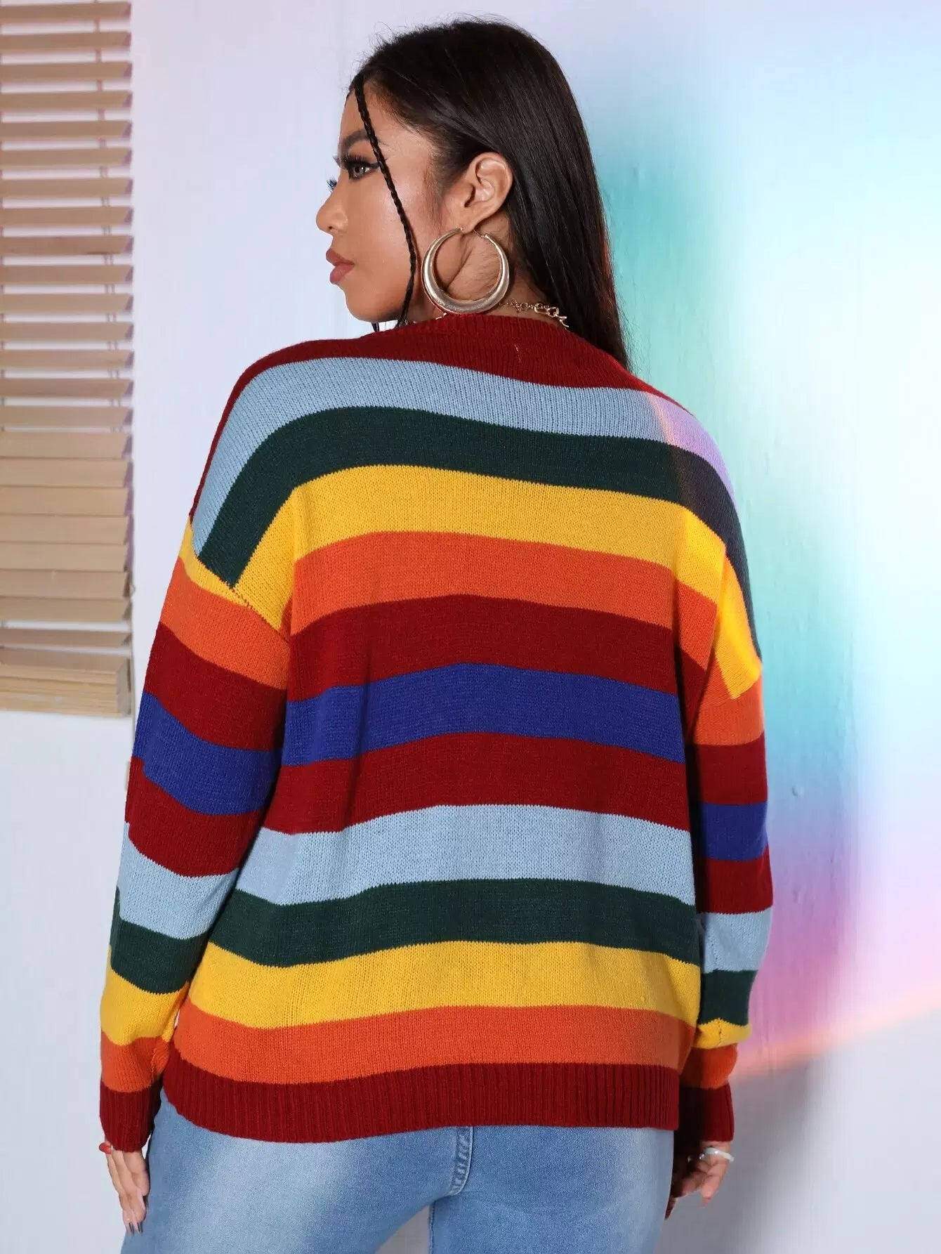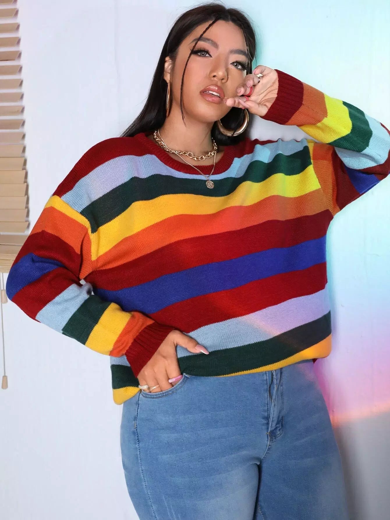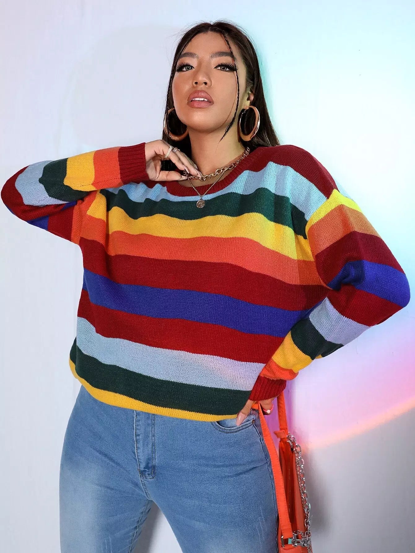 بلس سترة منسدلة الكتف بنقشة قوس قزح مخططة بألوان قوس قزح زائد