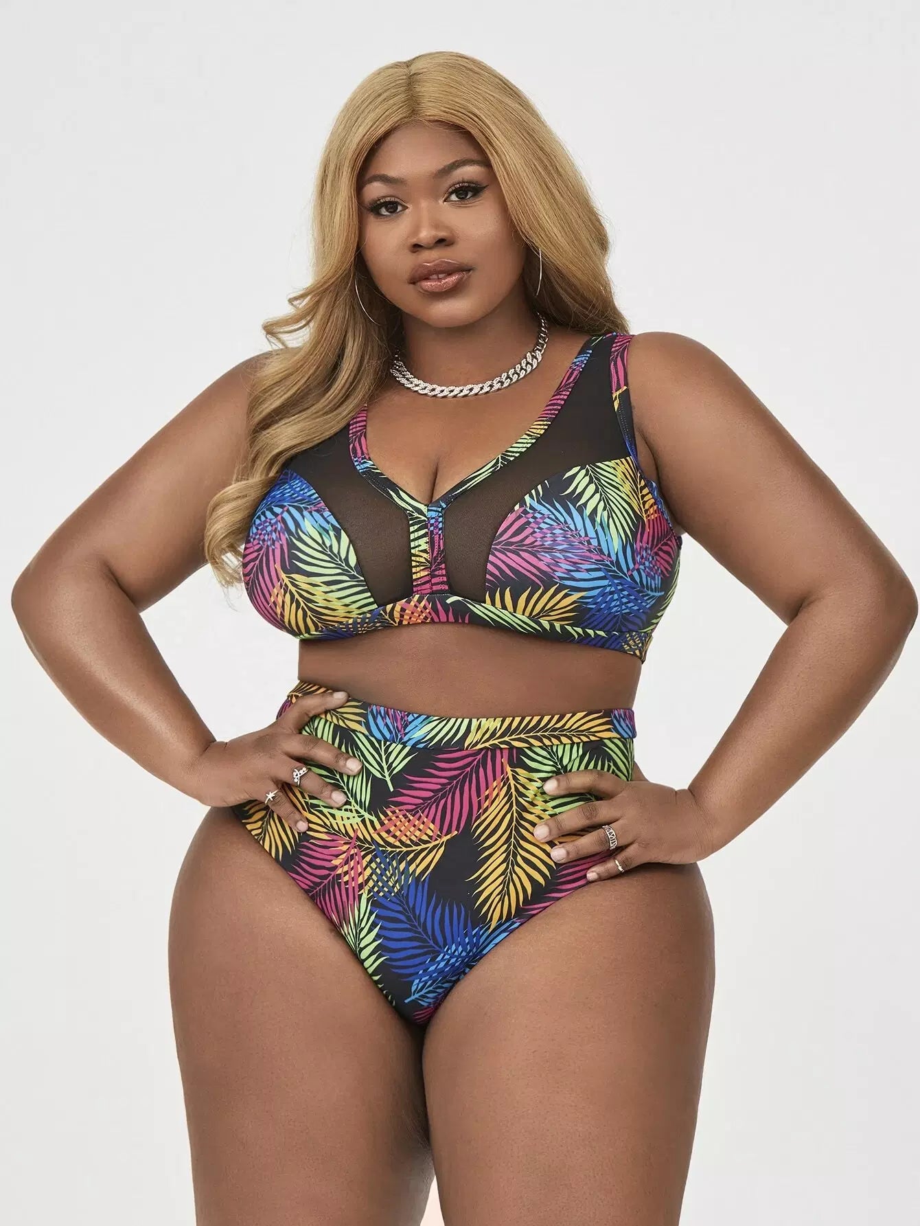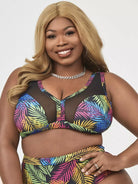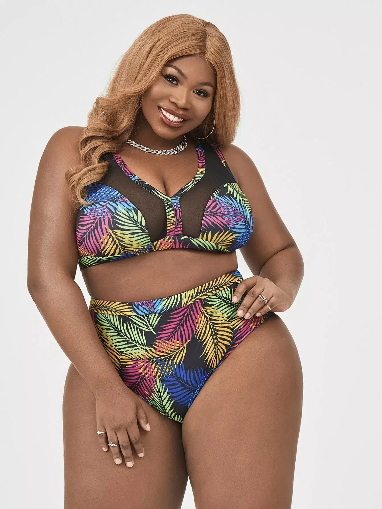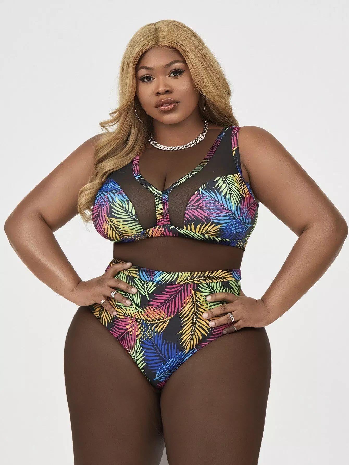 مايوه سباحة بيكيني شبكي بطبعة أوراق النخيل بلس بلون مغاير