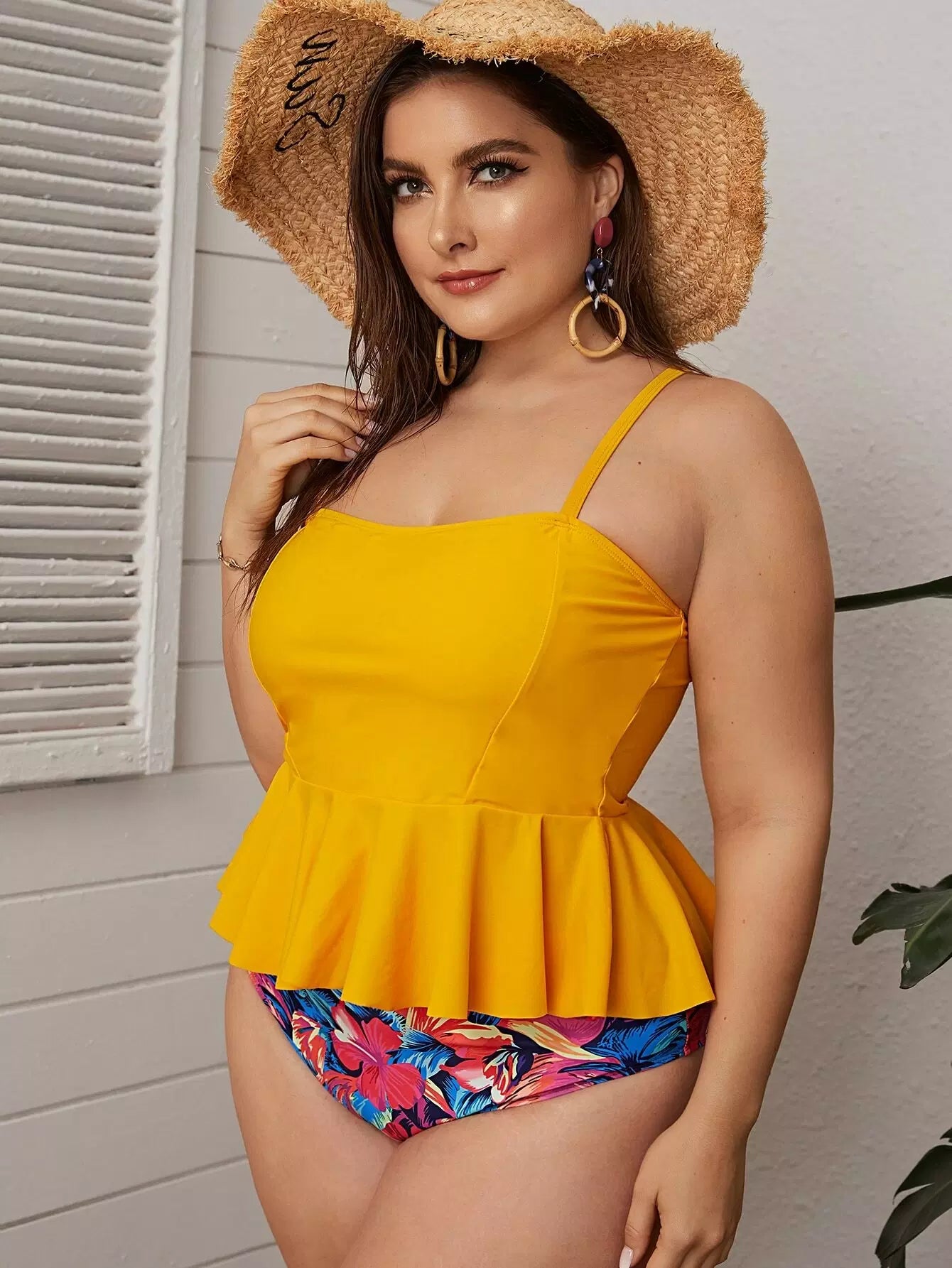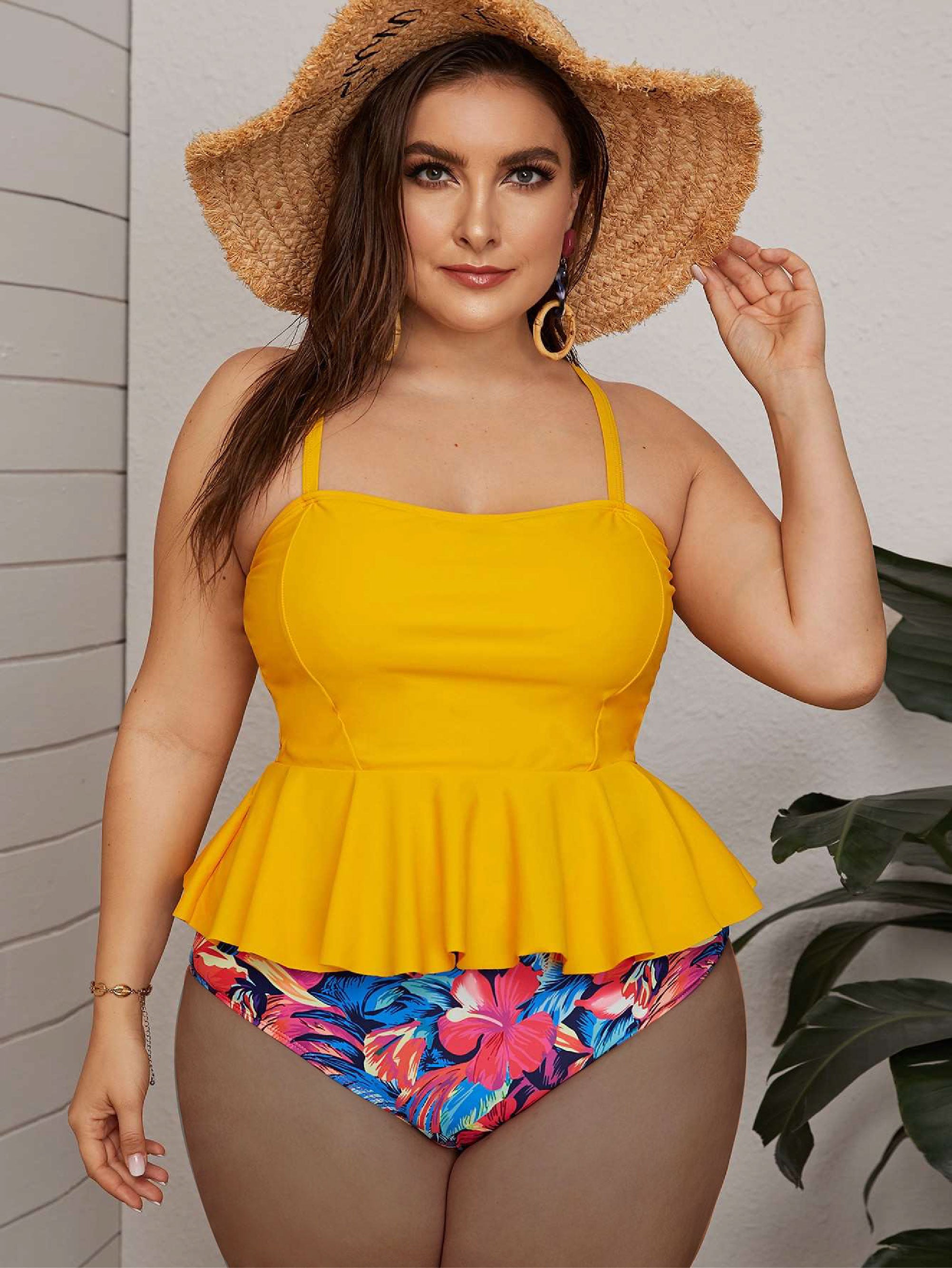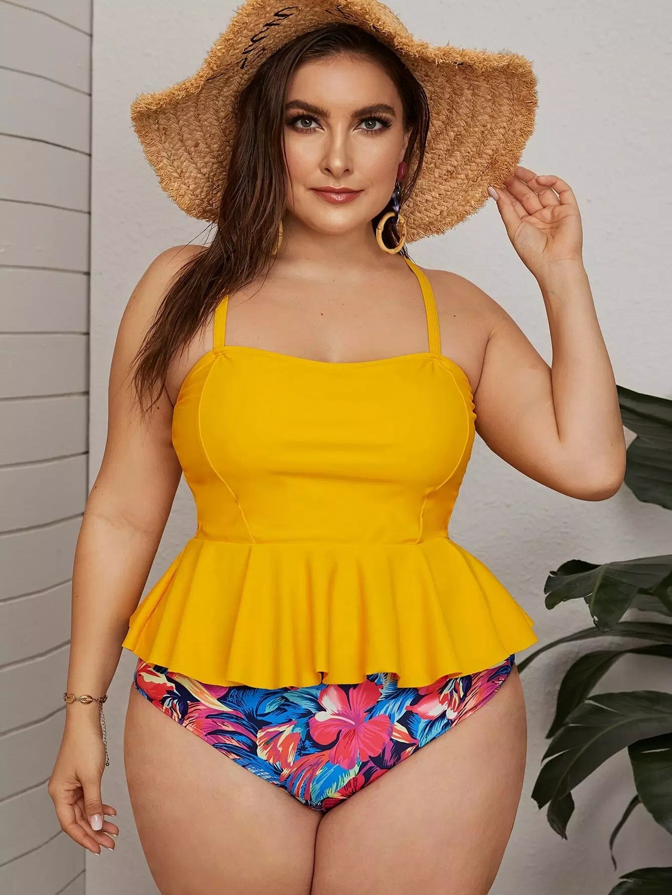نحيف - مقاس كبير كشكش تقليم الأعلى مع ارتفاع تانكيني مخصر