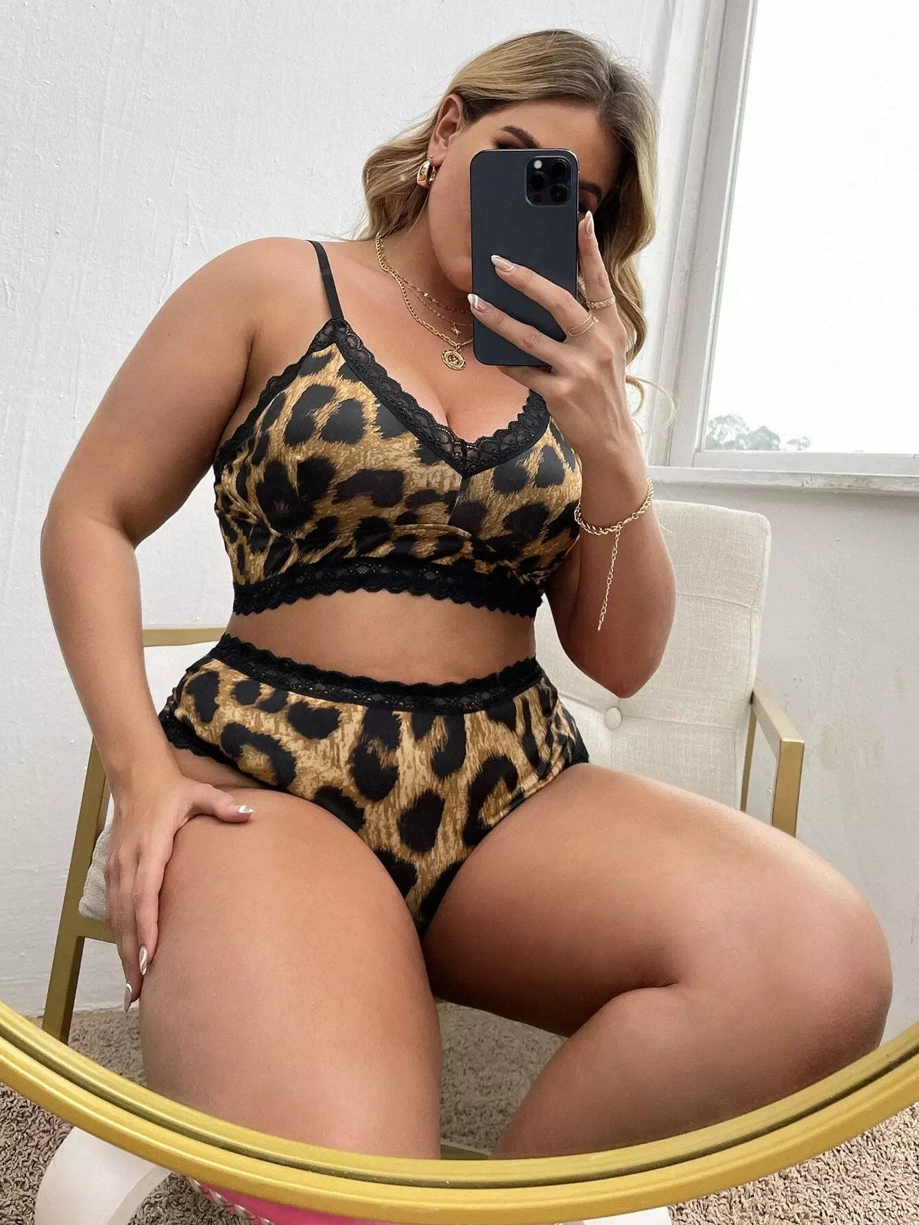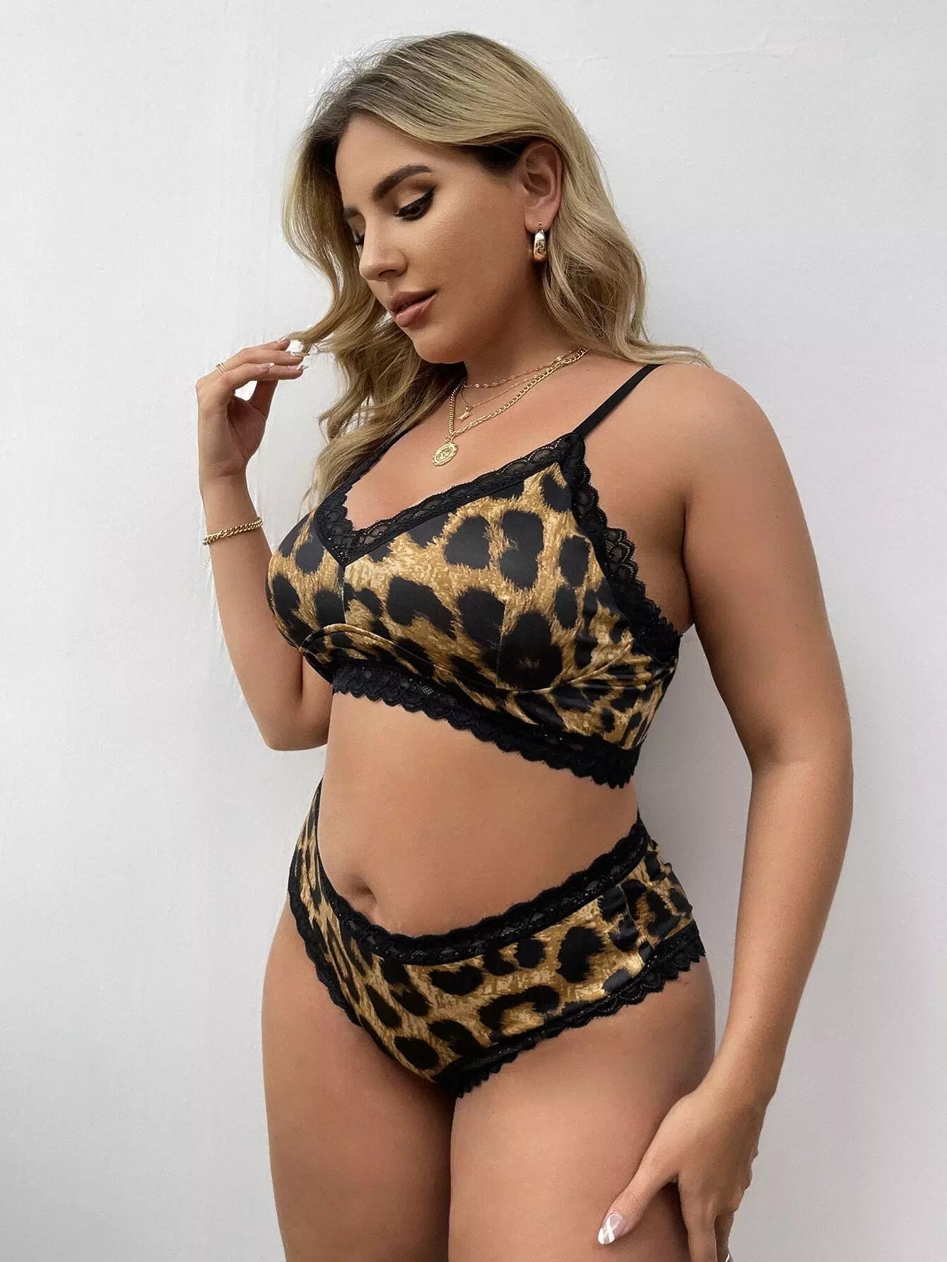 طقم لانجري بحواف من الدانتيل بنقشة جلد الفهد زائد