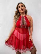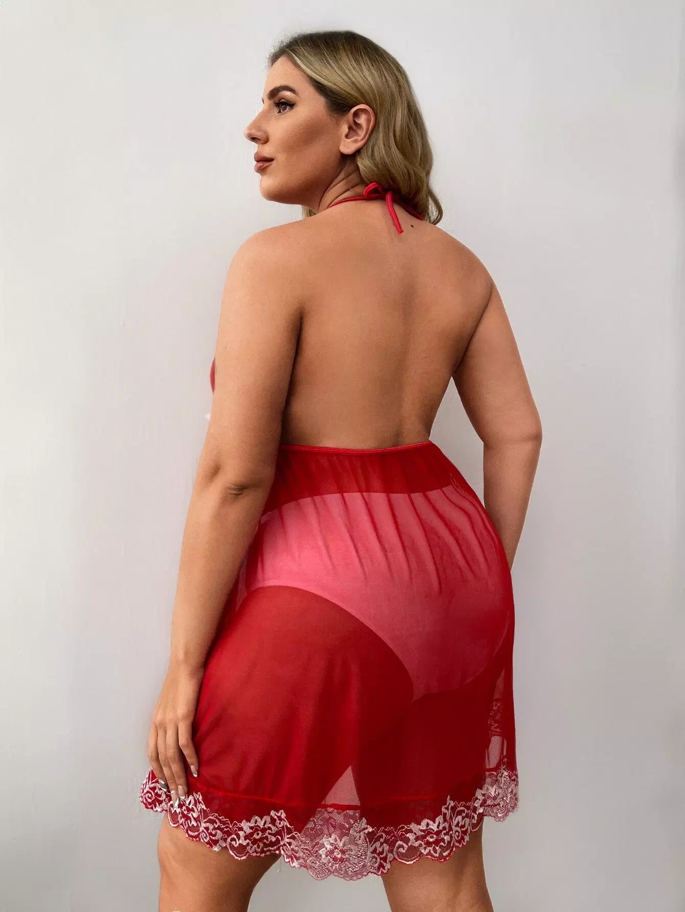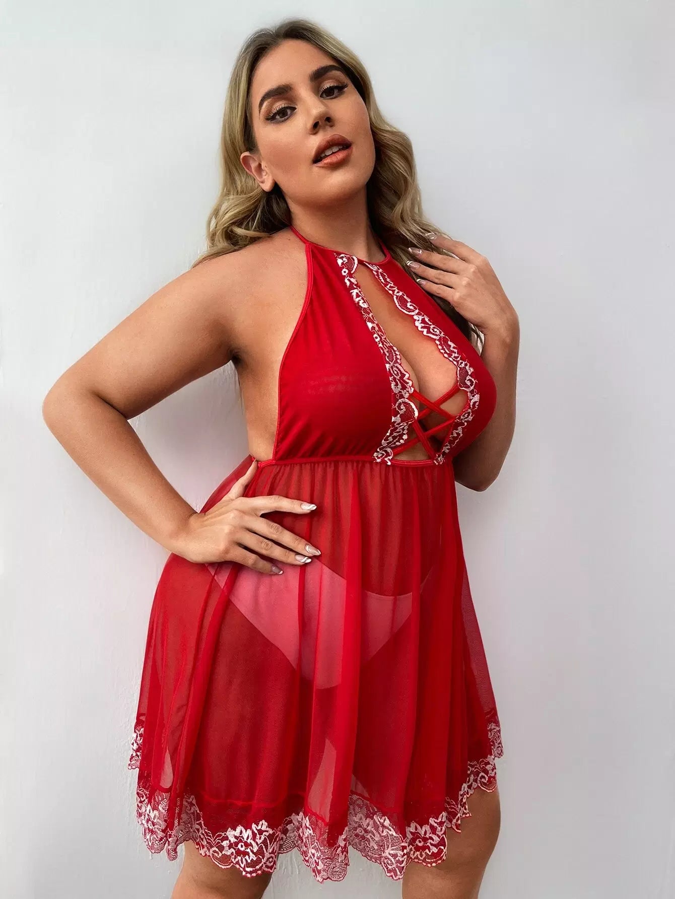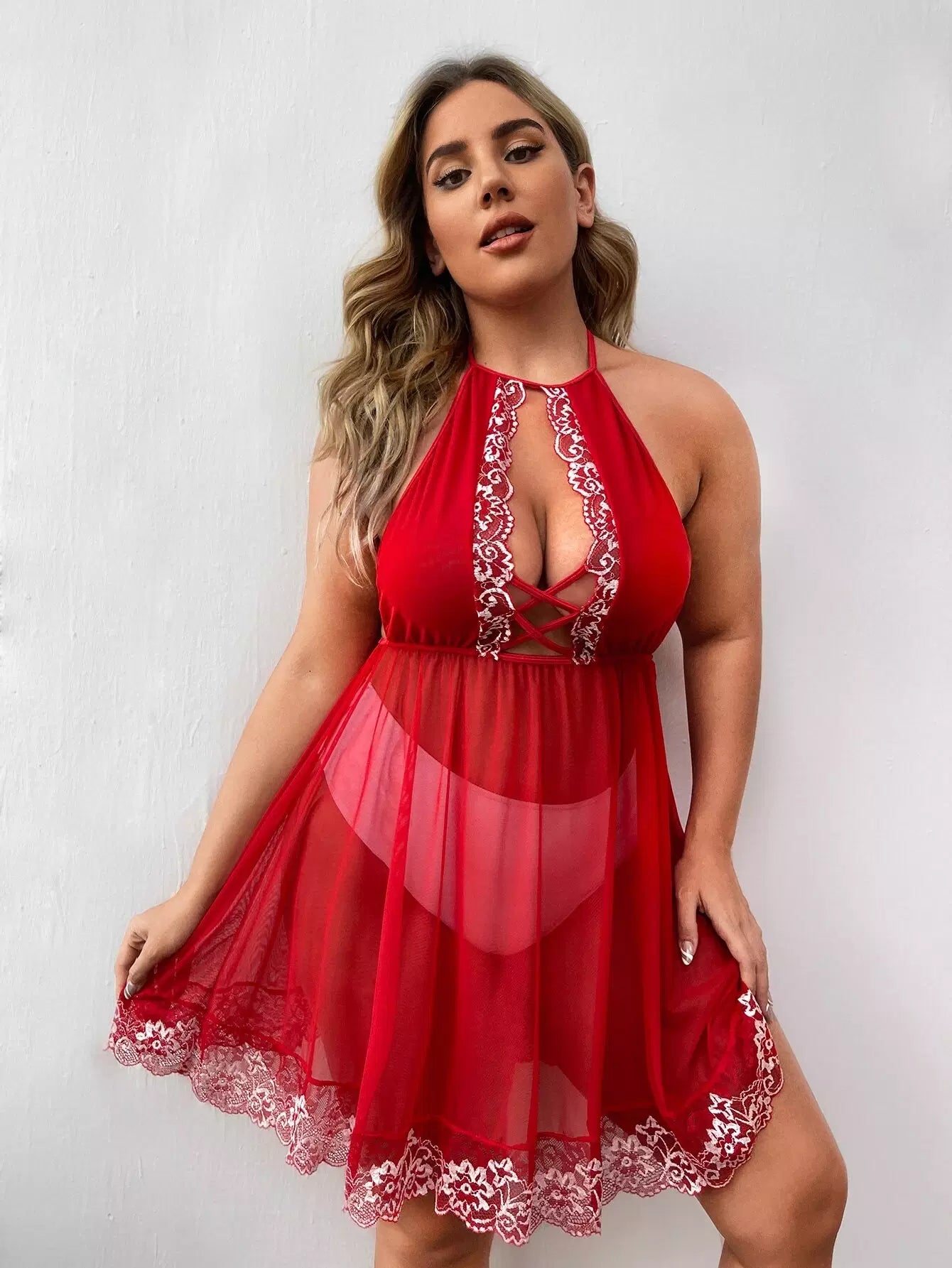 فستان دانتيل زائد بحواف من الدانتيل الشبكي مع رسن شبكي مع ثونغ