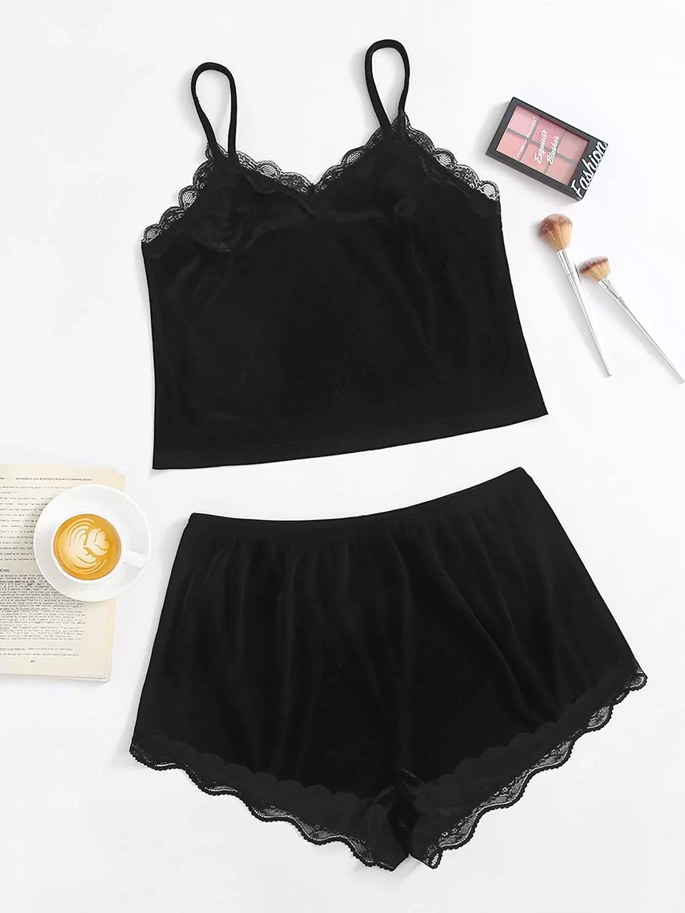 طقم بيجامة بيجامة مخملي دانتيل بلون مغاير بلون مغاير