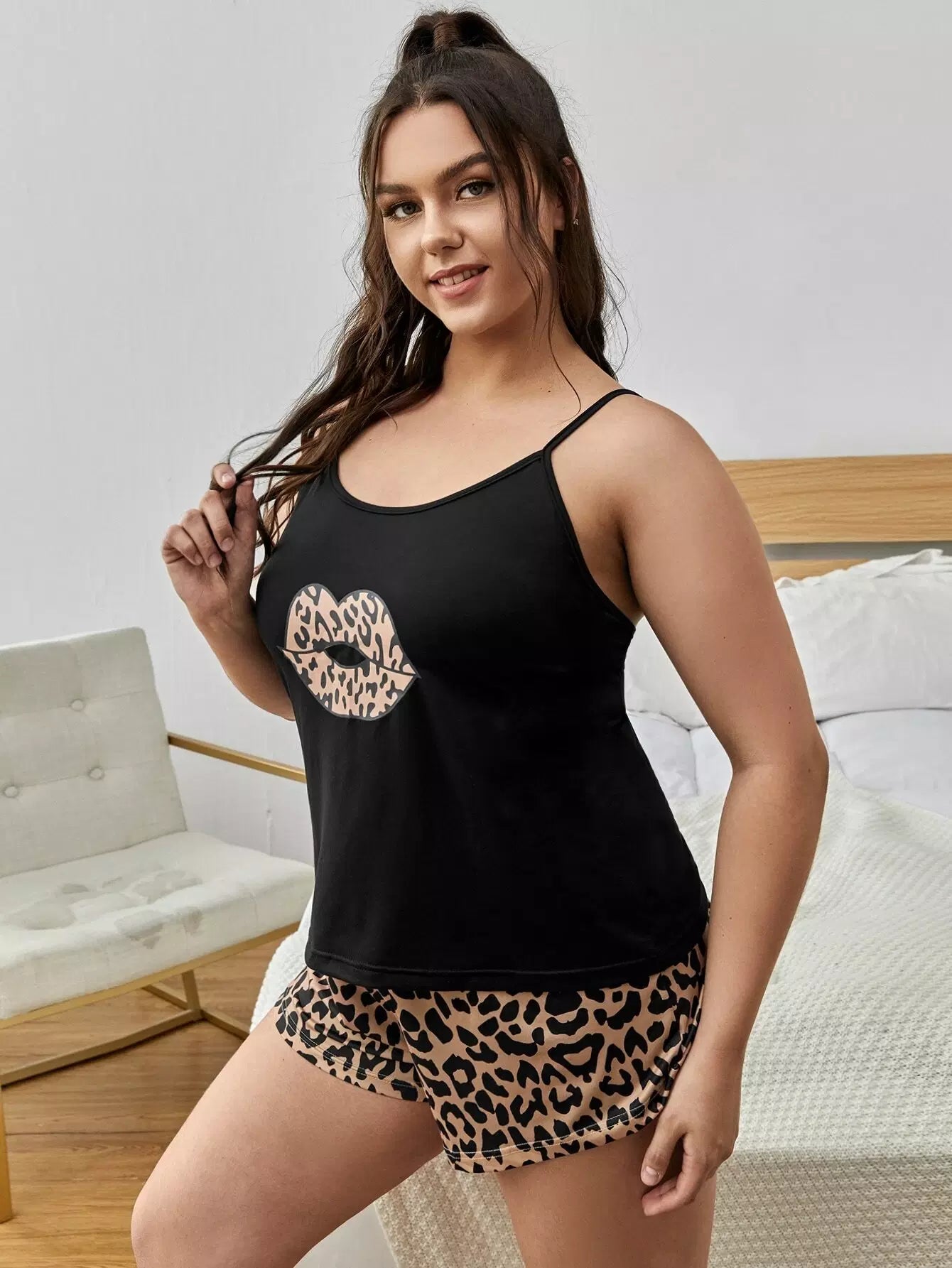 طقم بيجامة بطبعة شفاه زائد مع غطاء للعينين