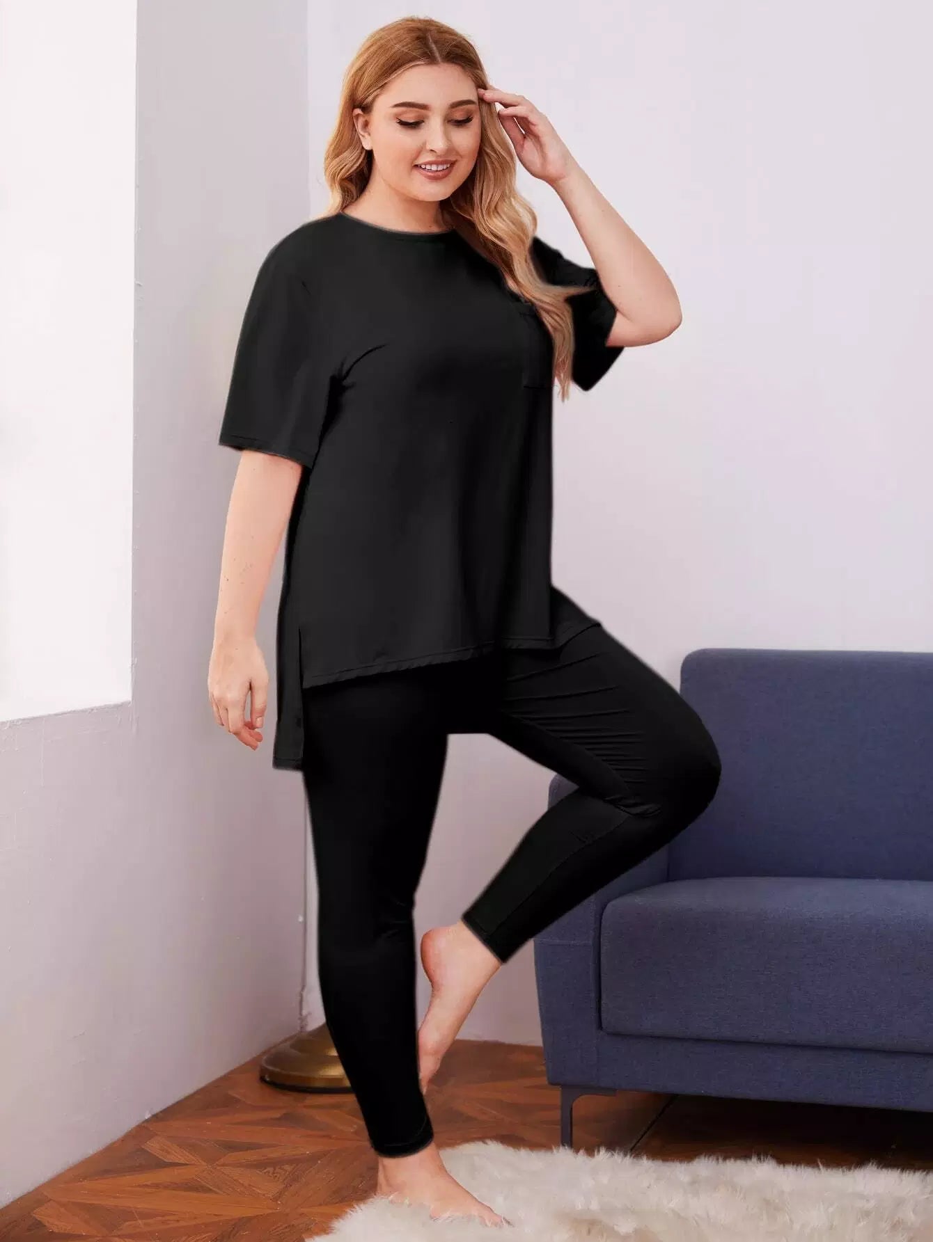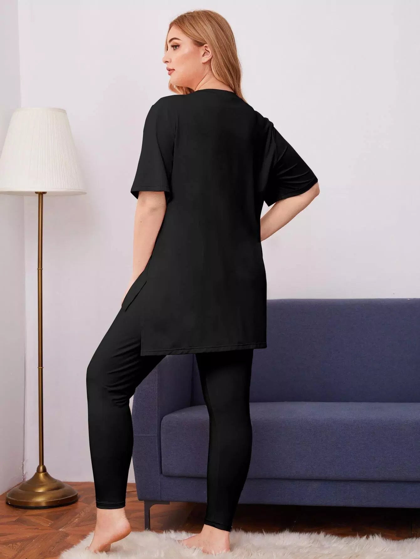 طقم تي شيرت بحافة سادة منقسمة مع بنطال بيجامة