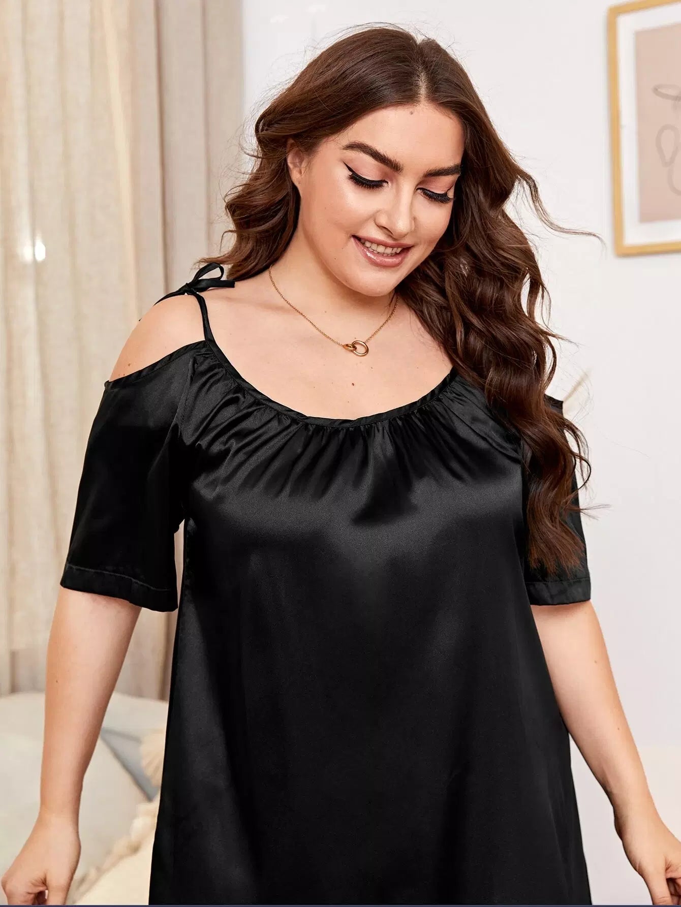 نحيف - مقاس كبير فستان نوم من الساتان بحاشية مكشكشة على الكتف البارد