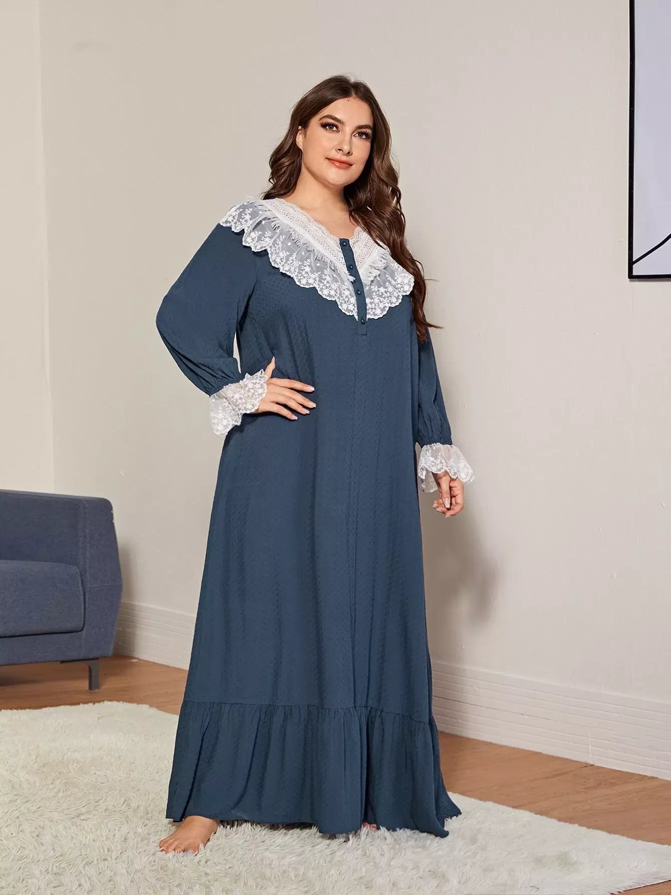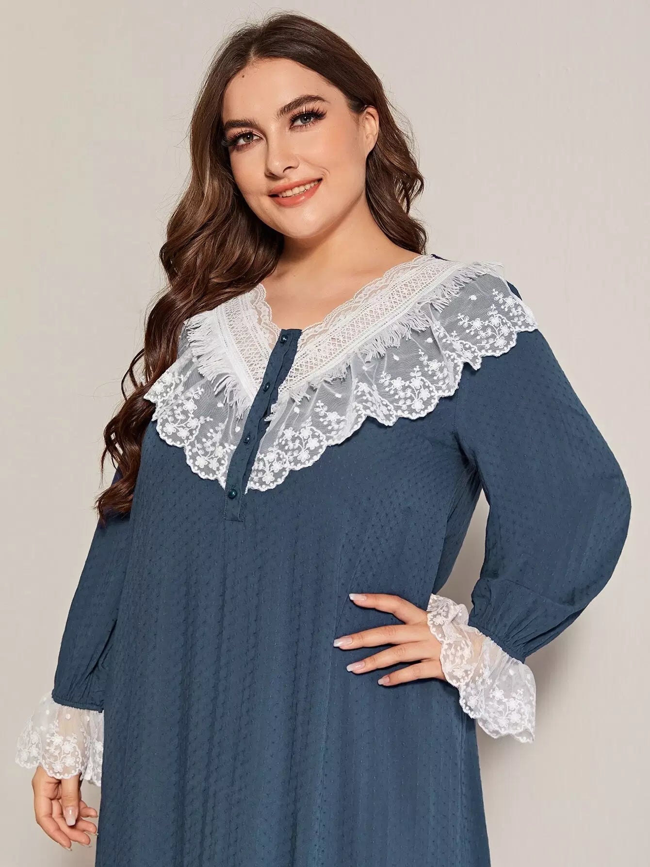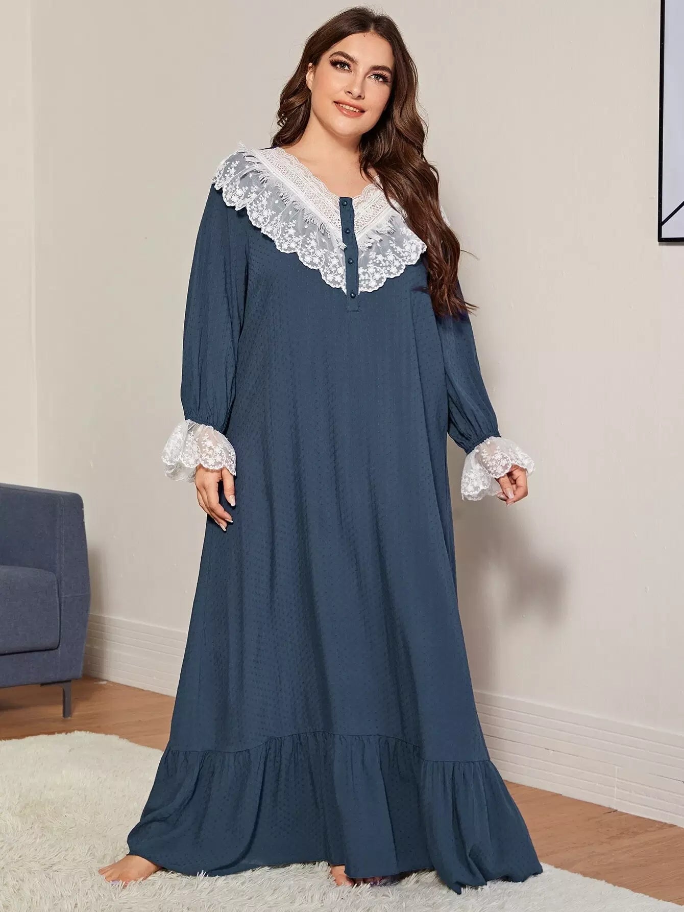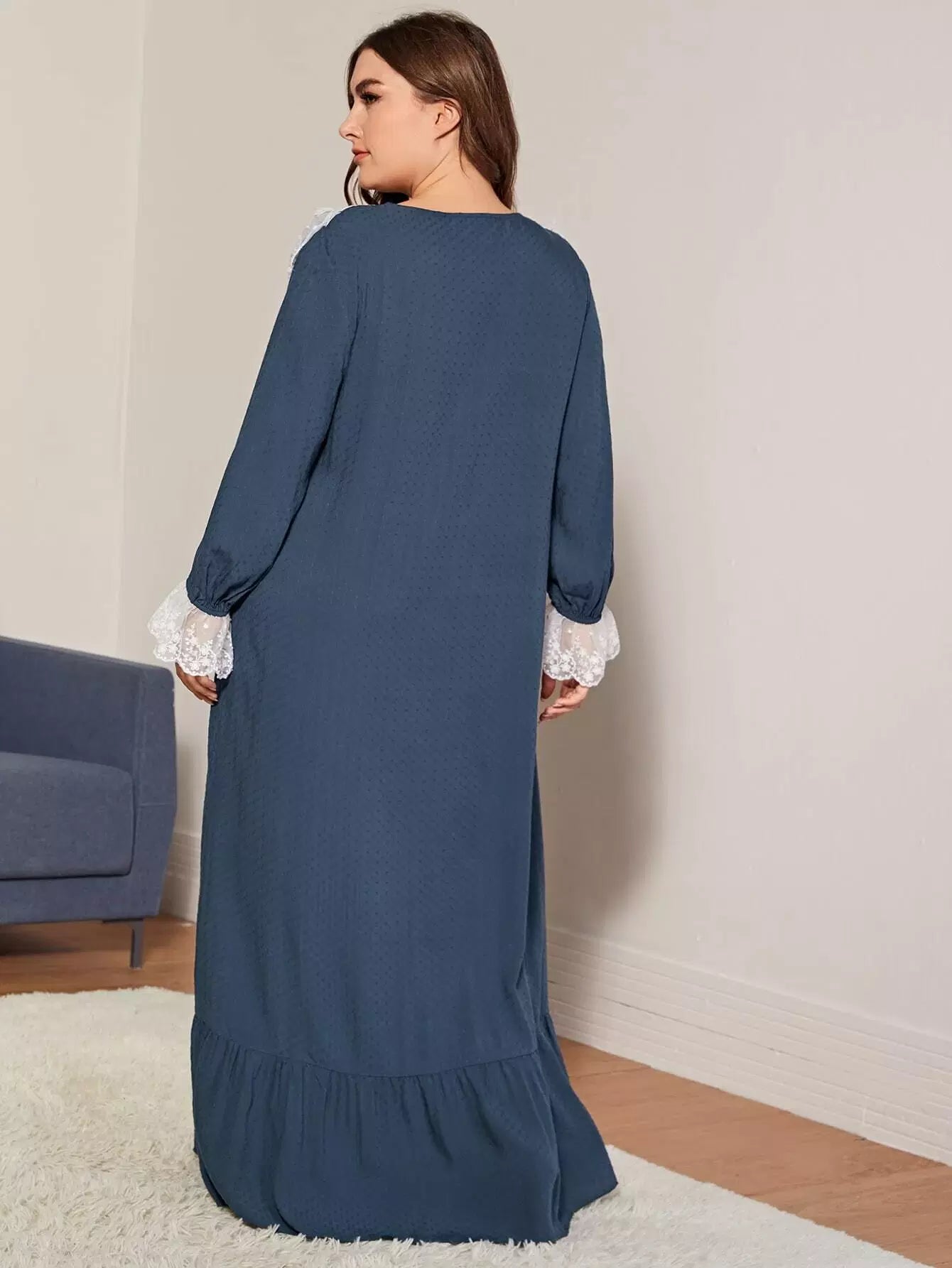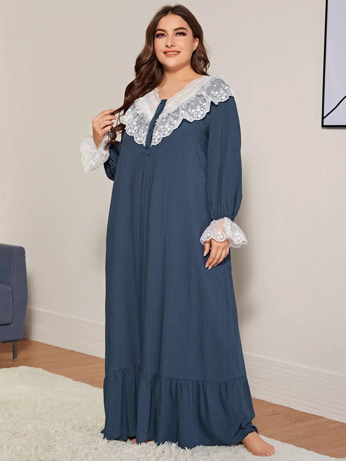 فستان نوم مزين بتطريزات شبكية مكشكشة بلون مغاير
