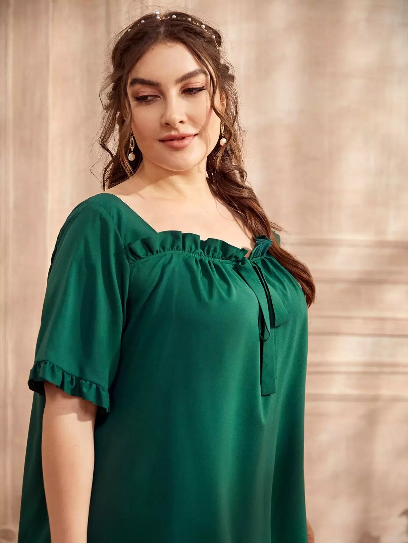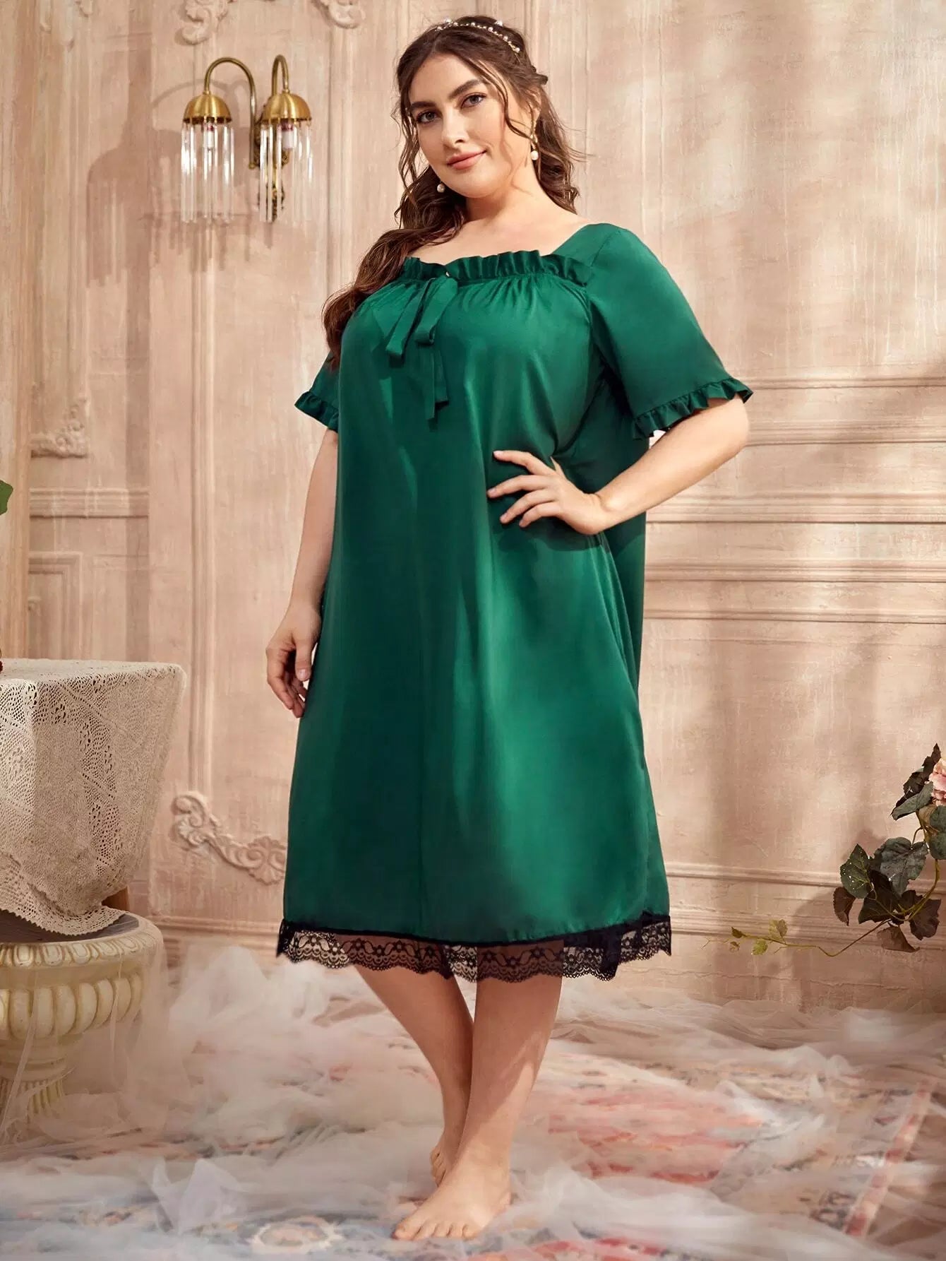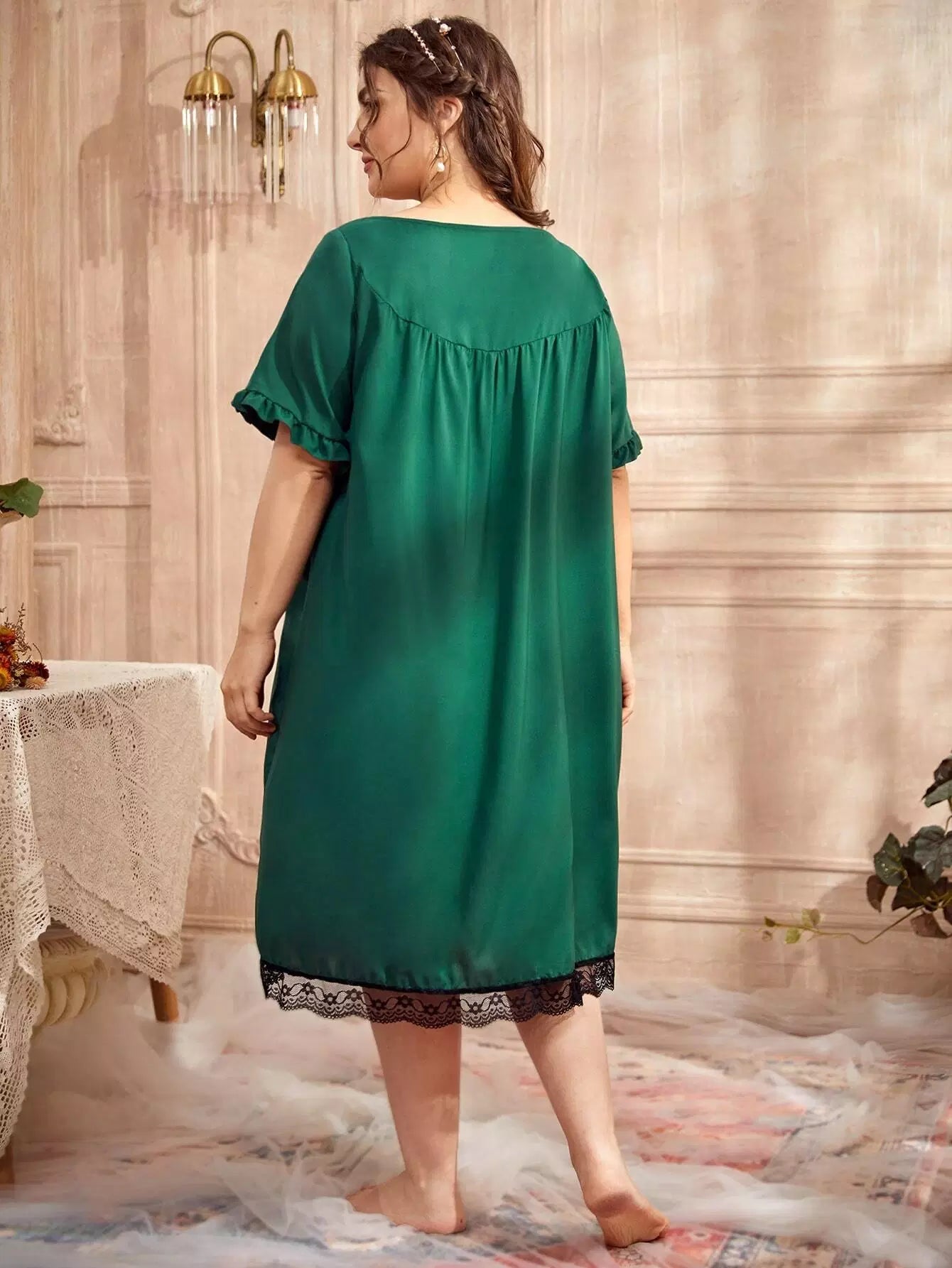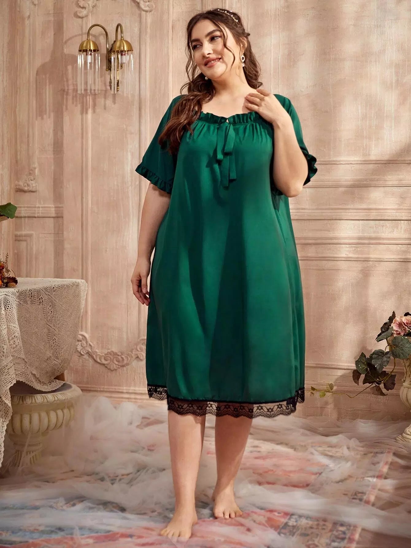 فستان نوم من الدانتيل بحواف كشكش أمامي بفتحة أمامية بلون مغاير