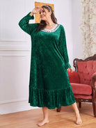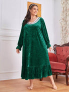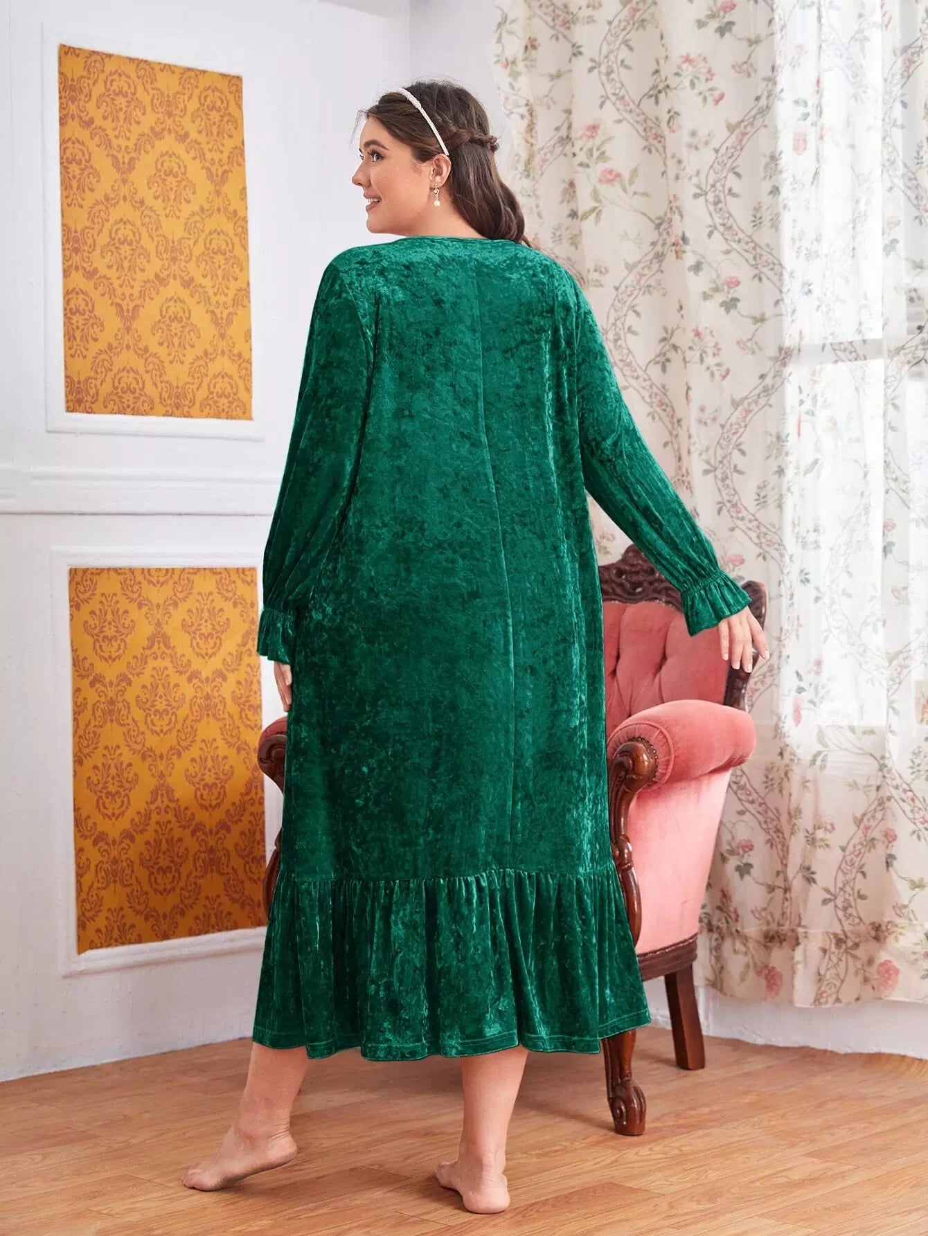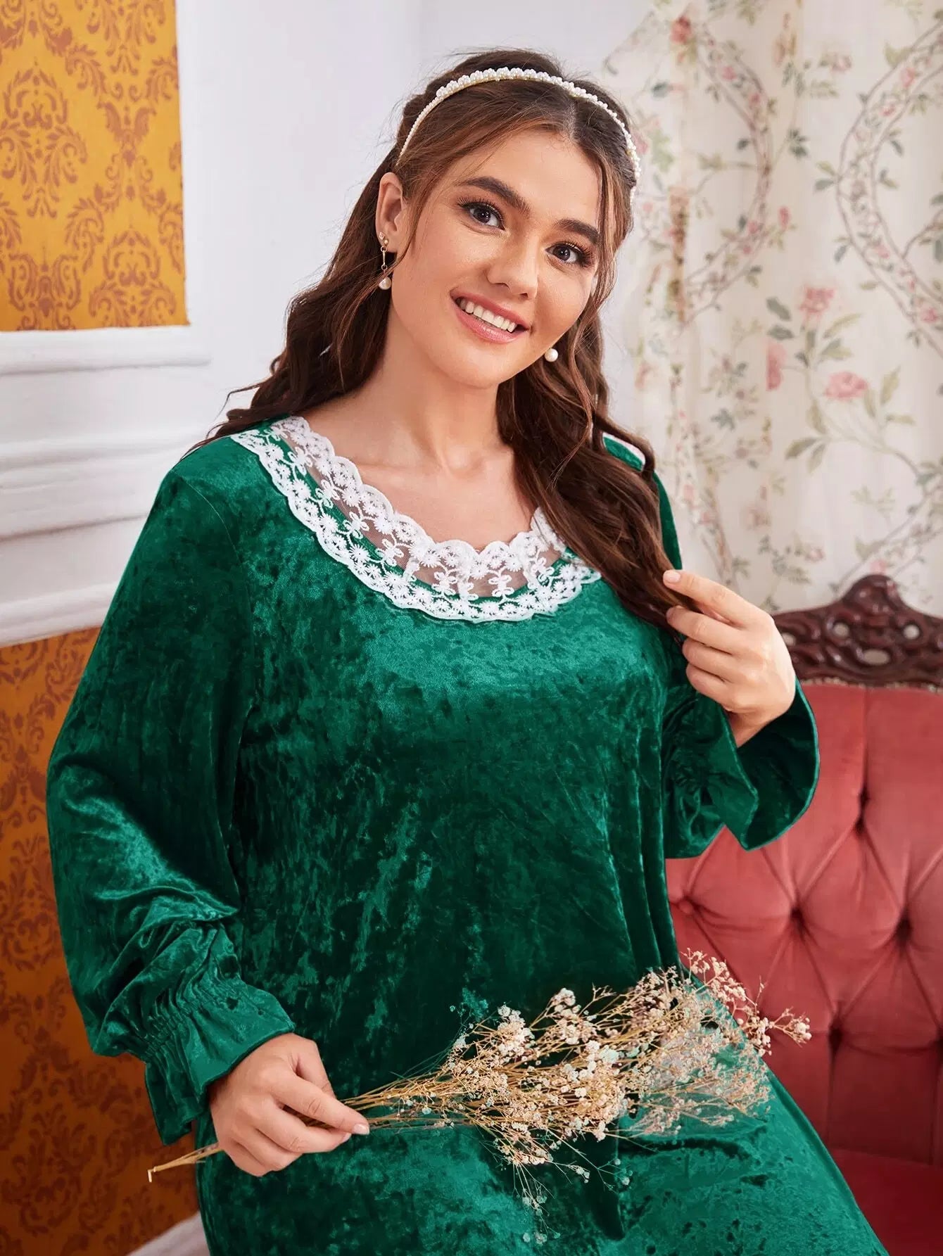 فستان نوم بأكمام من الدانتيل المزين بحواف مخملية مكشكشة من الدانتيل