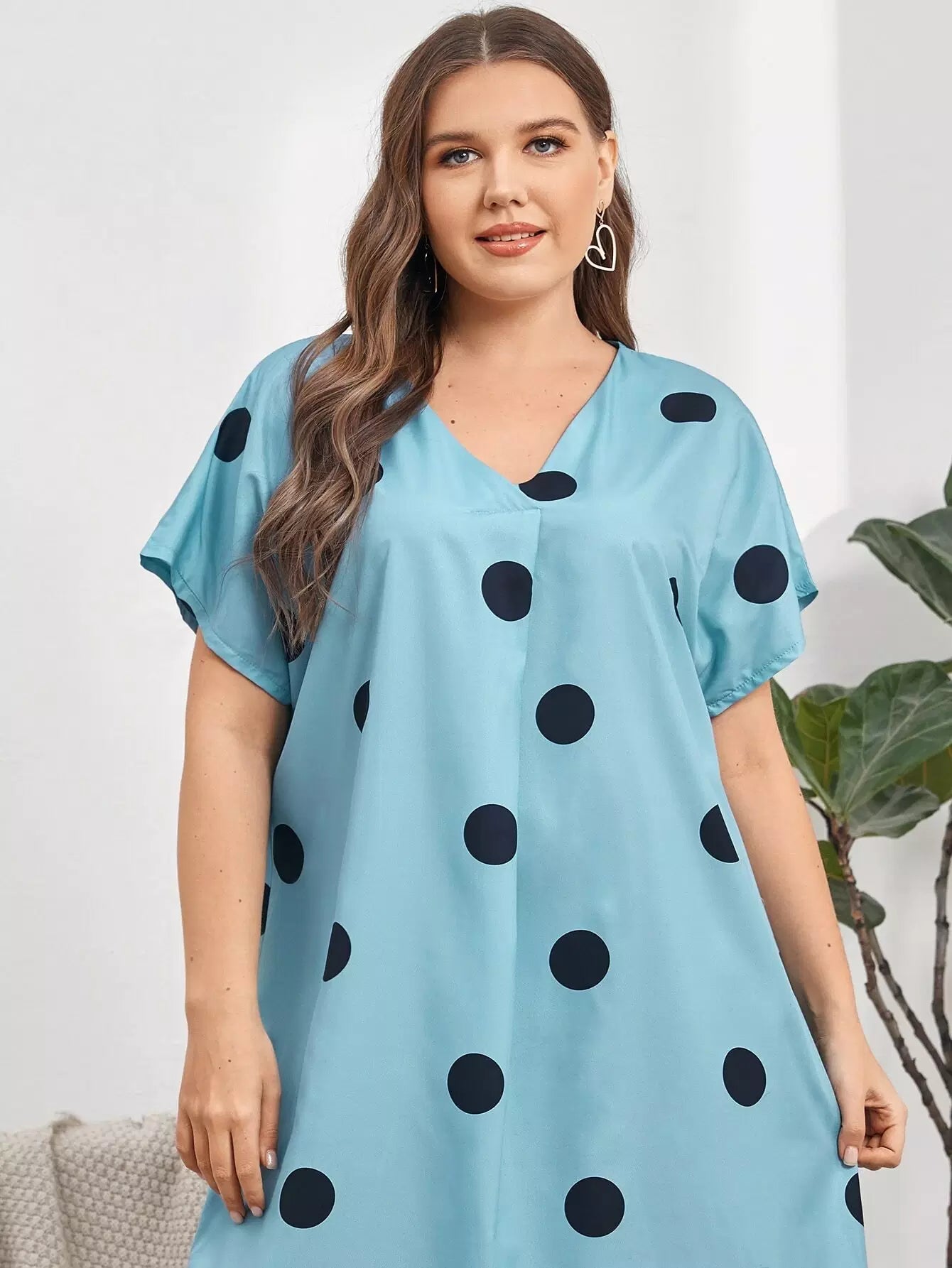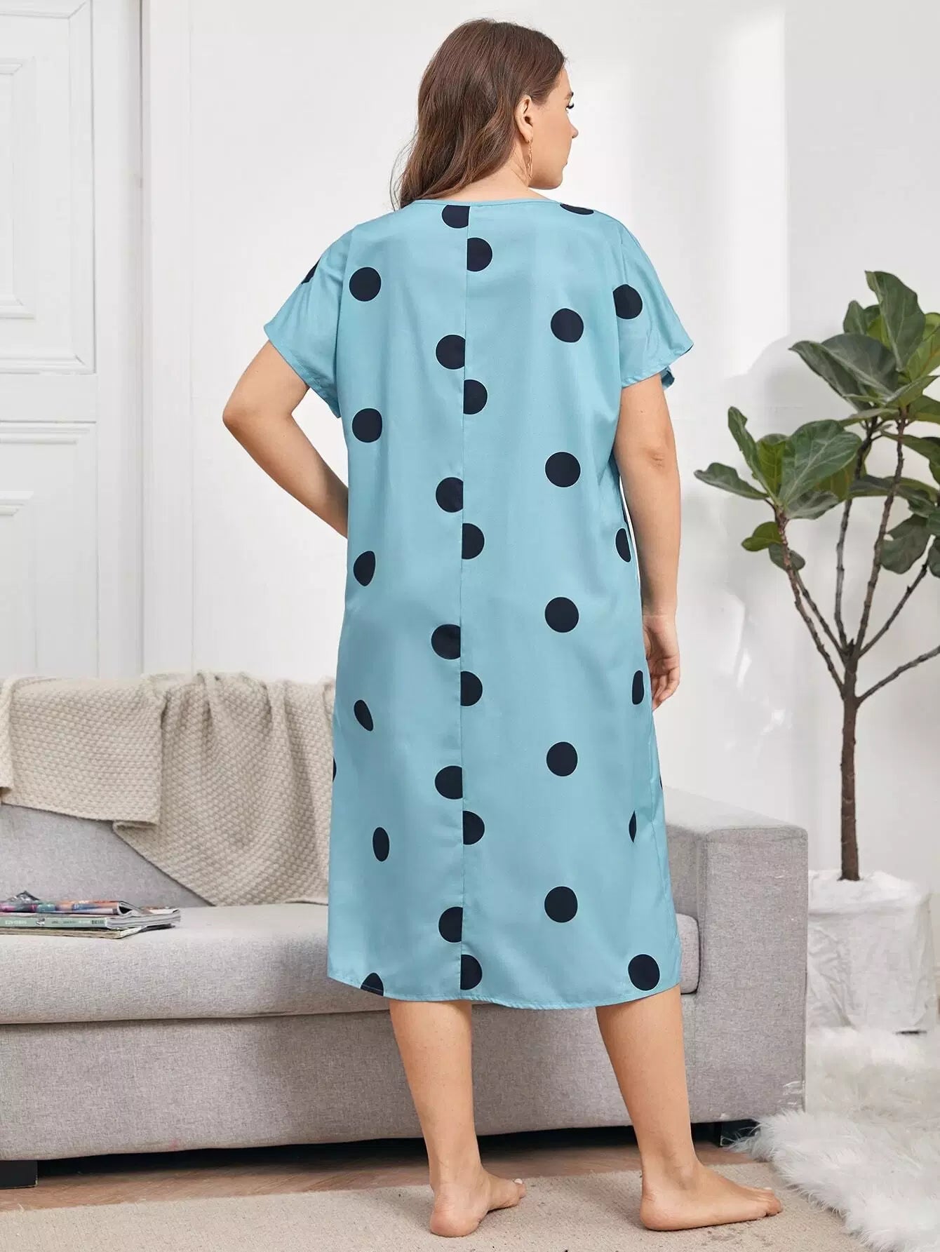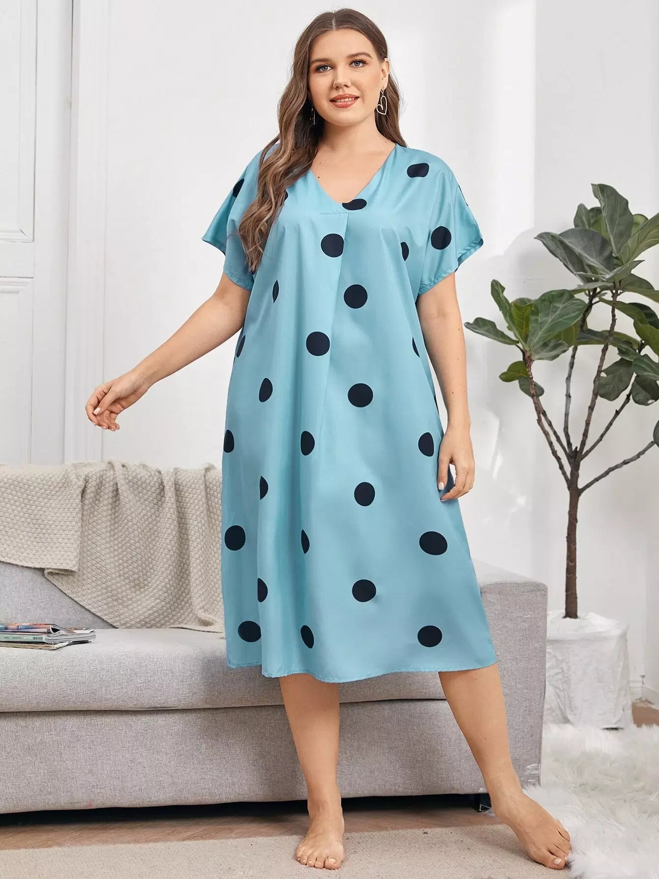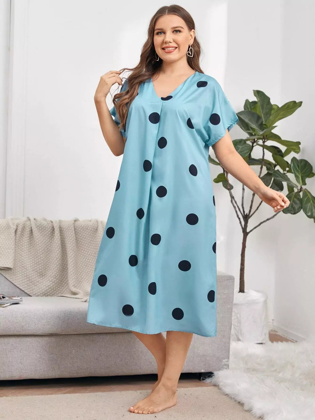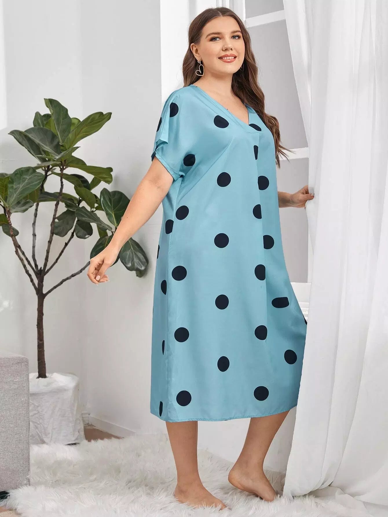 فستان نوم بأكمام منقطة على شكل V برقبة على شكل حرف V