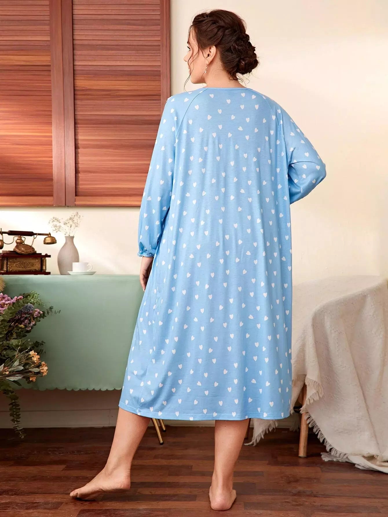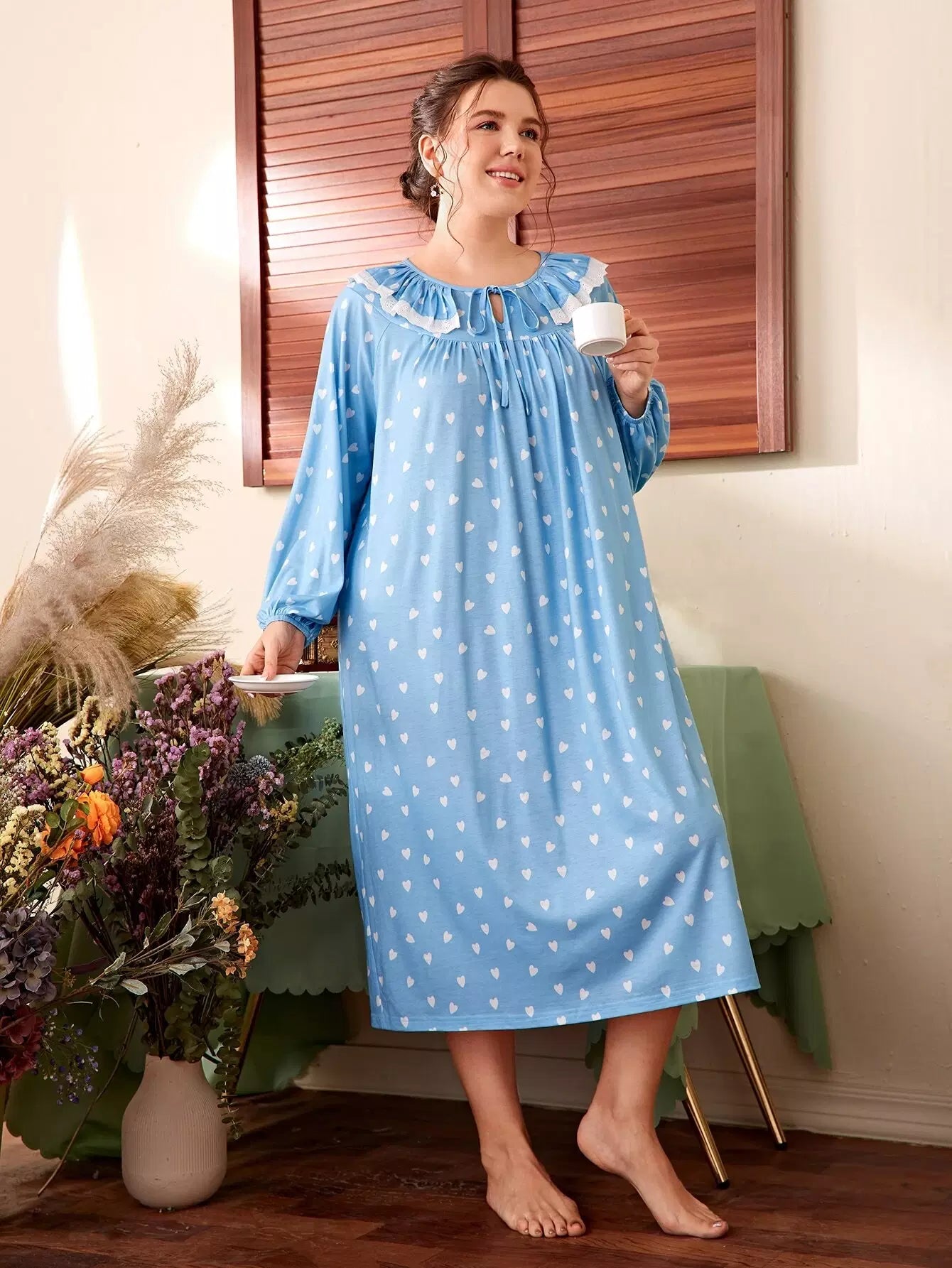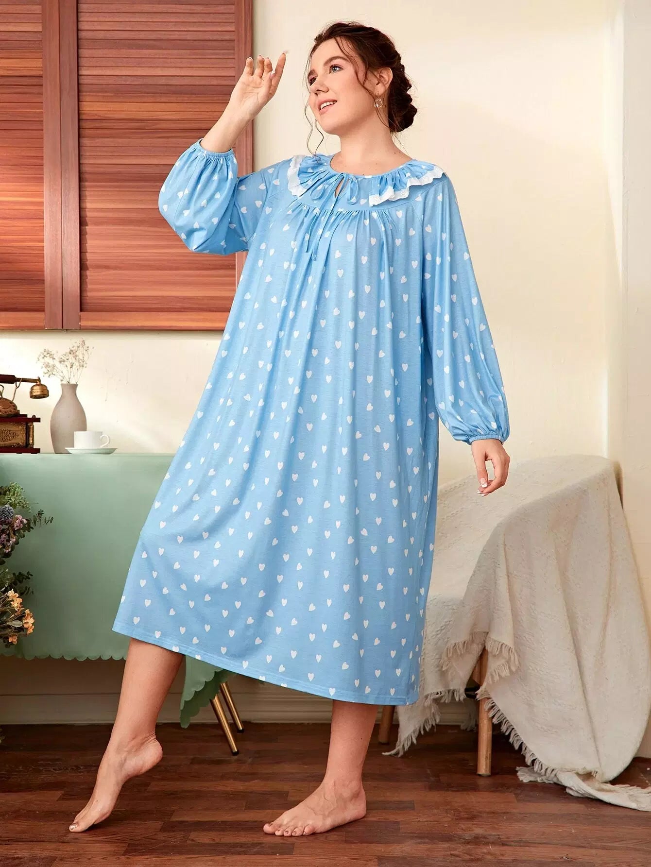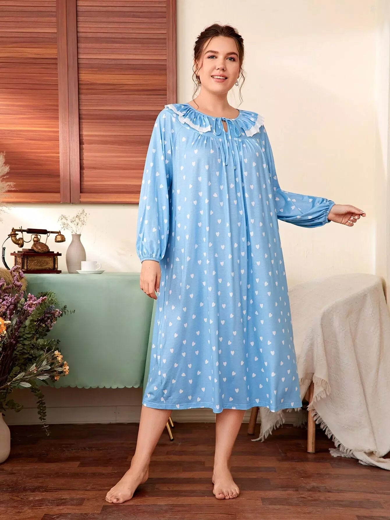 فستان نوم مزين بكشكش مزين بربطة عنق على شكل قلب مطبوع على شكل قلب