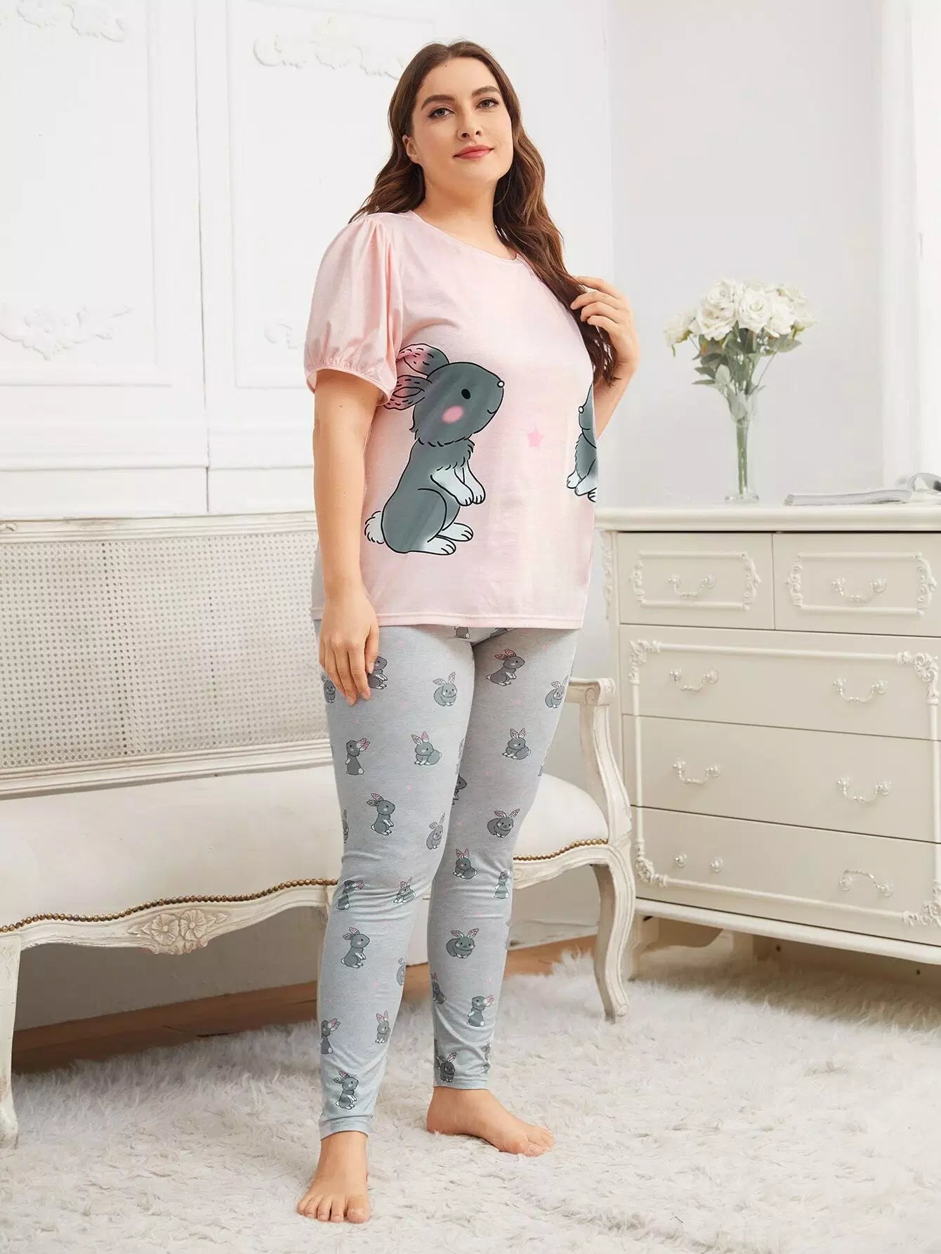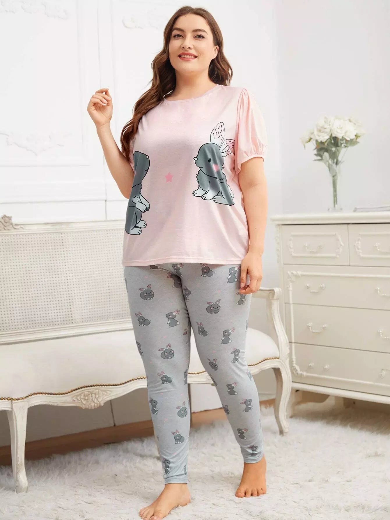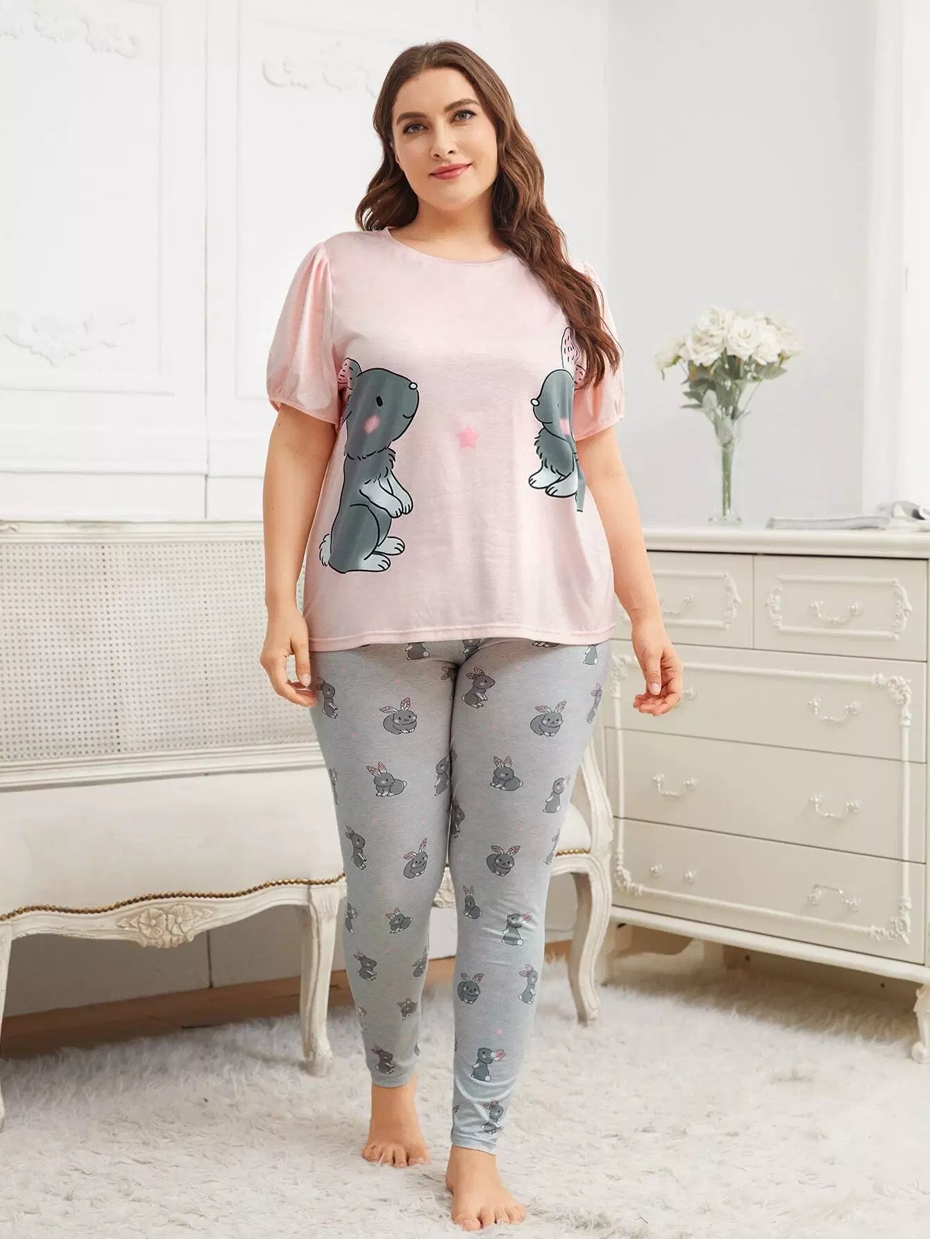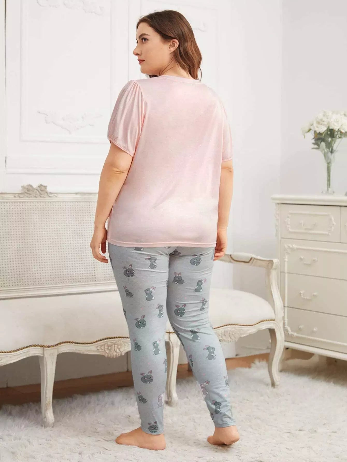 طقم بلوزة وبنطال بيجامة بأكمام منفوشة برسومات كرتونية زائد