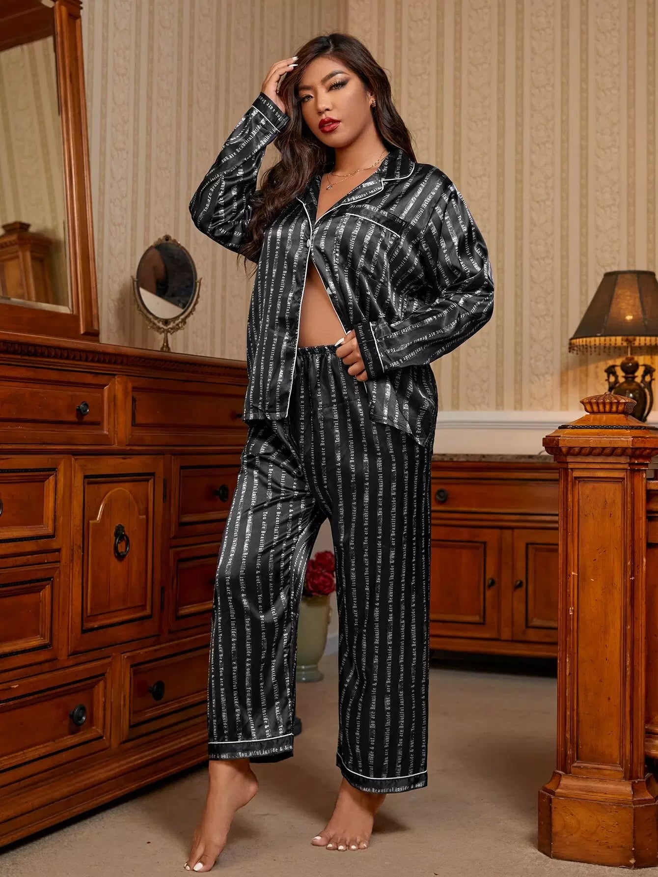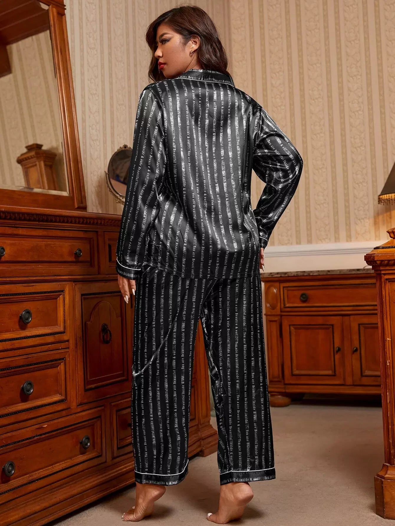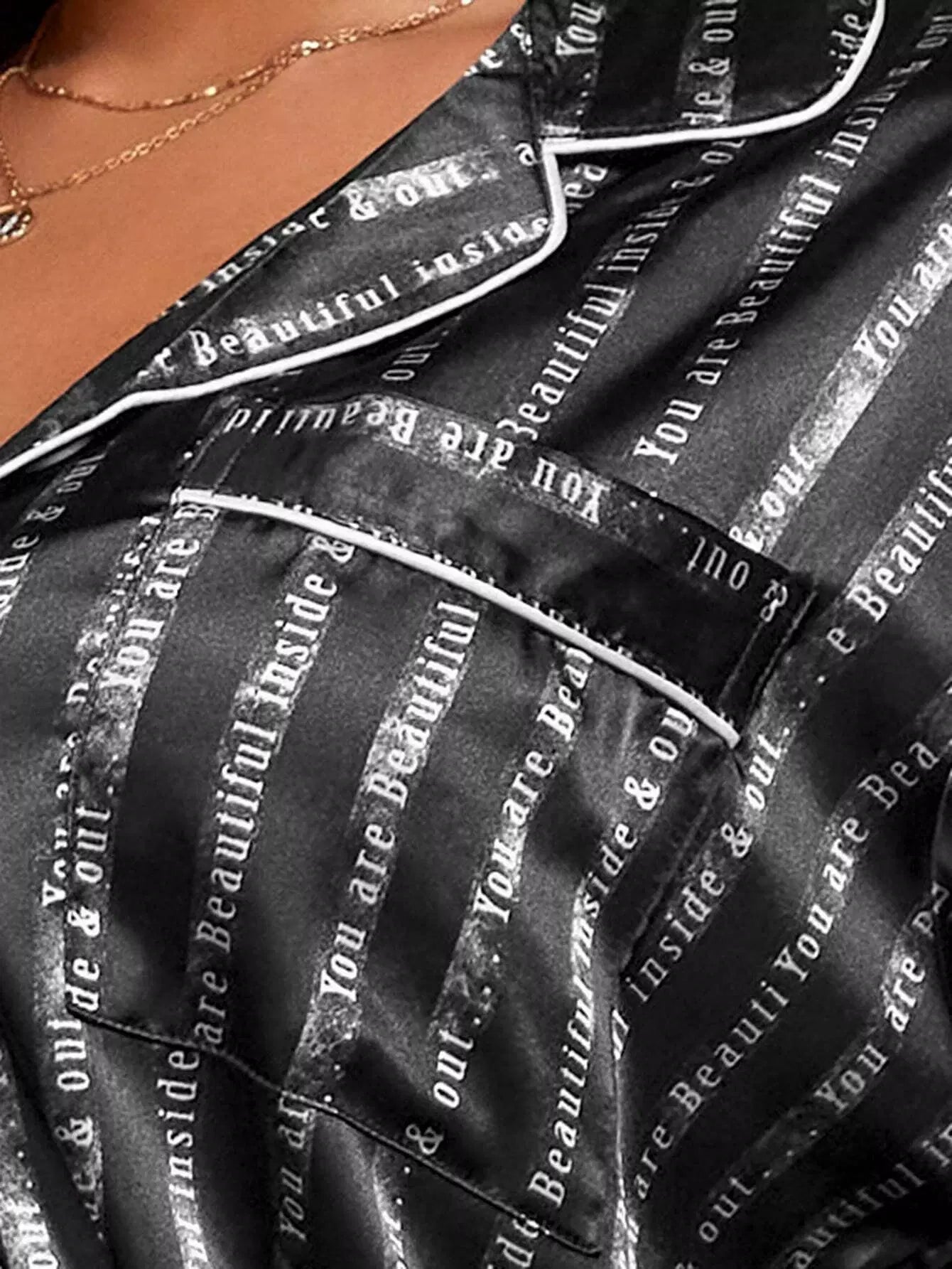 طقم بيجامة ساتان مرقع بجيب من الساتان مزين بشعار بلس