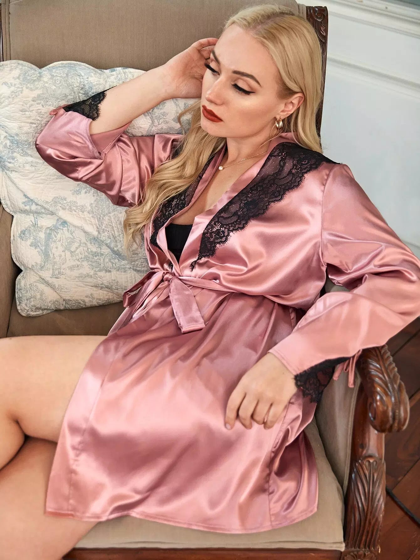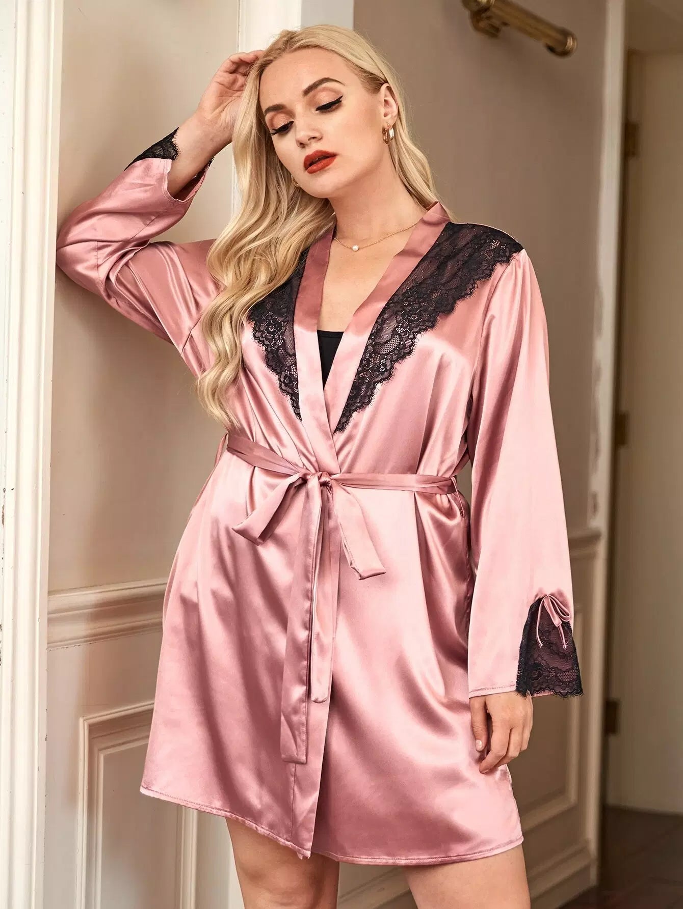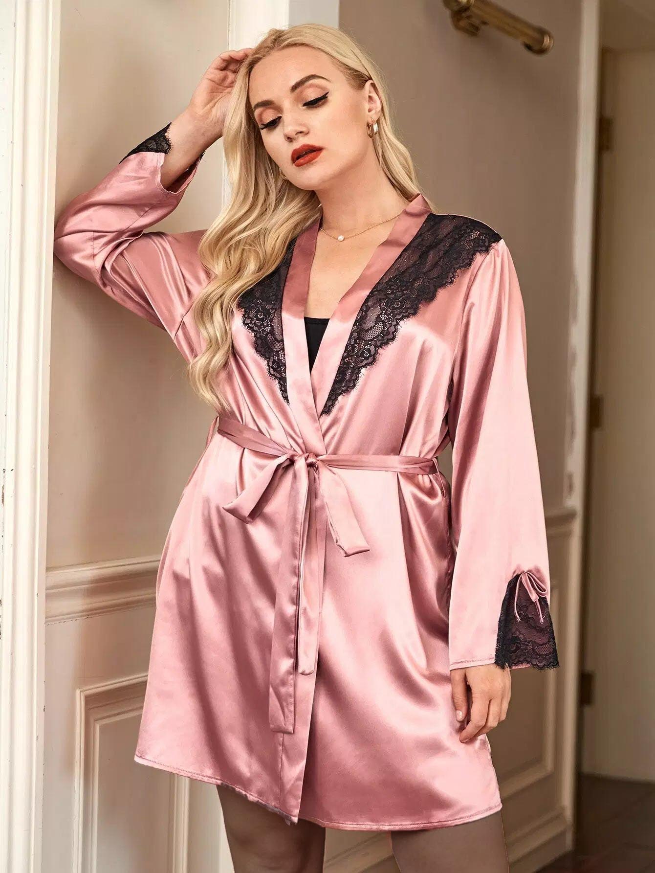 بالإضافة إلى رداء ساتان من الدانتيل المتباين بدون حزام