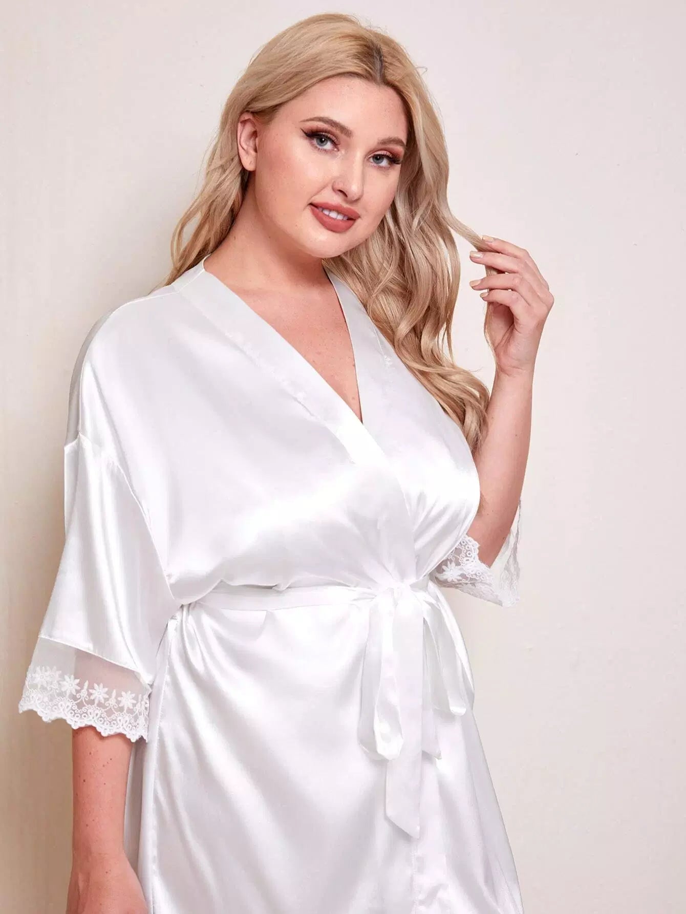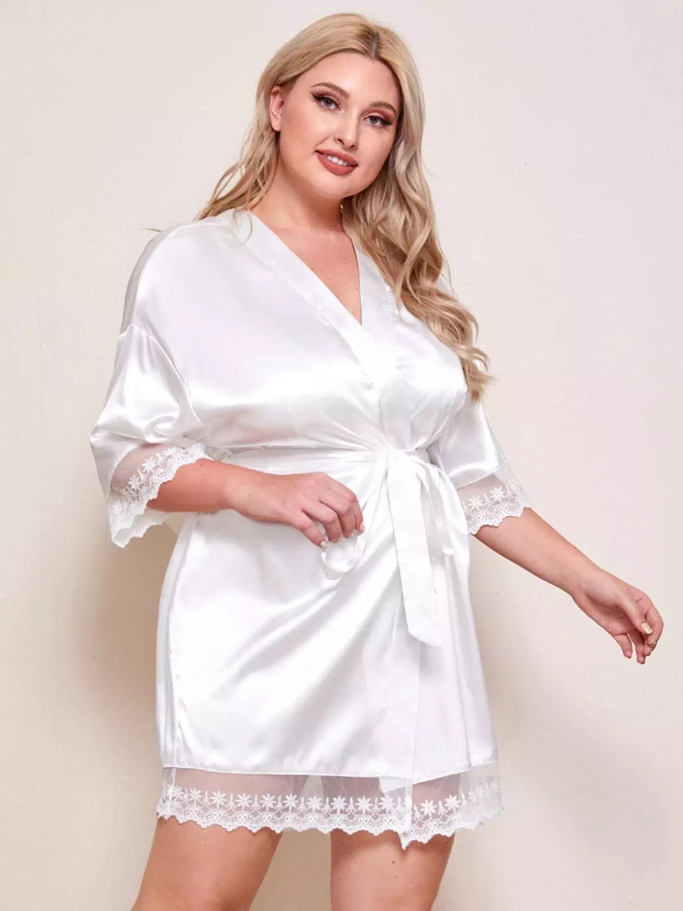 بالإضافة إلى رداء ساتان بحافة شبكية مطرزة بدون حزام