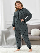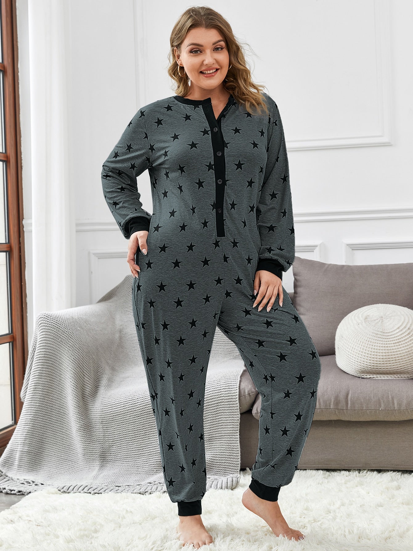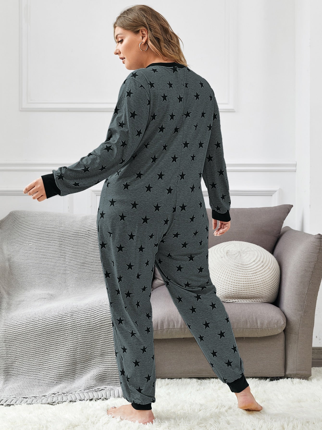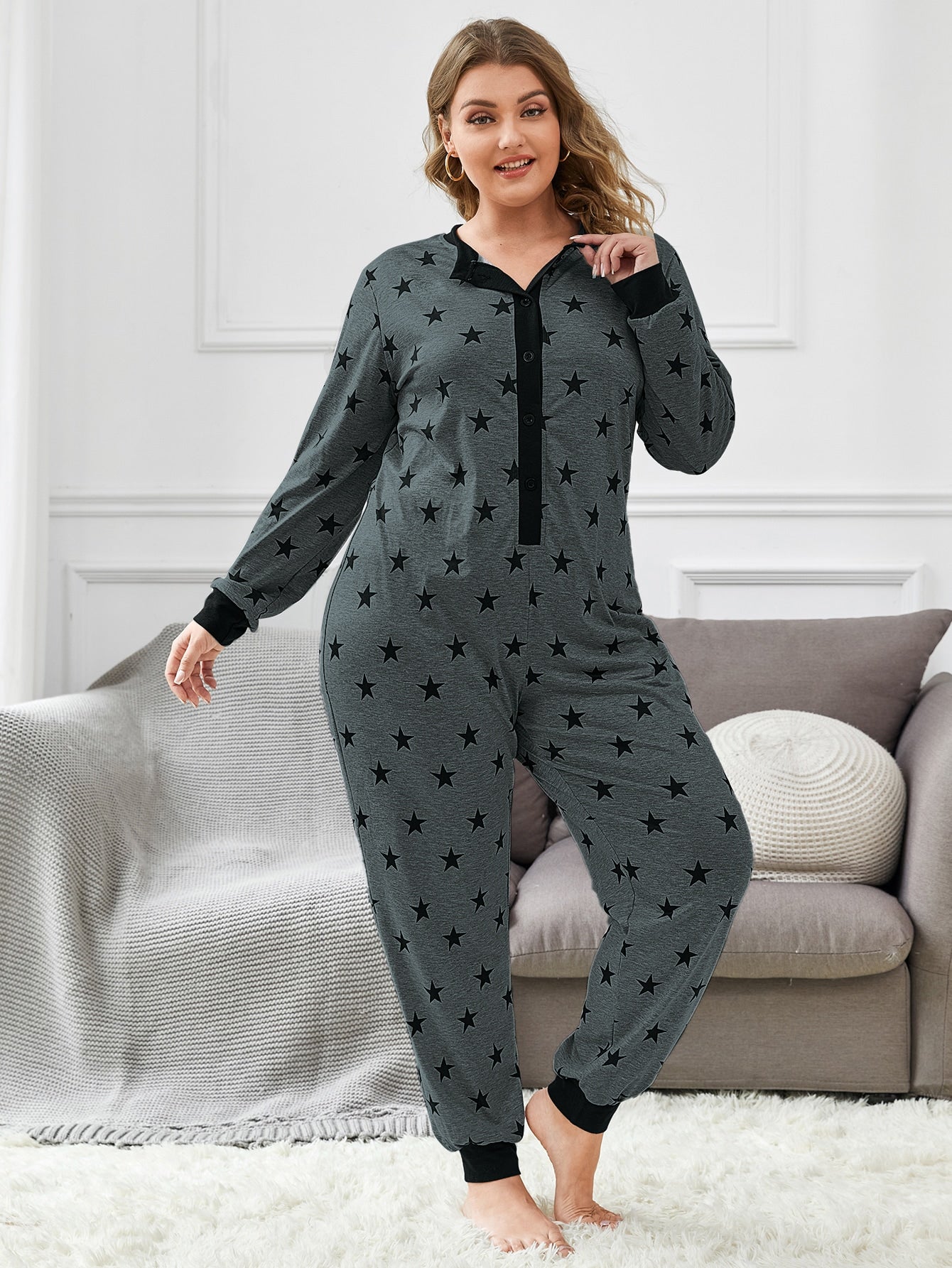 Plus Allover Star Print Button Front Sleep Jumpsuit