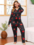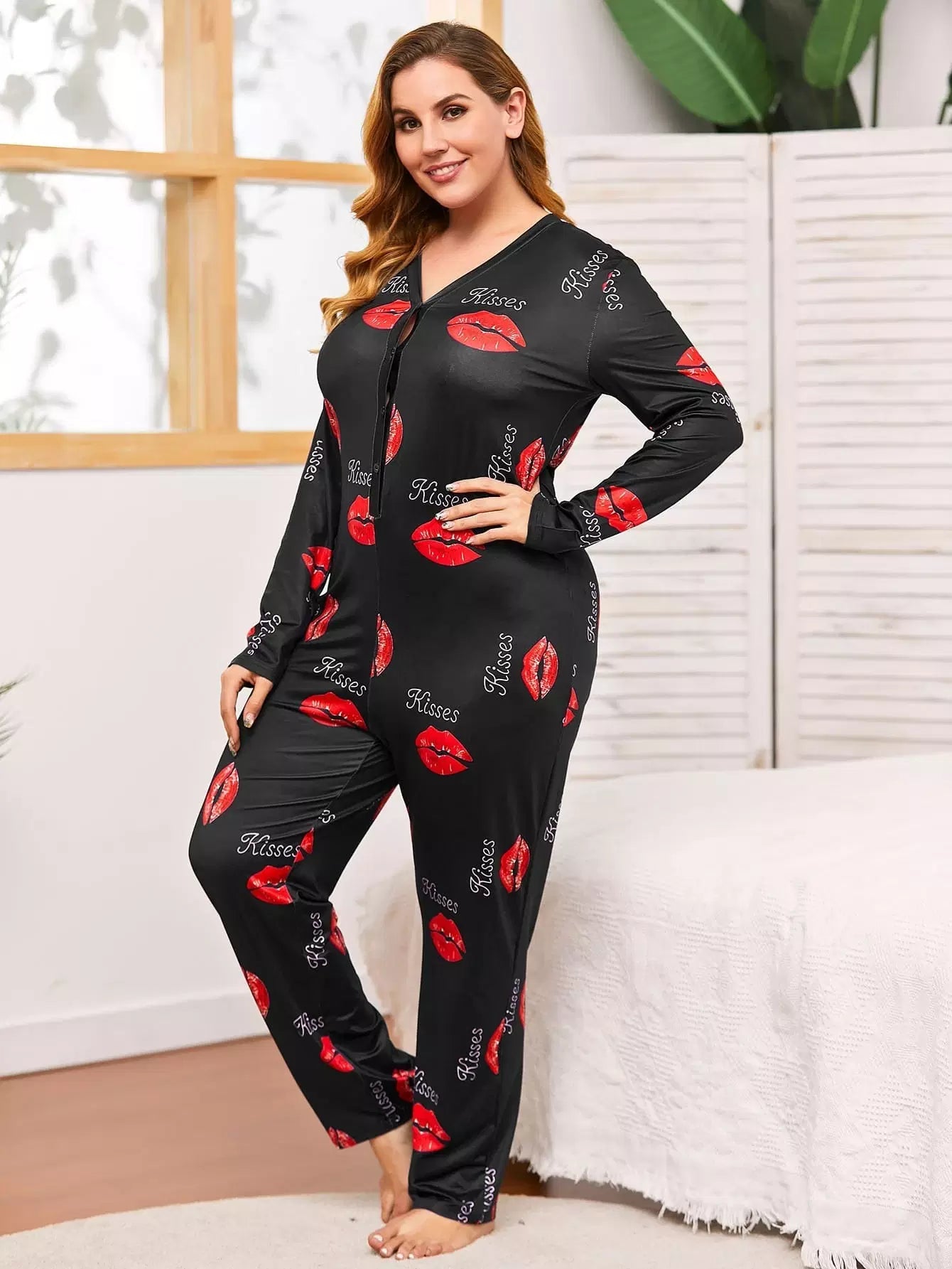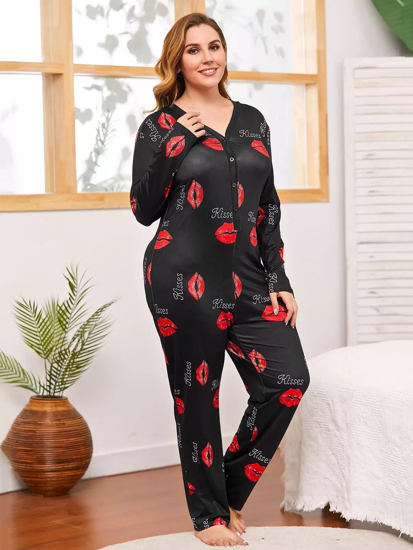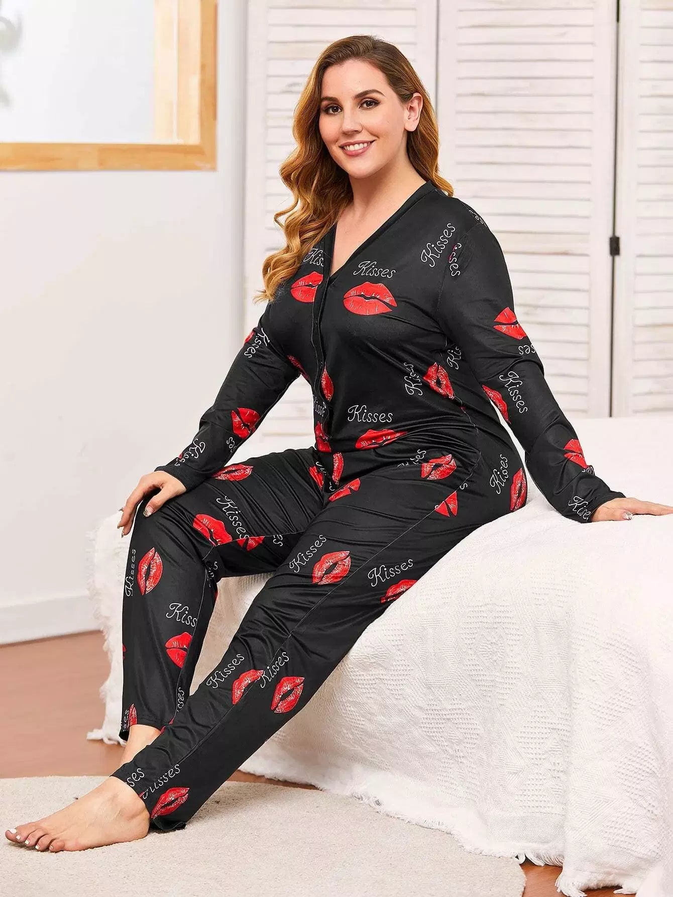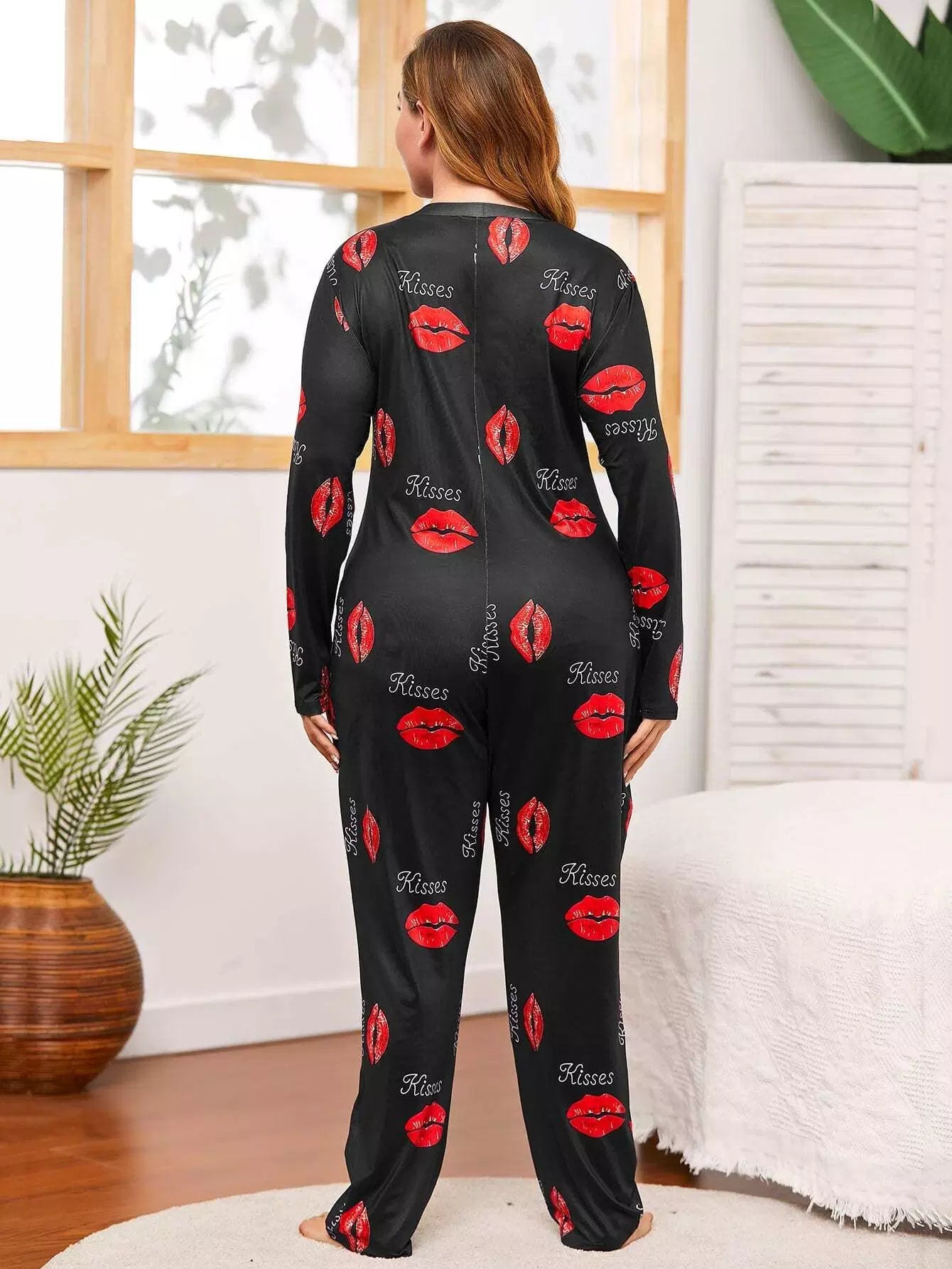 جمبسوت نوم بأزرار أمامية برسومات شفاه وحروف زائد