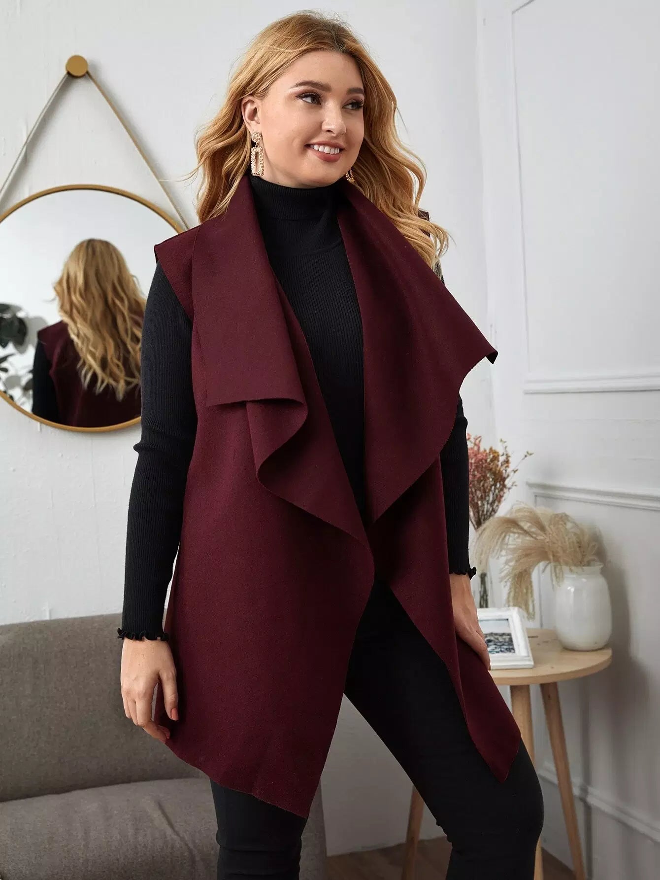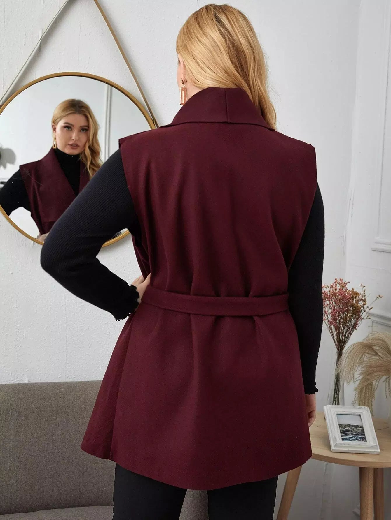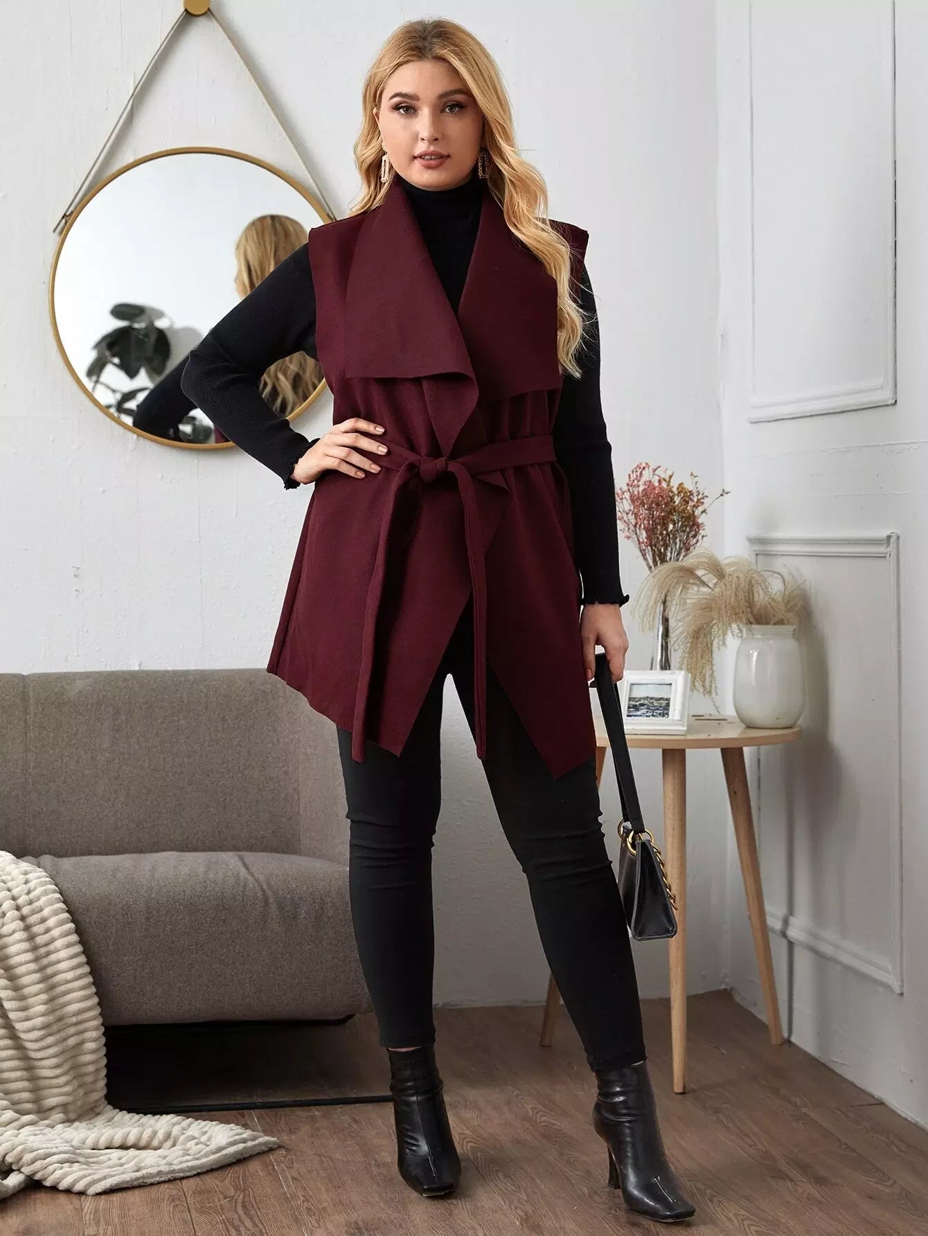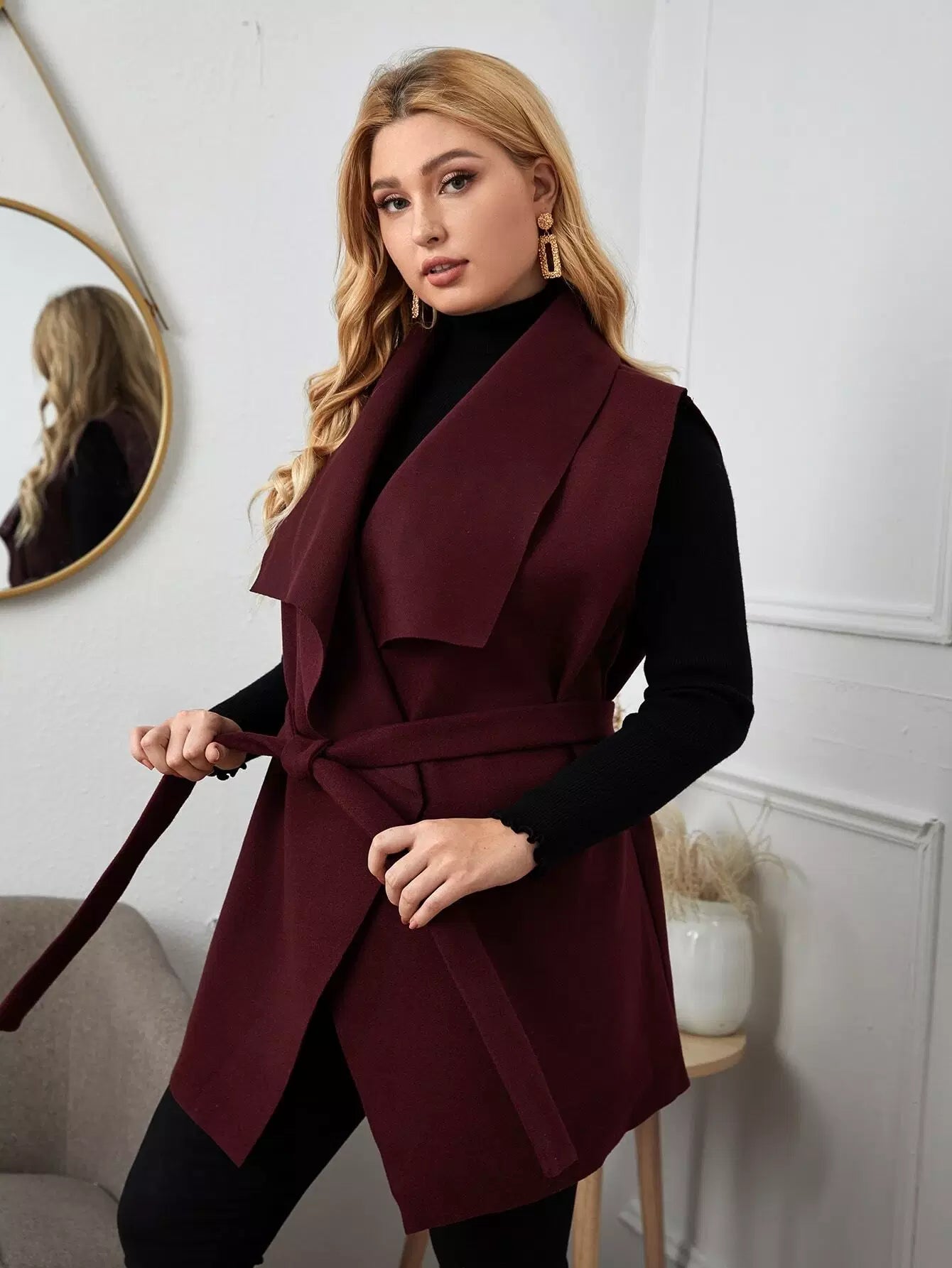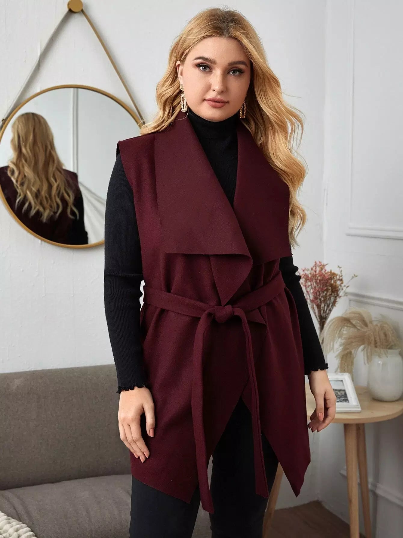 نحيف - مقاس كبير سترة طويلة بحزام وثنى أمامي