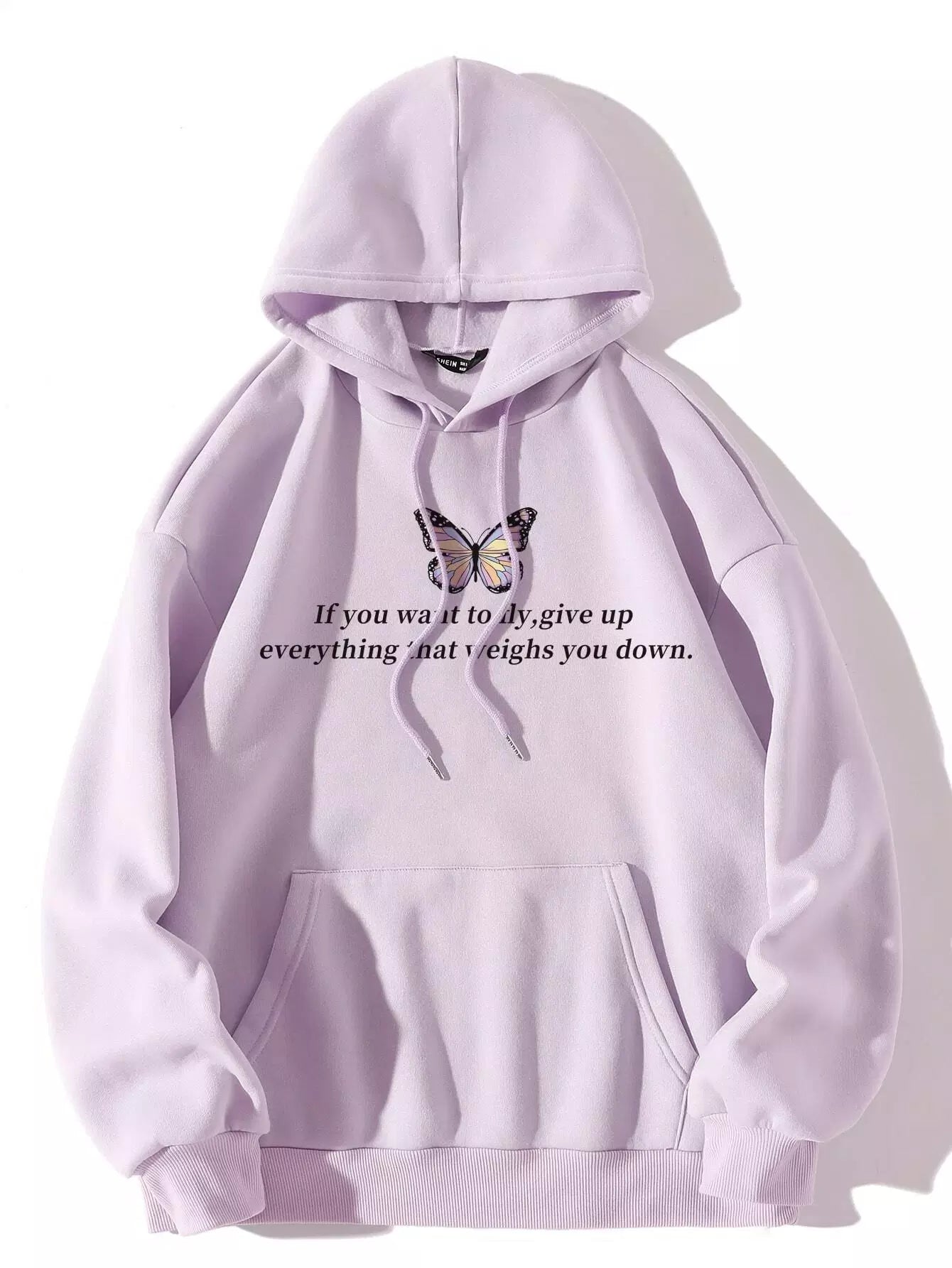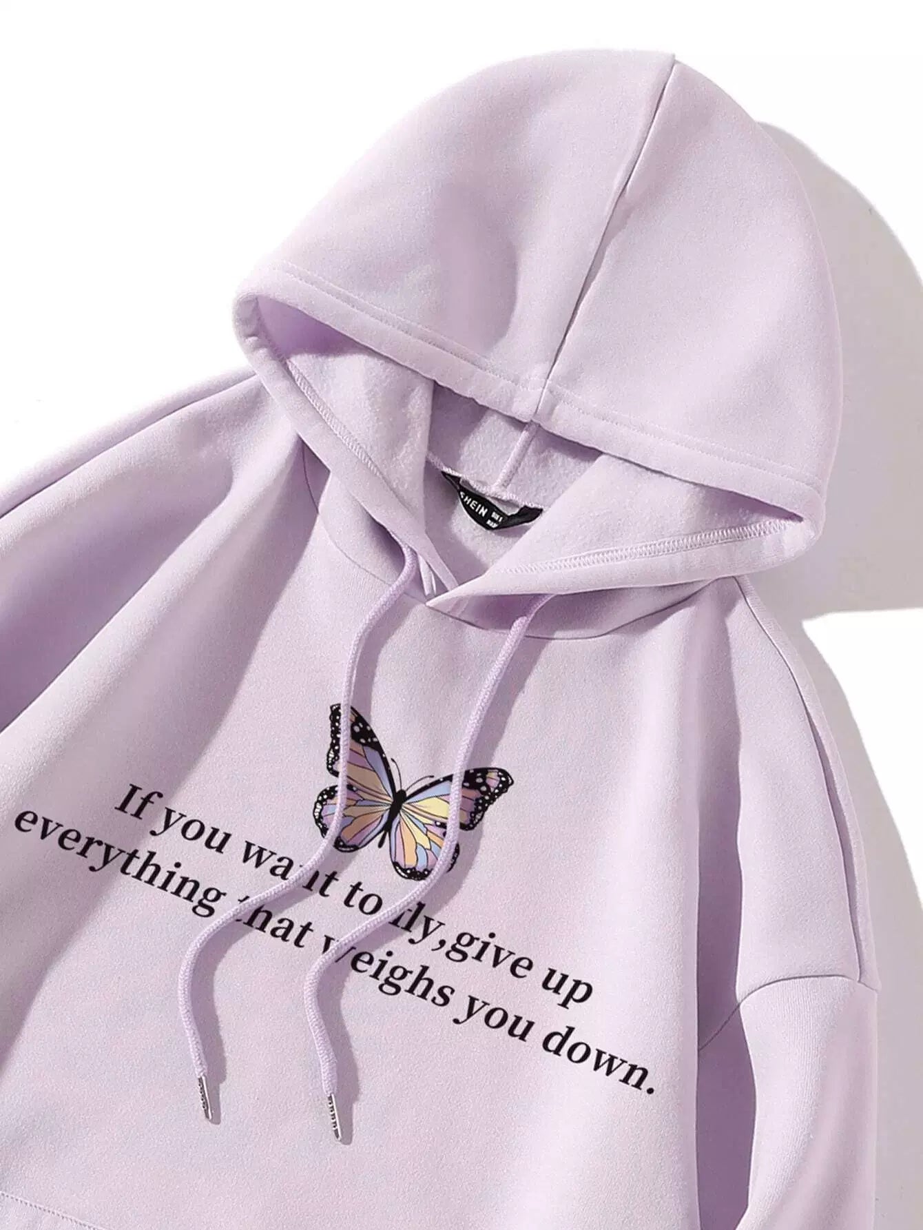هودي بقبعة برباط بجيب كانجارو برسومات فراشة وشعار زائد
