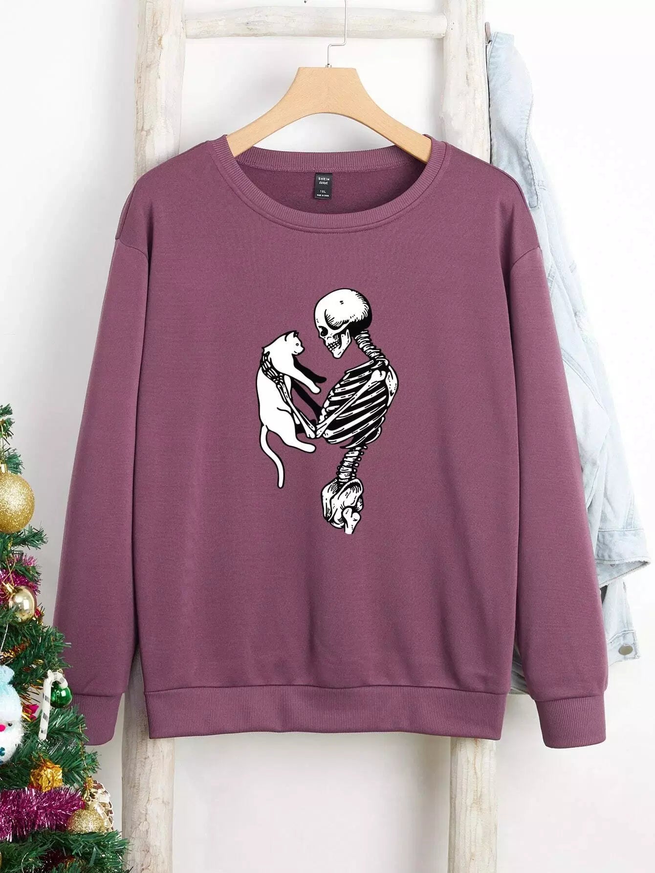 كنزة صوفية حرارية مبطنة بطبعة قطة وهيكل عظمي بلس