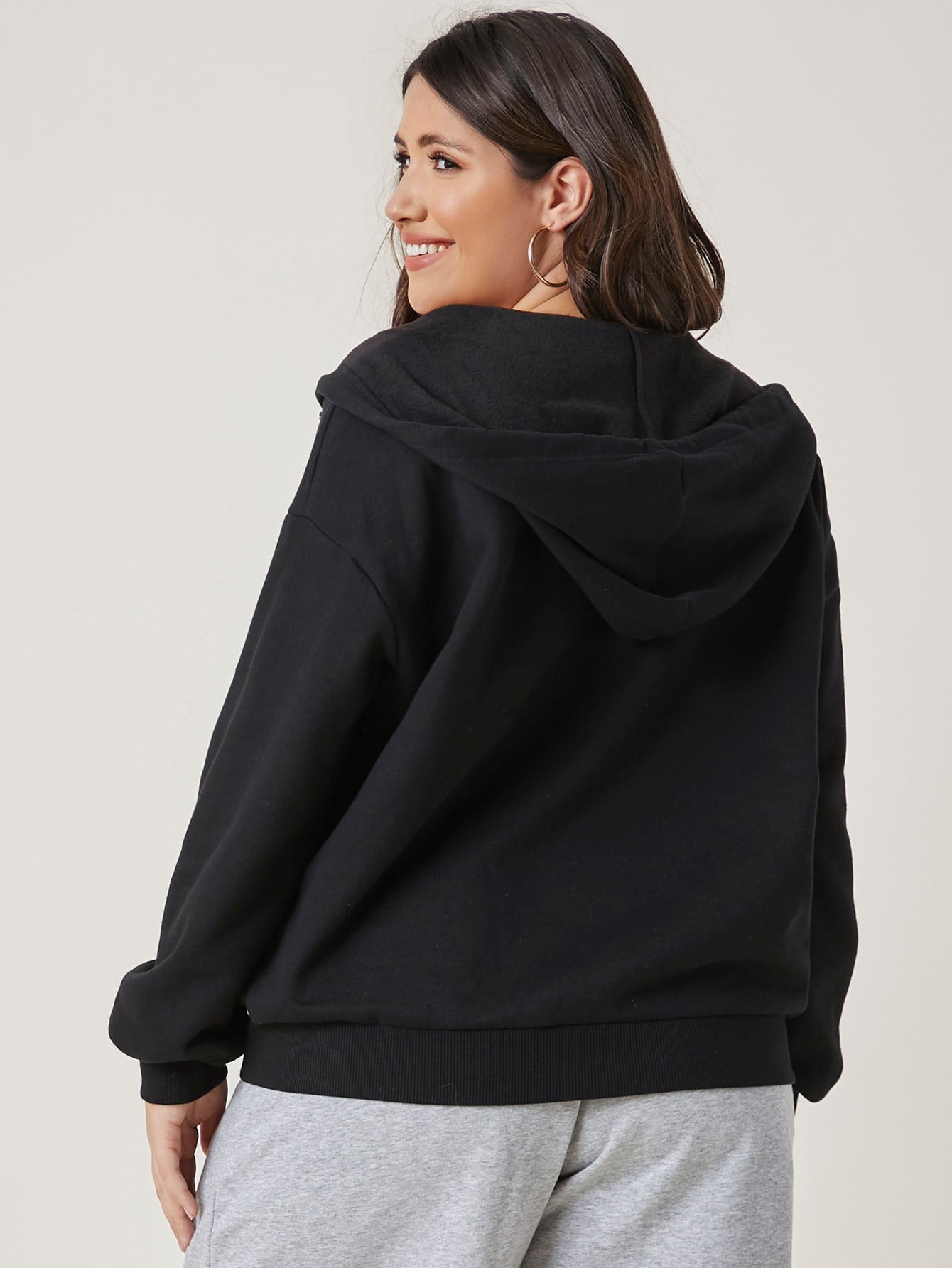 Plus Cotton Drop Shoulder Zipper Placket Drawstring Hooded Sweatshirt