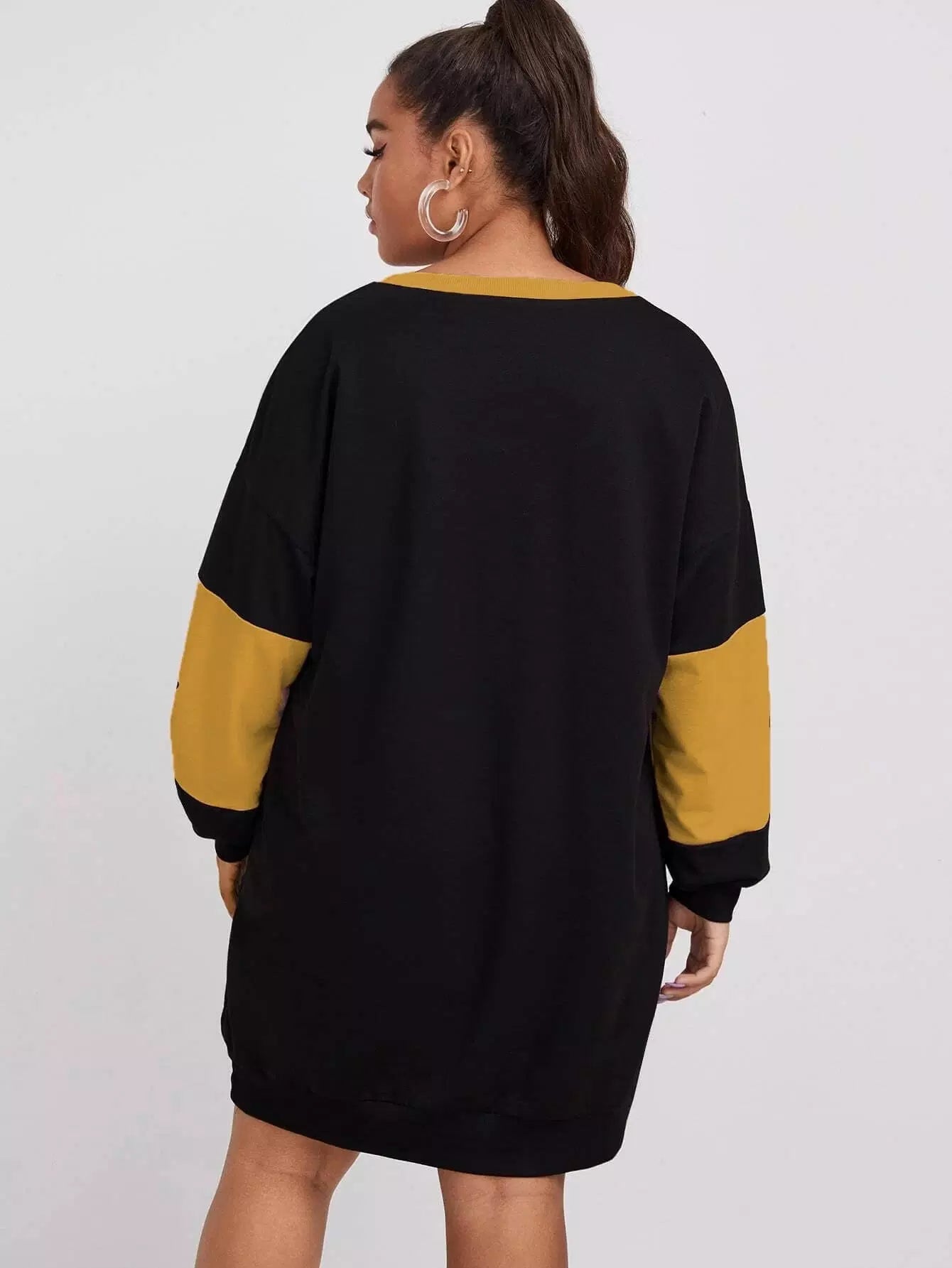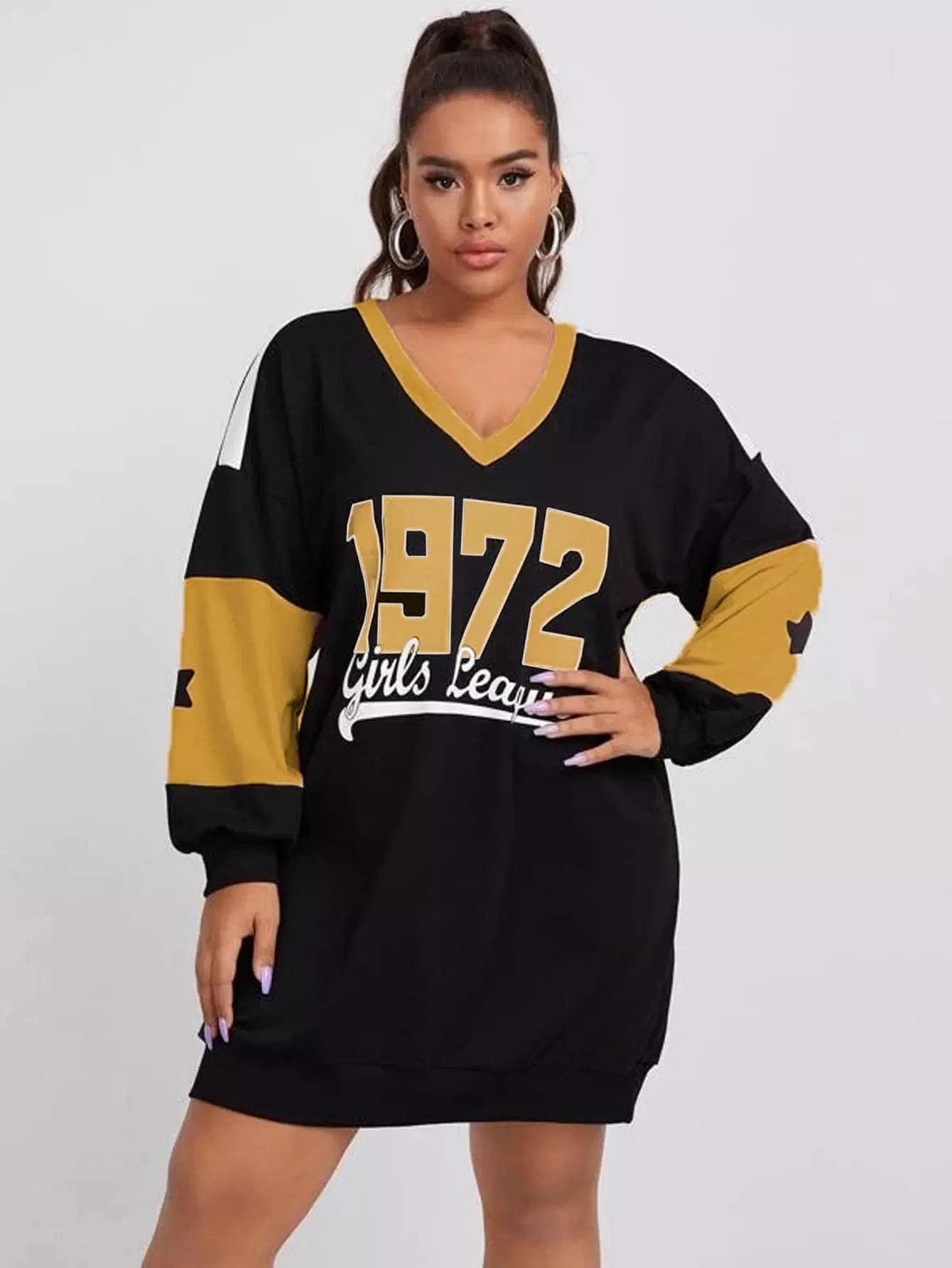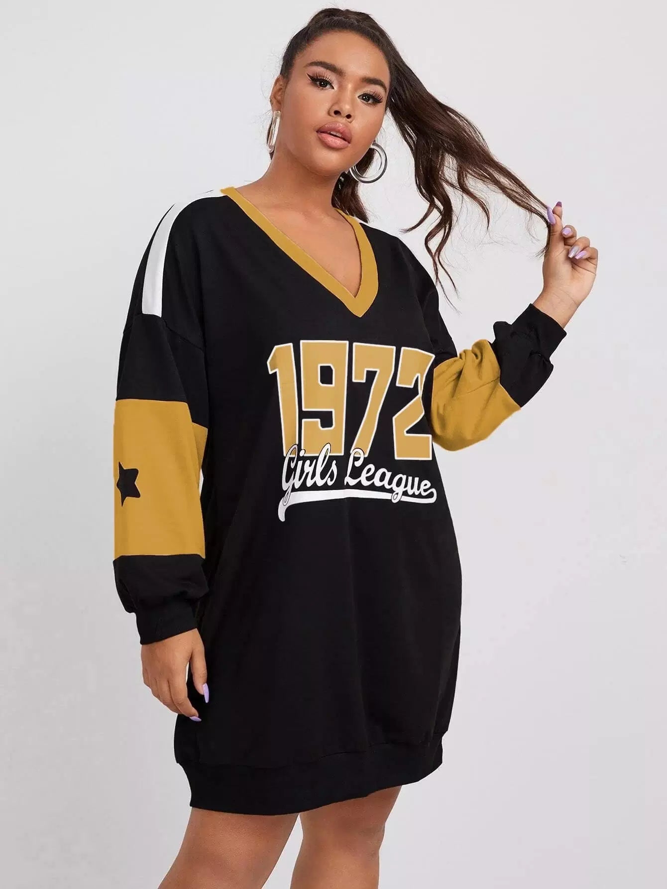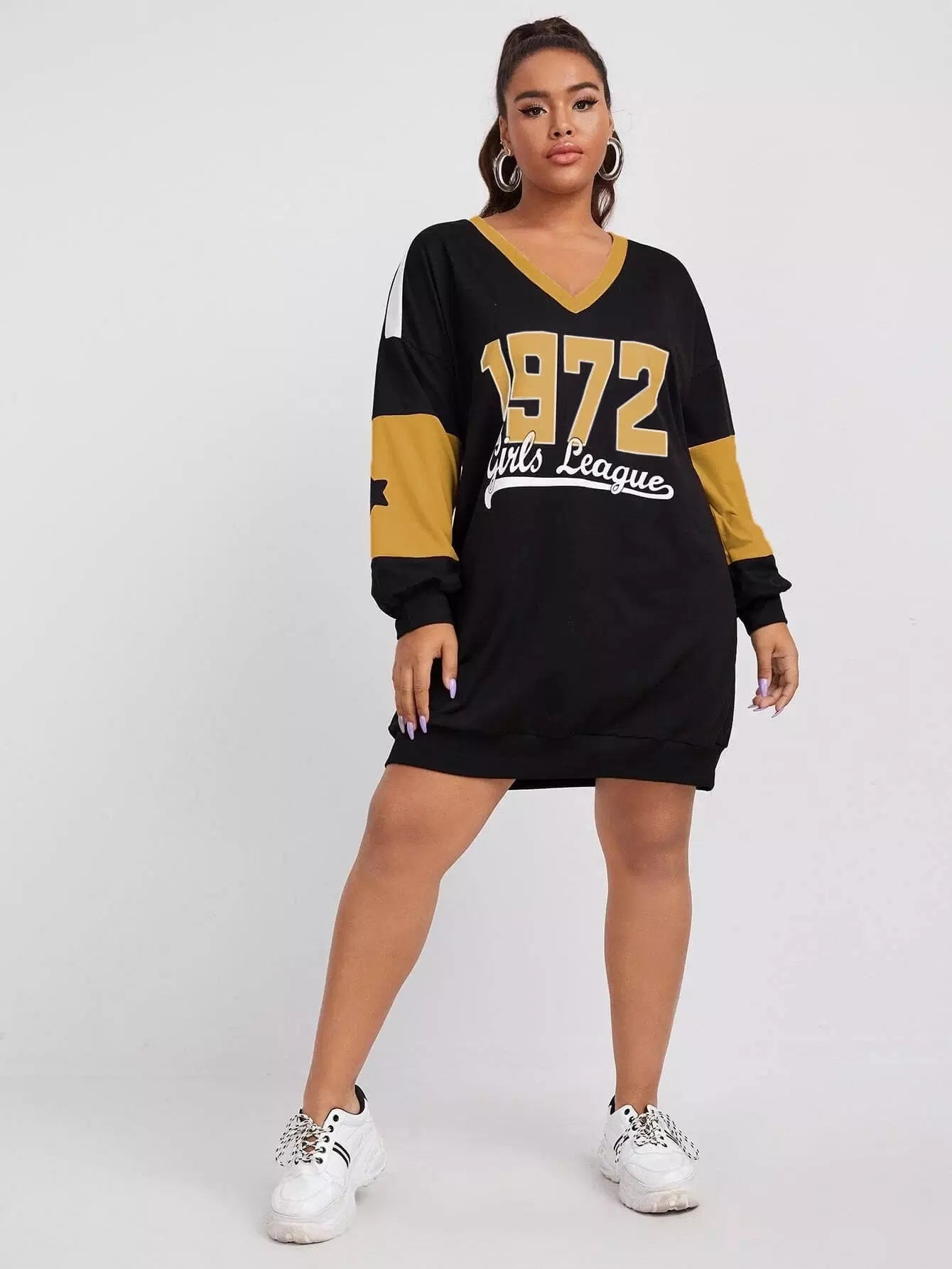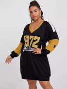 فستان سويت شيرت منسدل الأكتاف برسومات على الأكتاف زائد