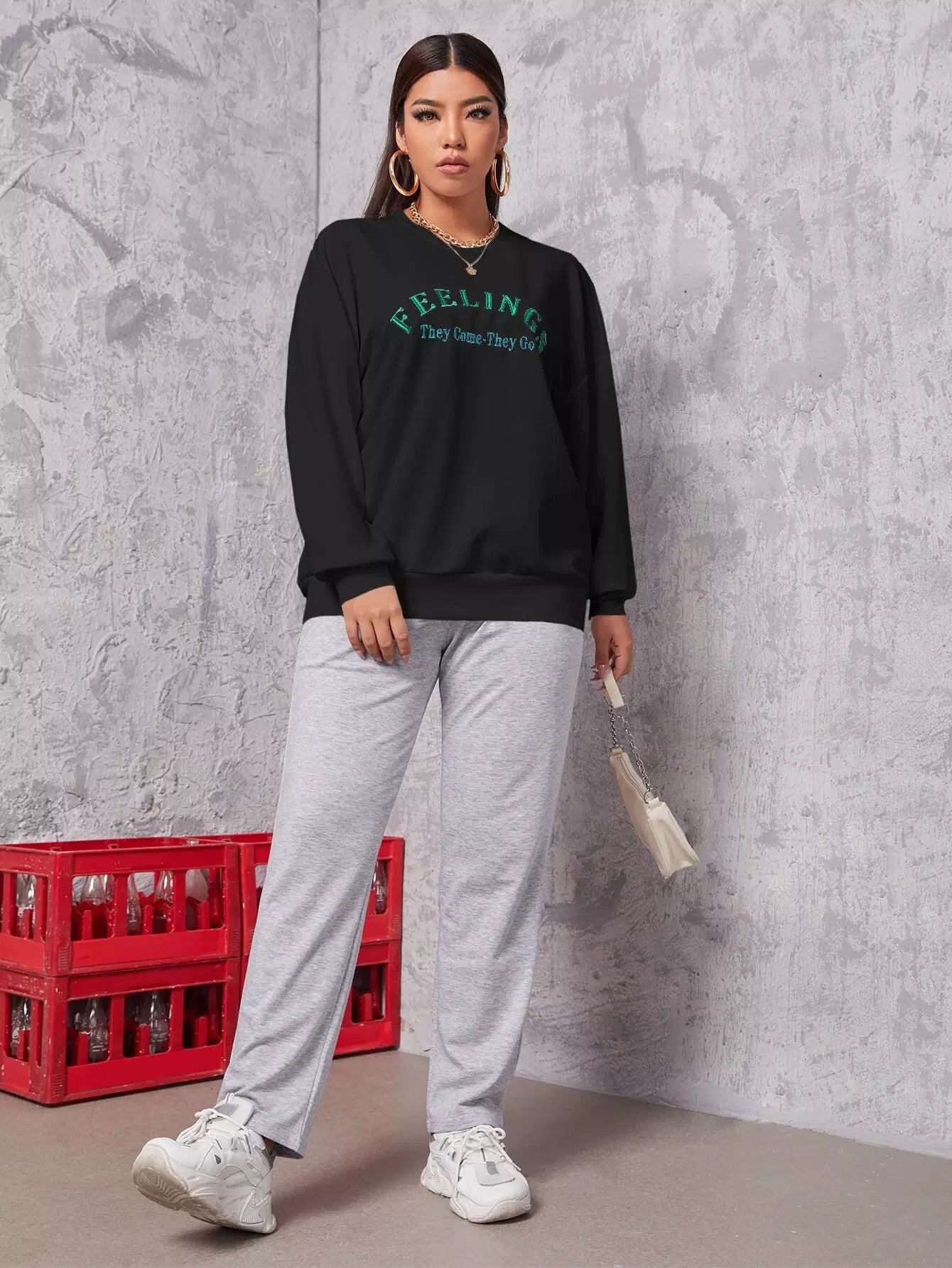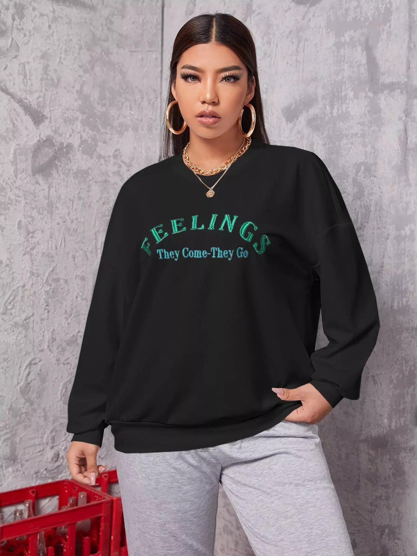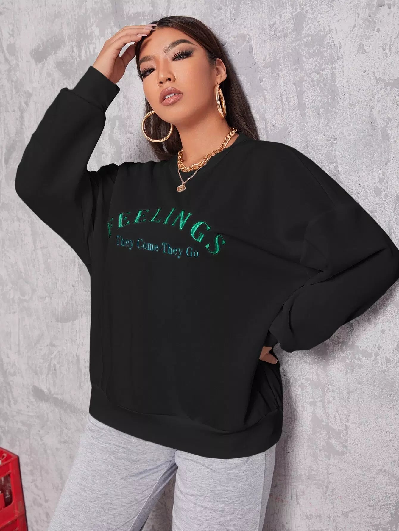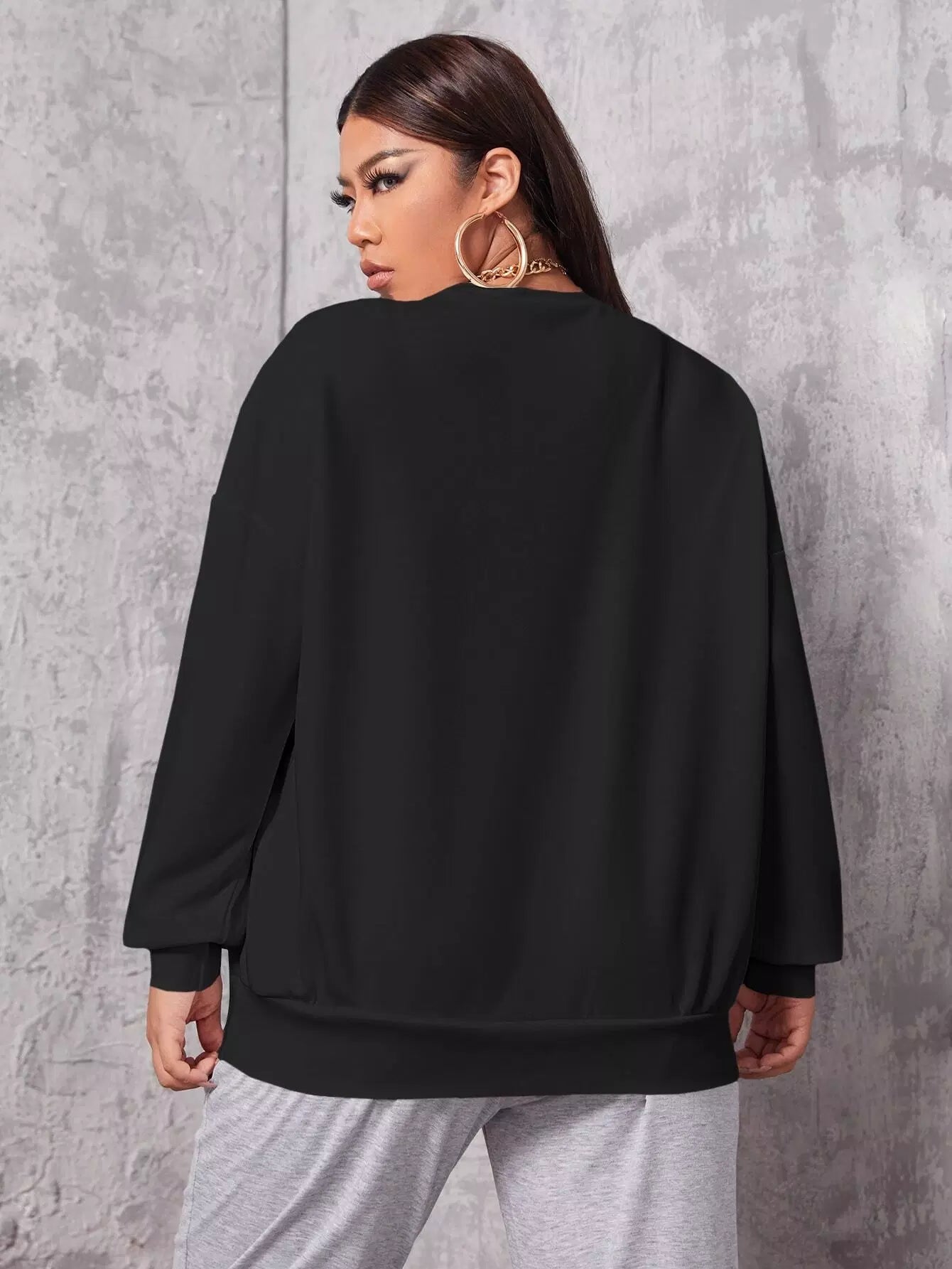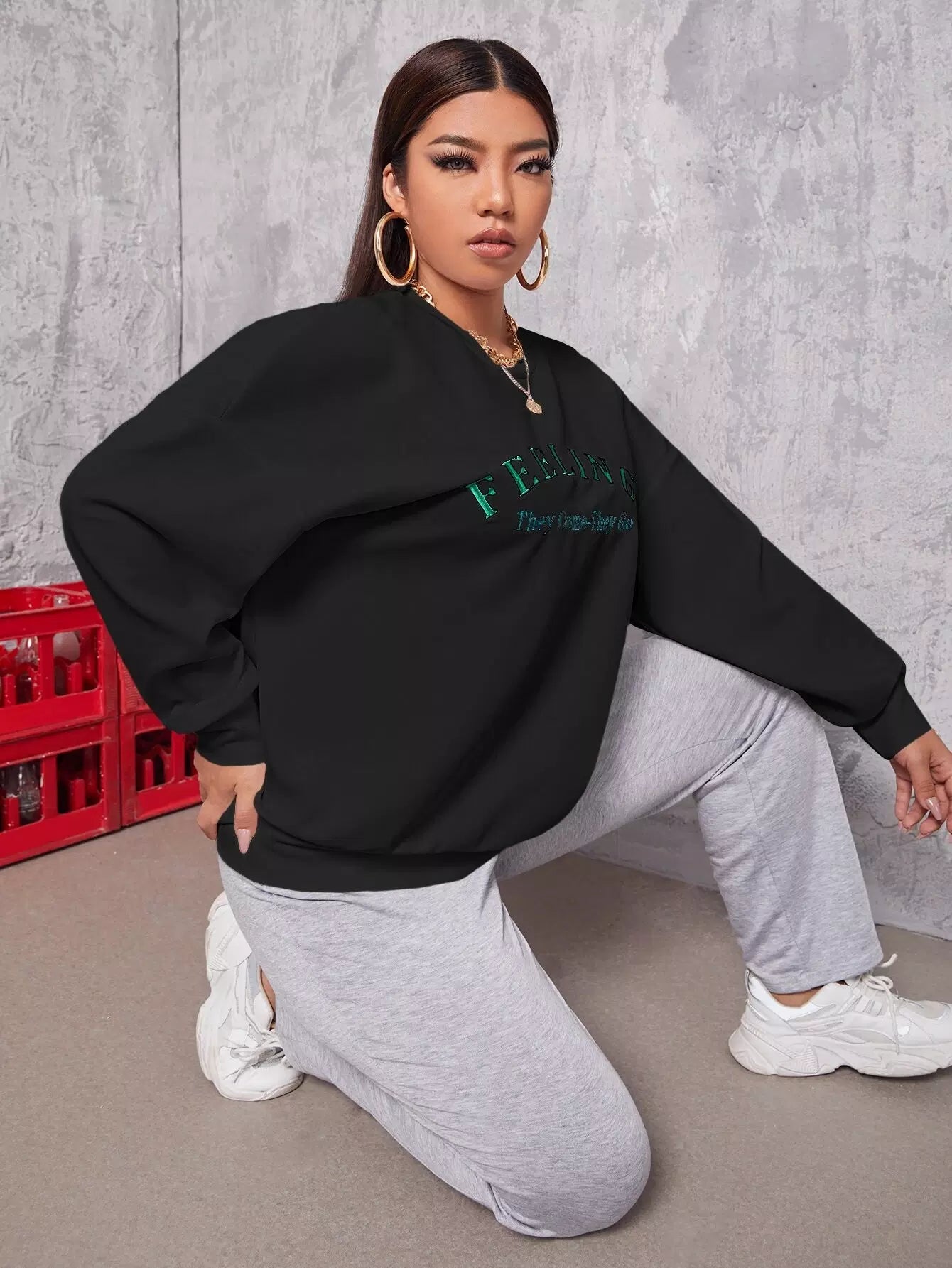 بلس سويت شيرت منسدل الكتف مطرز بحروف زائد