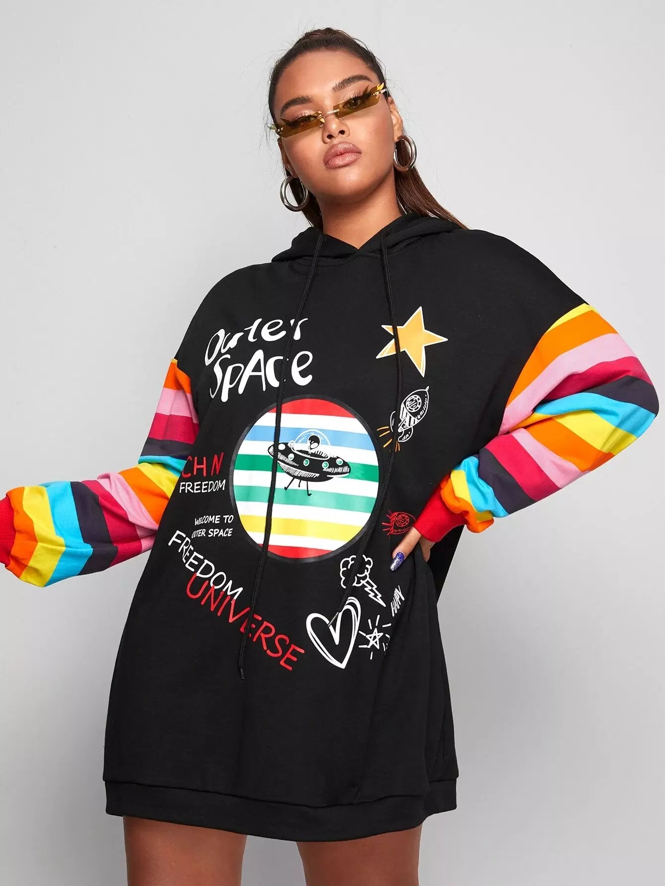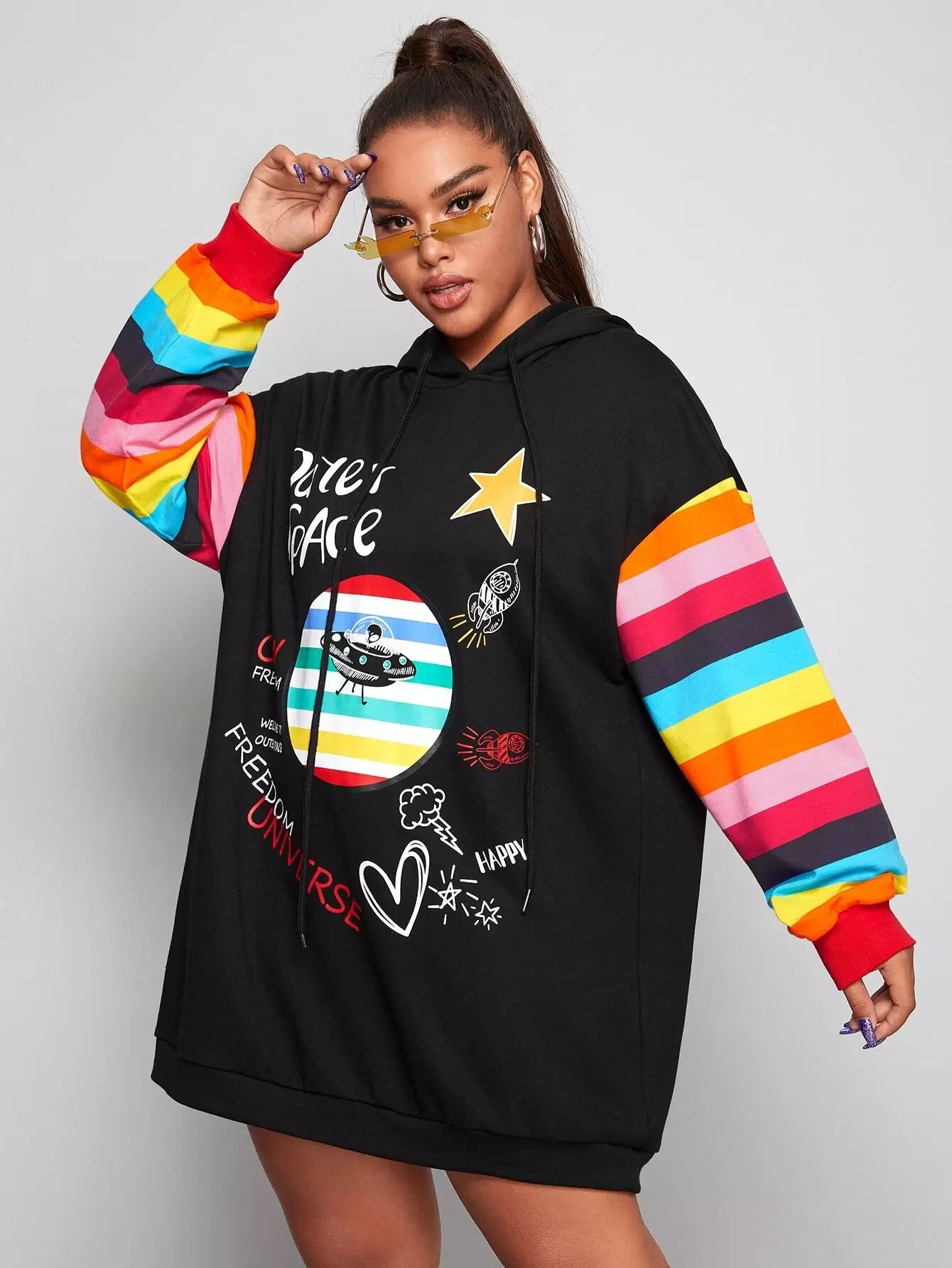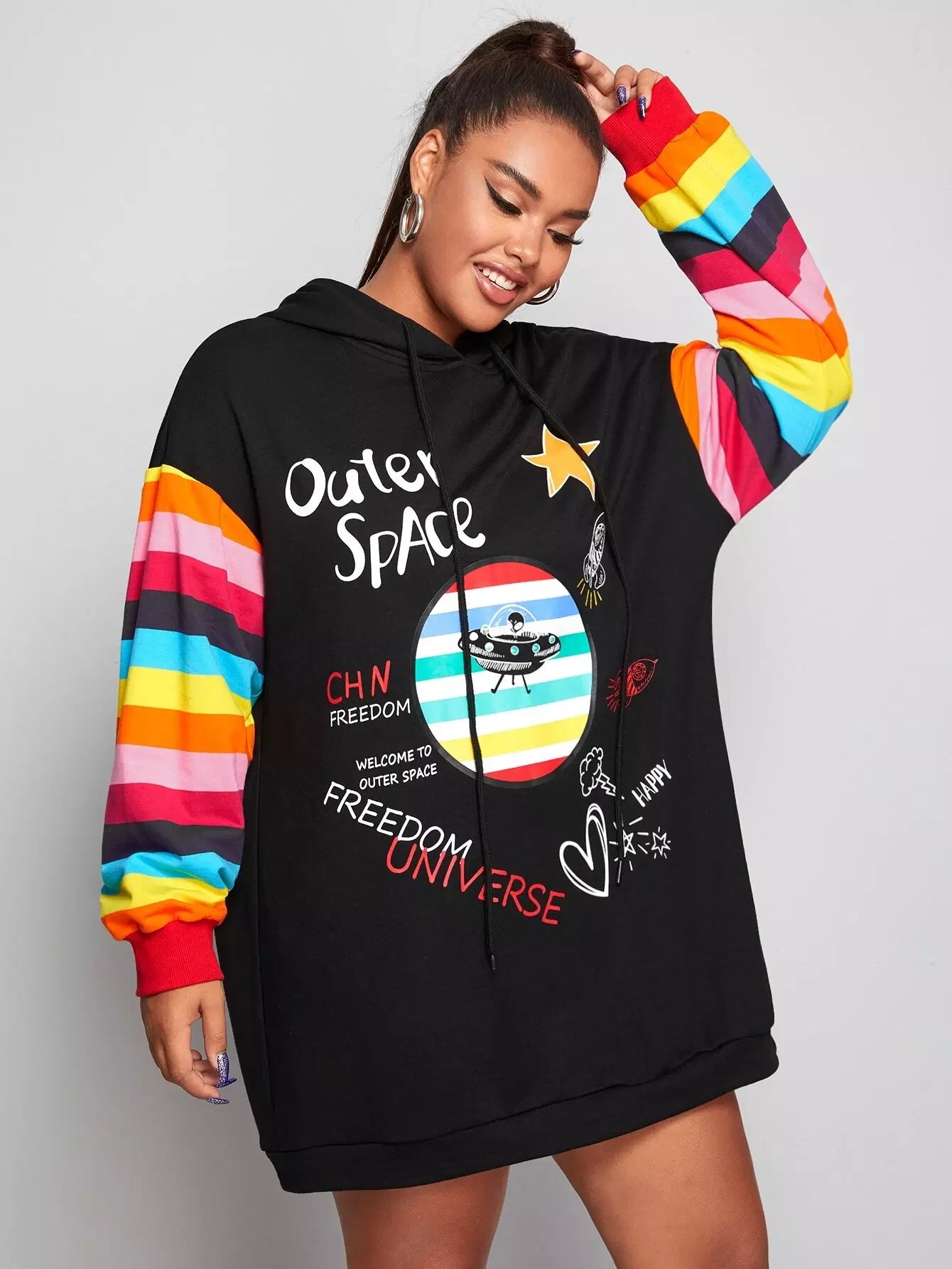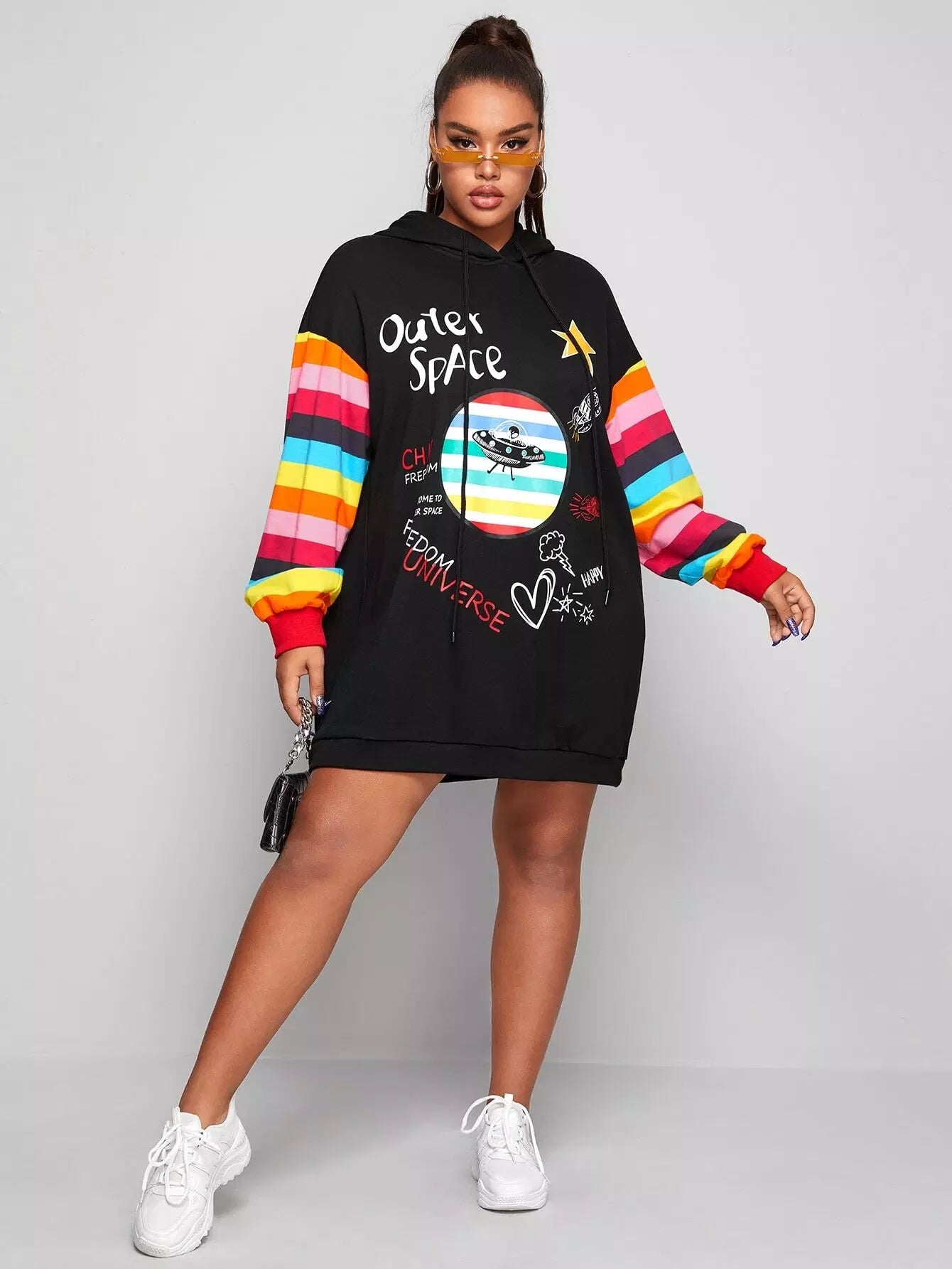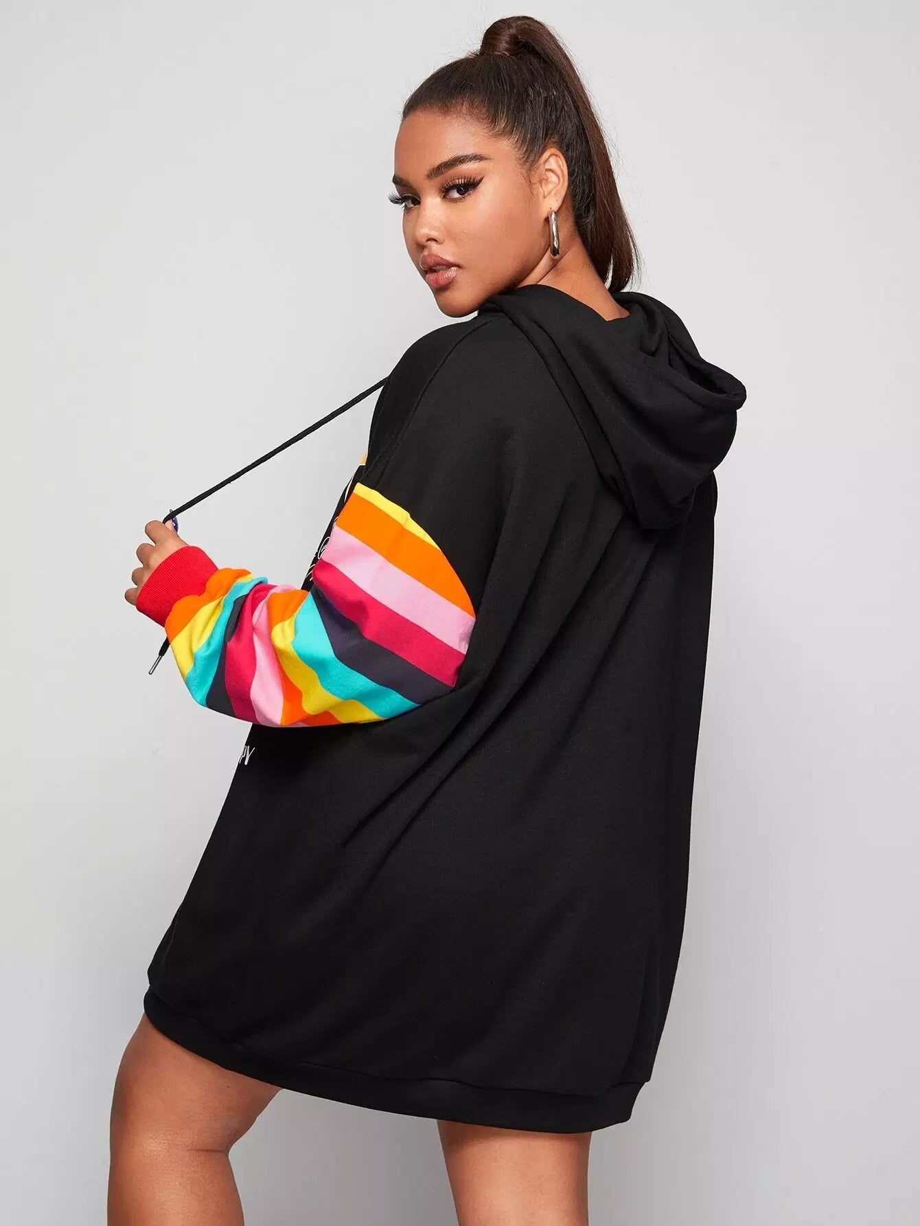 نحيف - مقاس كبير فستان بقلنسوة بأكمام مخططة بألوان قوس قزح مختلط