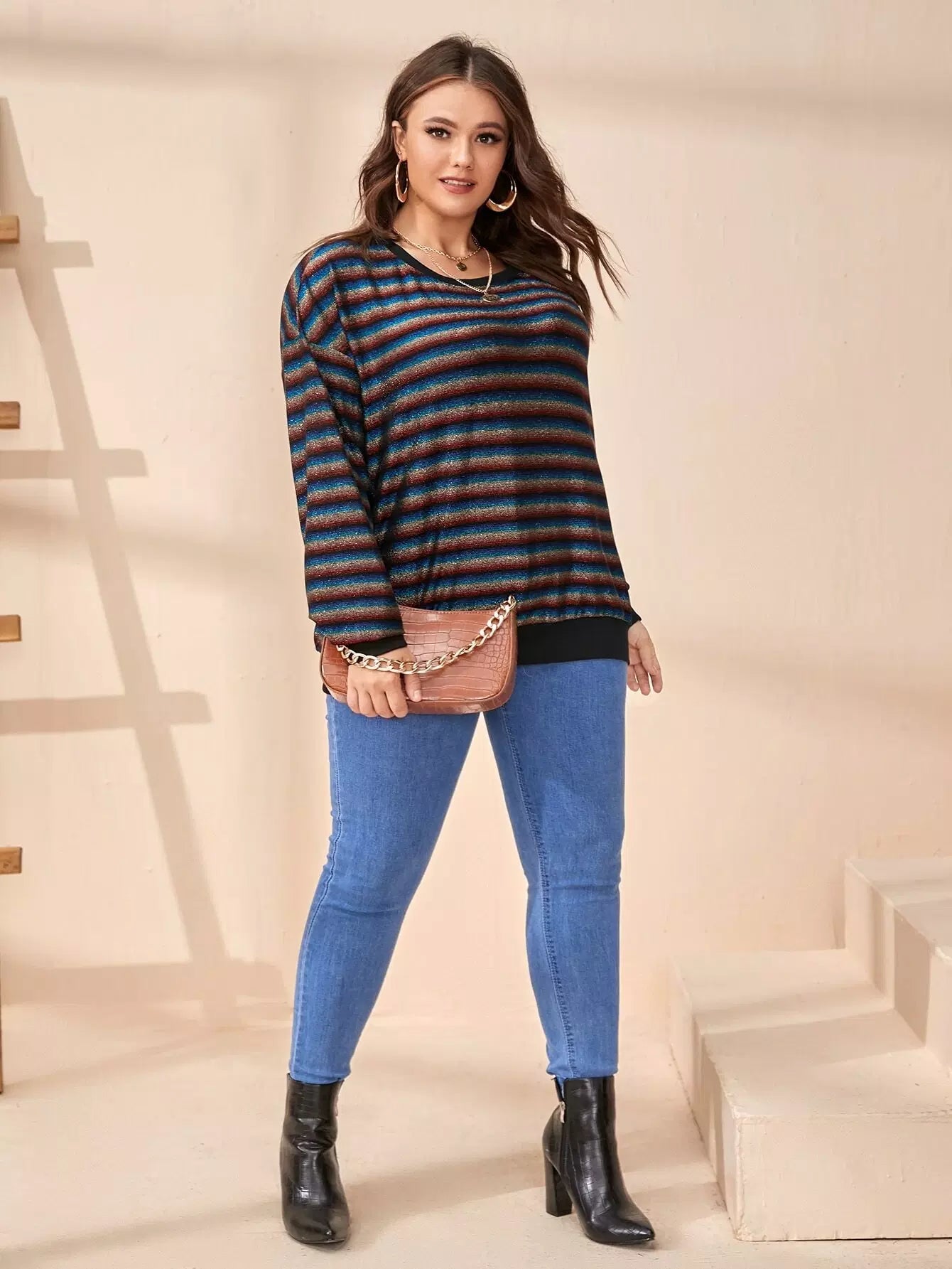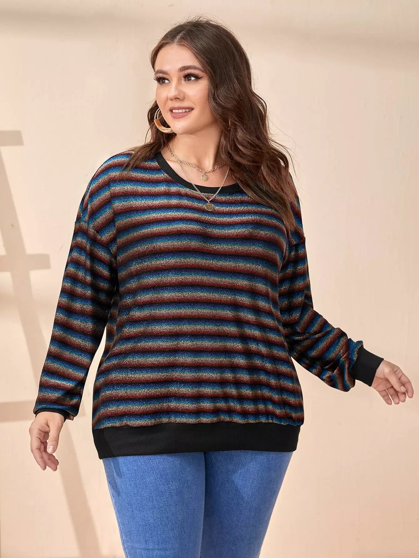 سويت شيرت سويت شيرت مخطط منسدل الكتف زائد