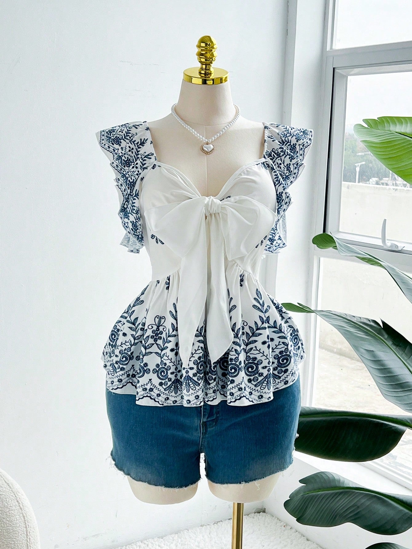 women Ceyna Plus Size Women's Tie Knot Front A-Line Shirt With Cap Sleeves
