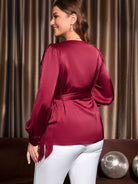 EMERY ROSE Plus Lantern Sleeve Knot Side Wrap Satin Blouse