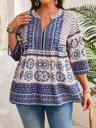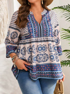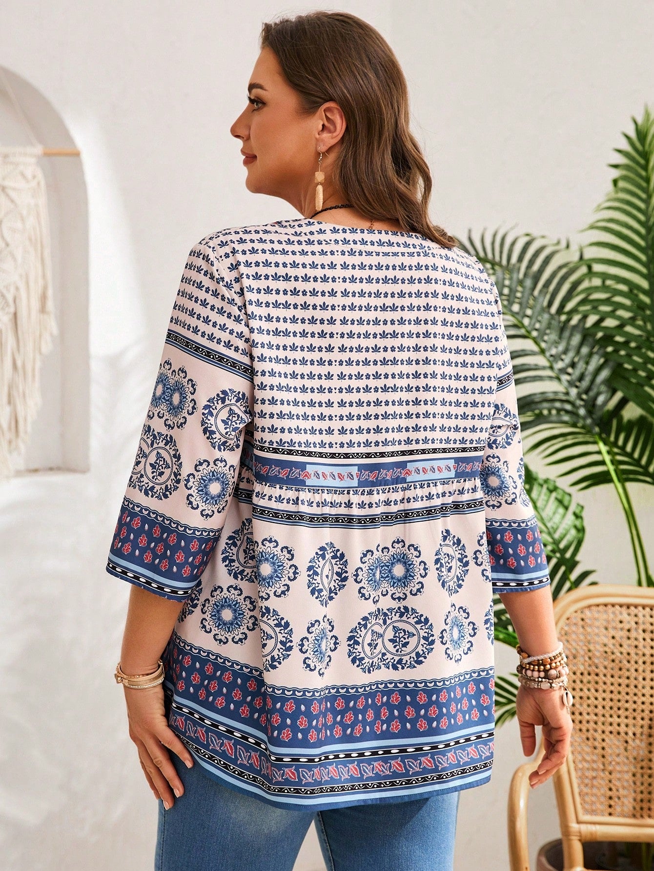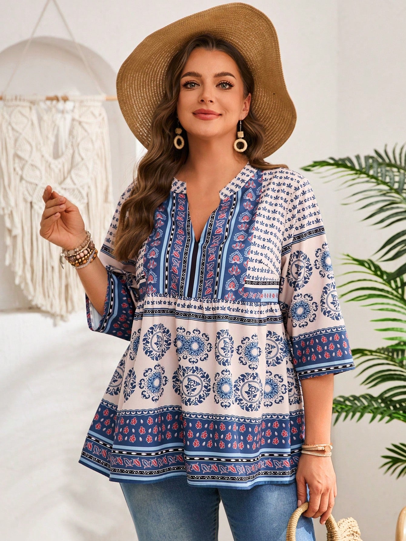 EMERY ROSE Plus Size V-Neck Patchwork Print Simple Casual Shirt,Vacation Outfits Woman,Summer Clothes