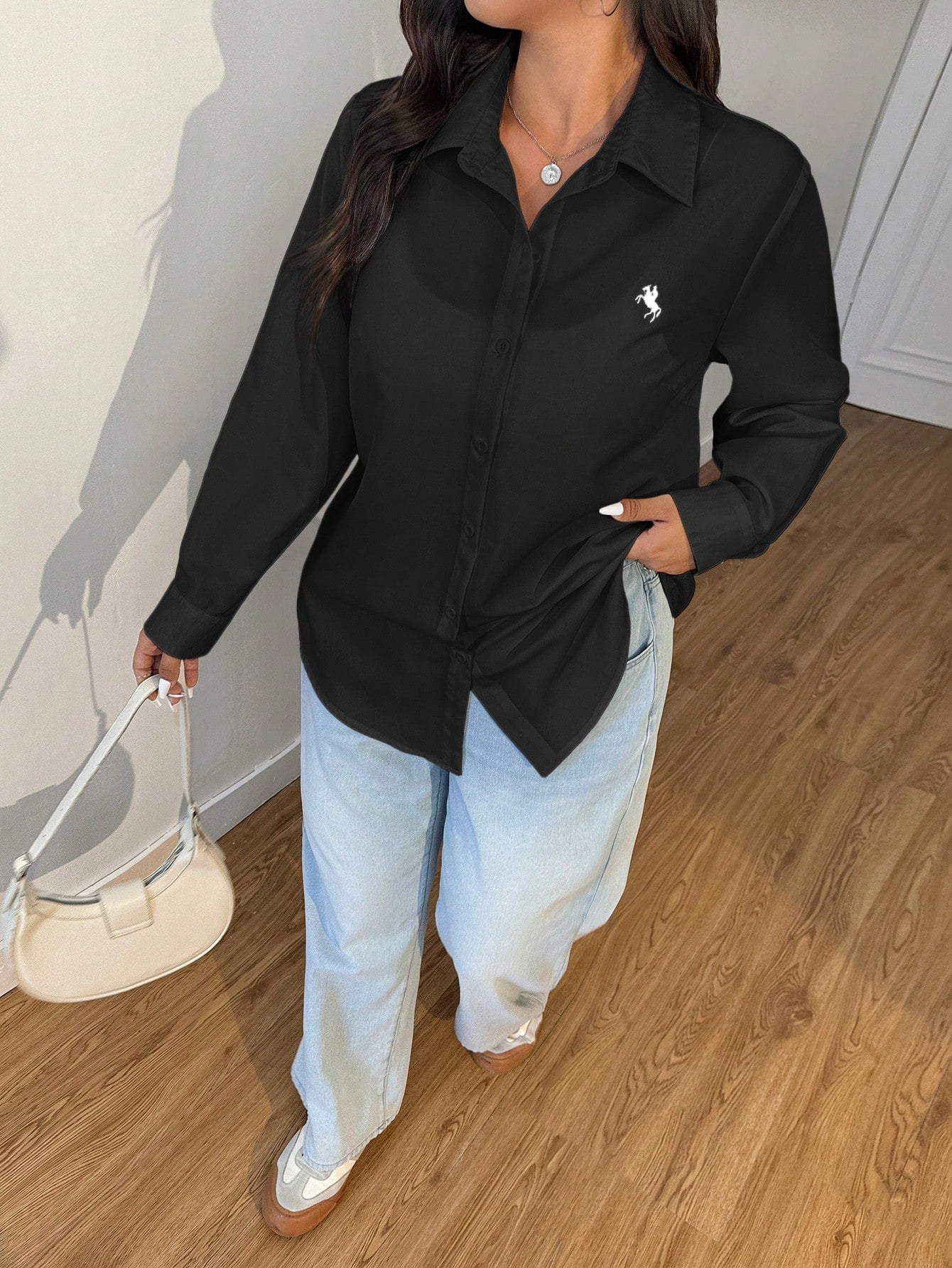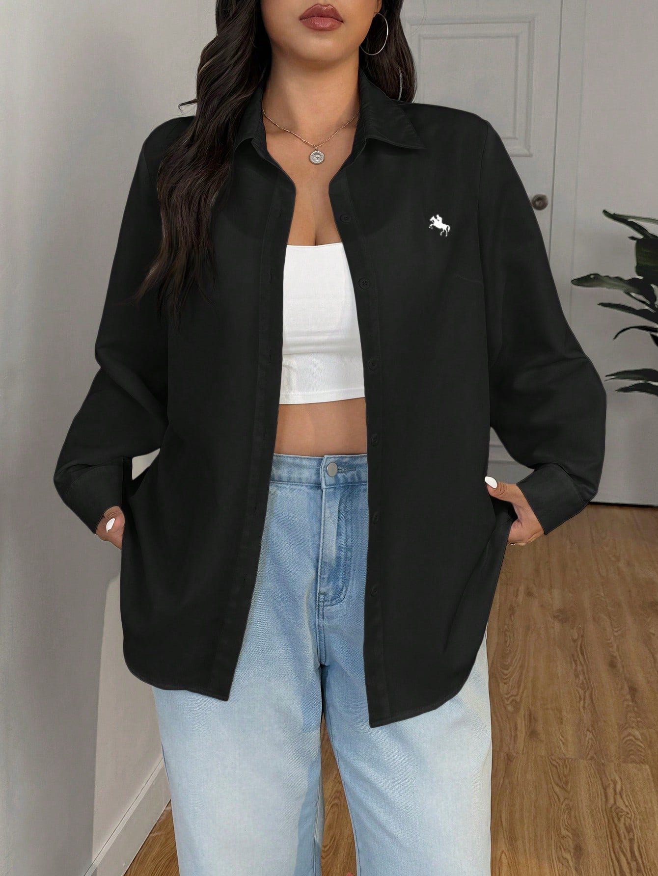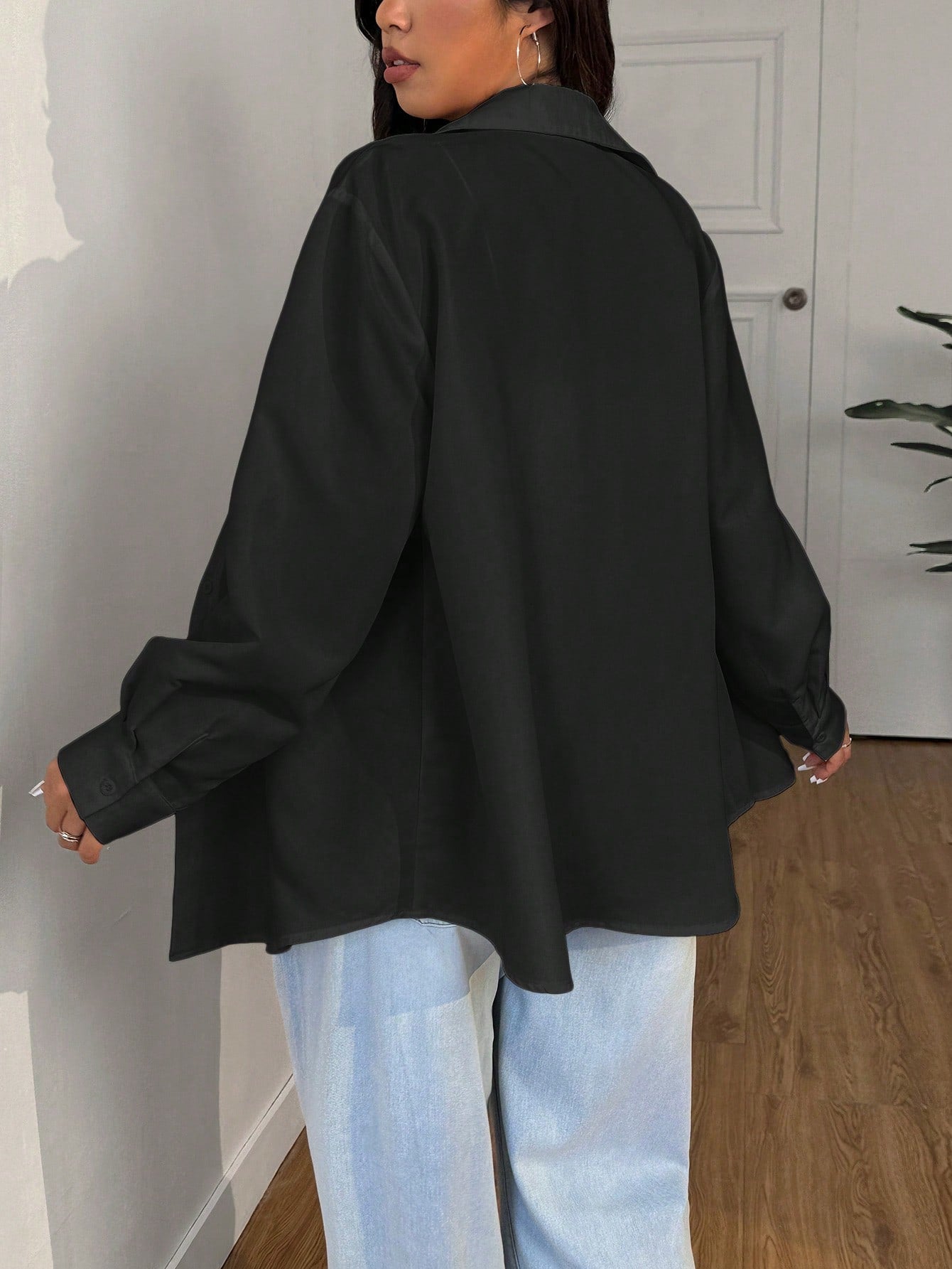 بلوزة سوداء بسيطة وعملية بمقاسات كبيرة من إيزي وير، مناسبة لفصلي الربيع والصيف.