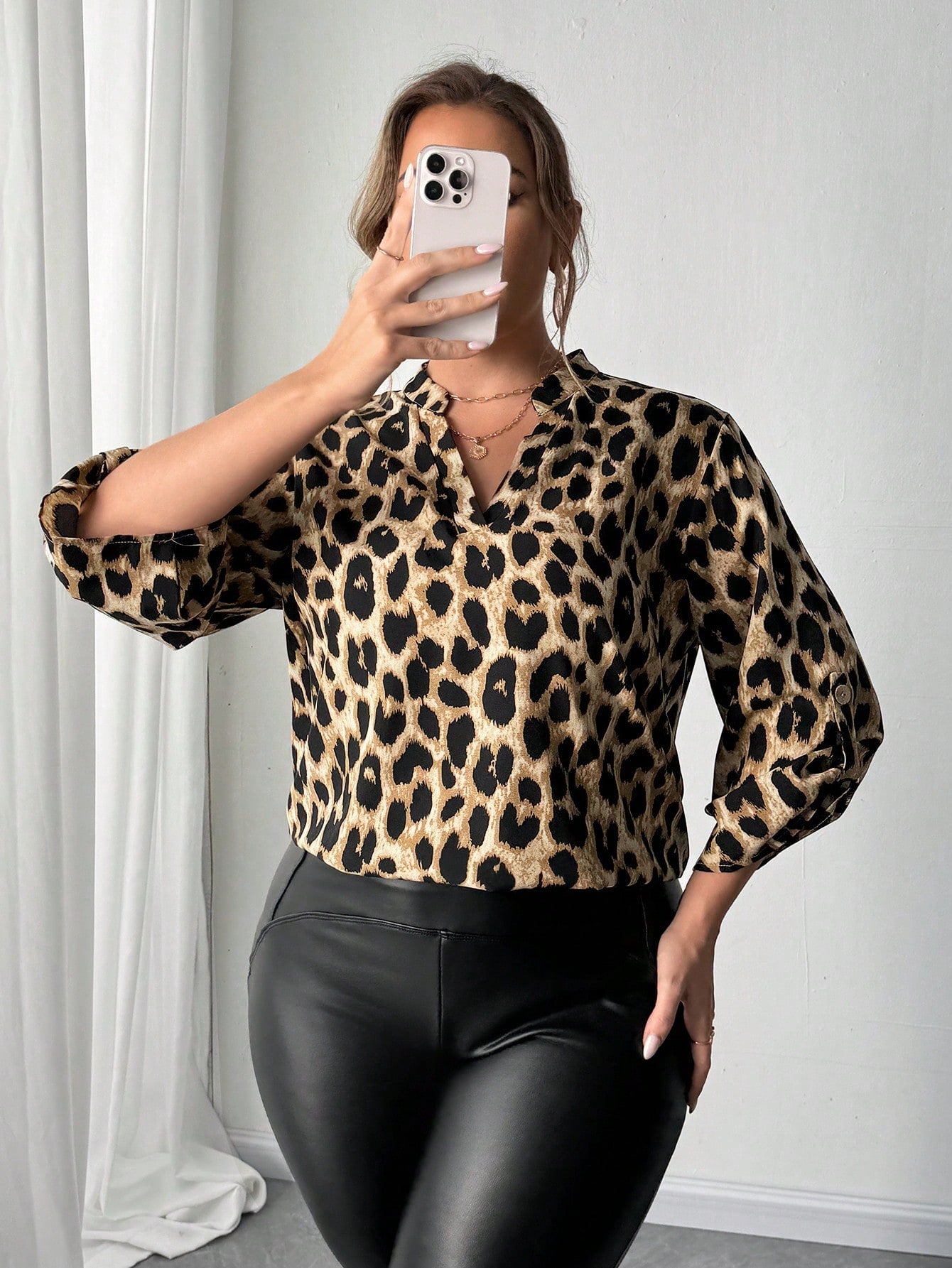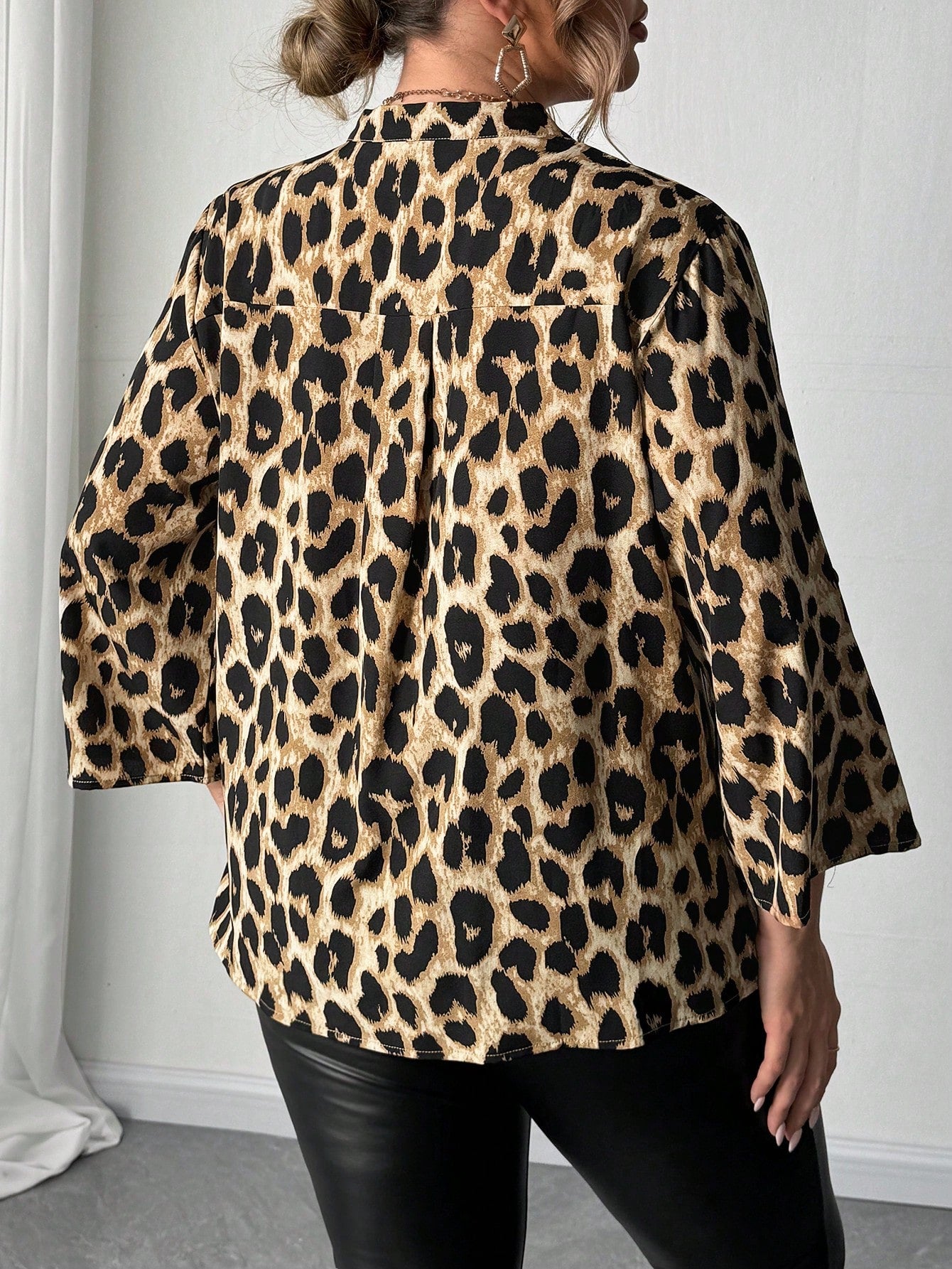 بلوزة فليرلا كاجوال بنقشة جلد النمر بأكمام طويلة ورقبة على شكل حرف V، مقاس كبير، للارتداء اليومي