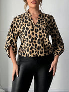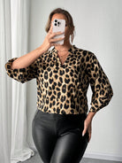 Flirla Plus Size V-Neck Long Sleeve Leopard Print Casual Top, Everyday Wear